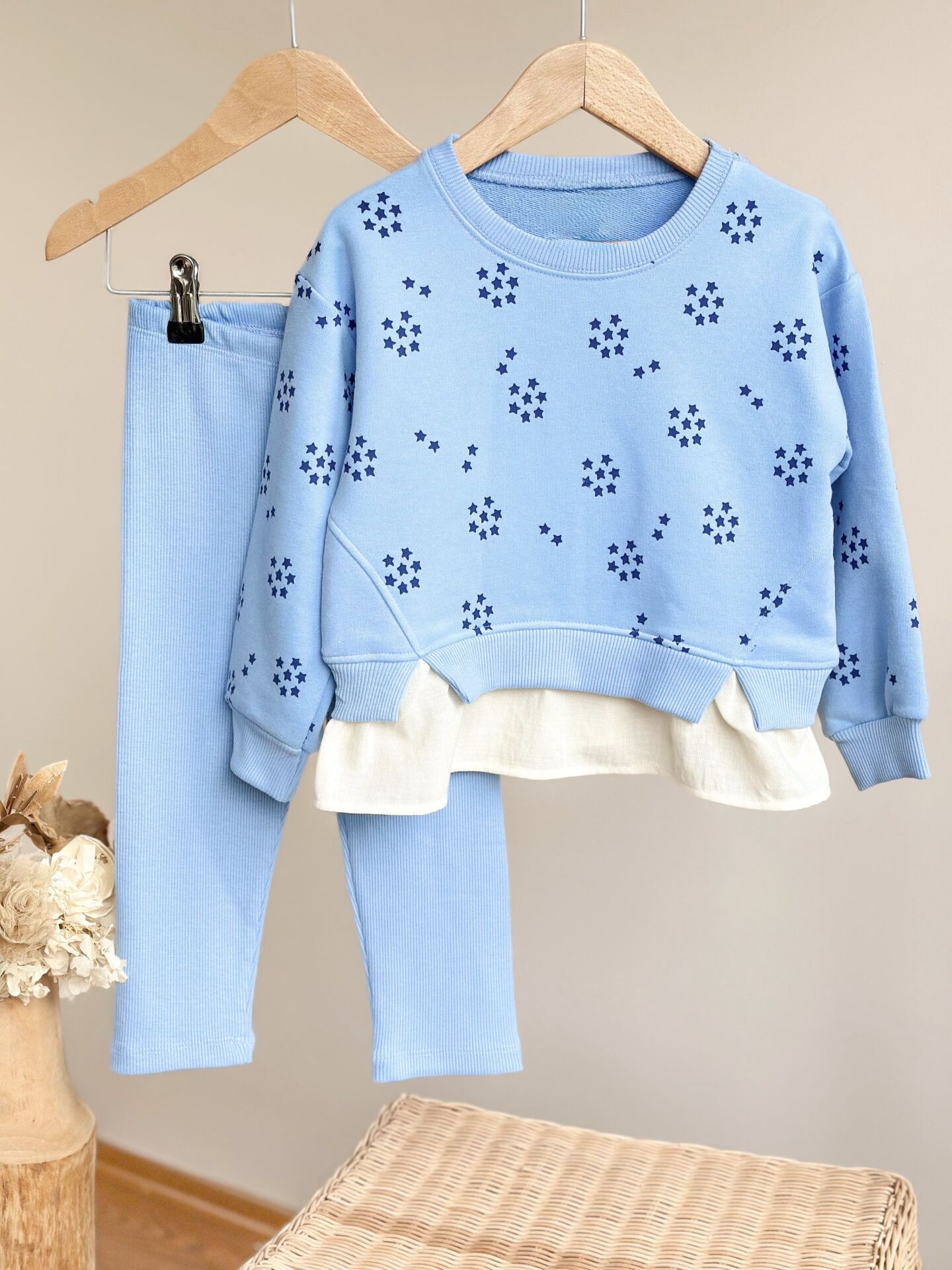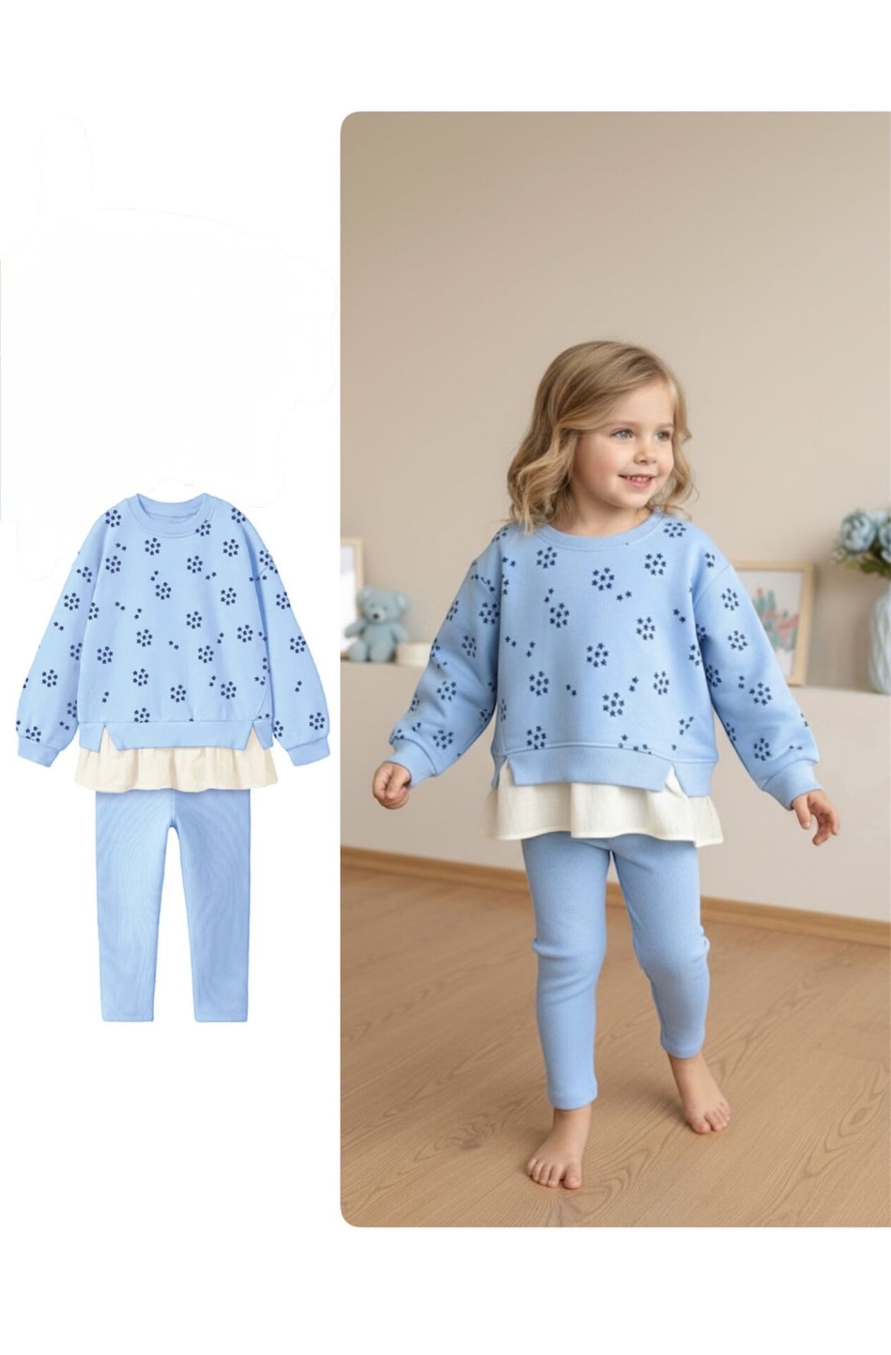 Gömlek Detaylı Çiçekli Taytlı Takım - Mavi