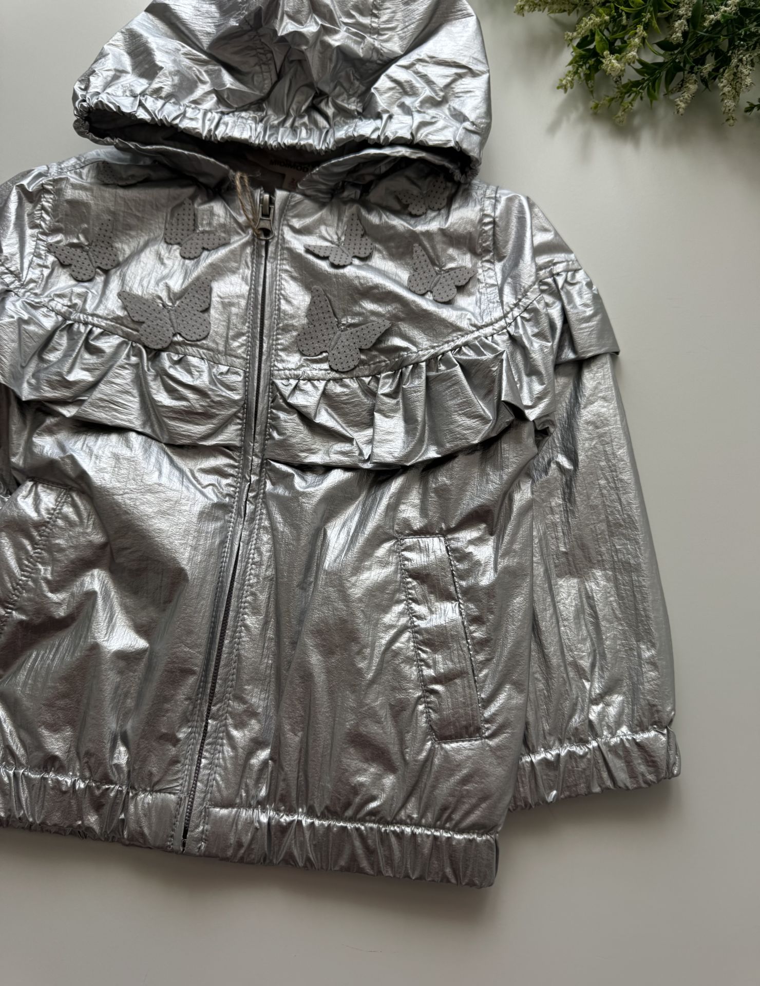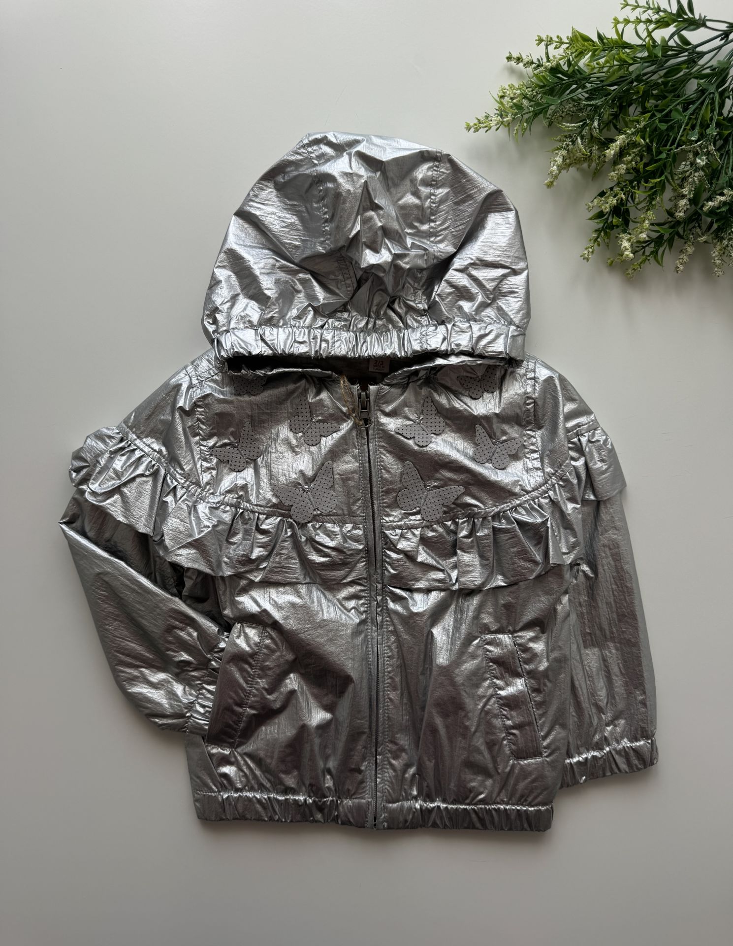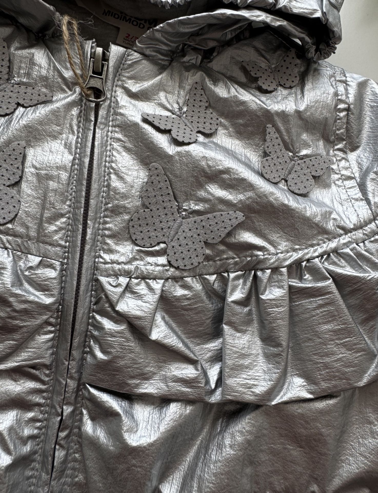 Ürün Bilgisi : İçi astarlı üzerinde kelebek aplikleri ve fırfır detaylı yağmurluk. Üzerindeki varak renklerde uygun sıcaklıkta yıkandığında solma atma yapmaz