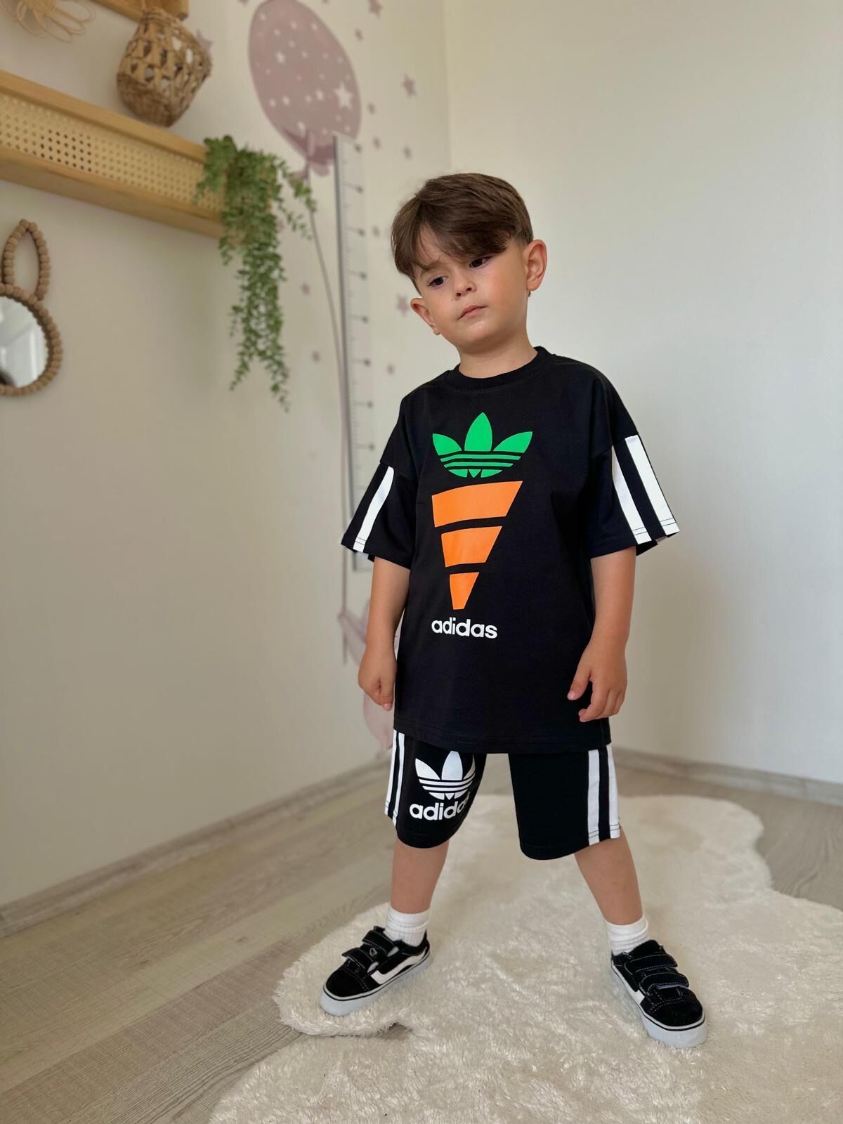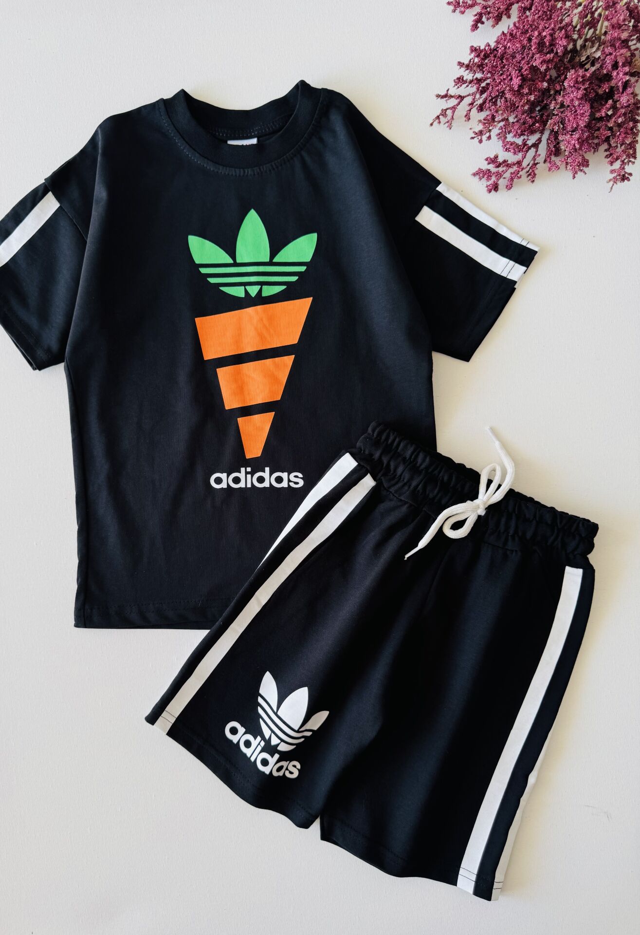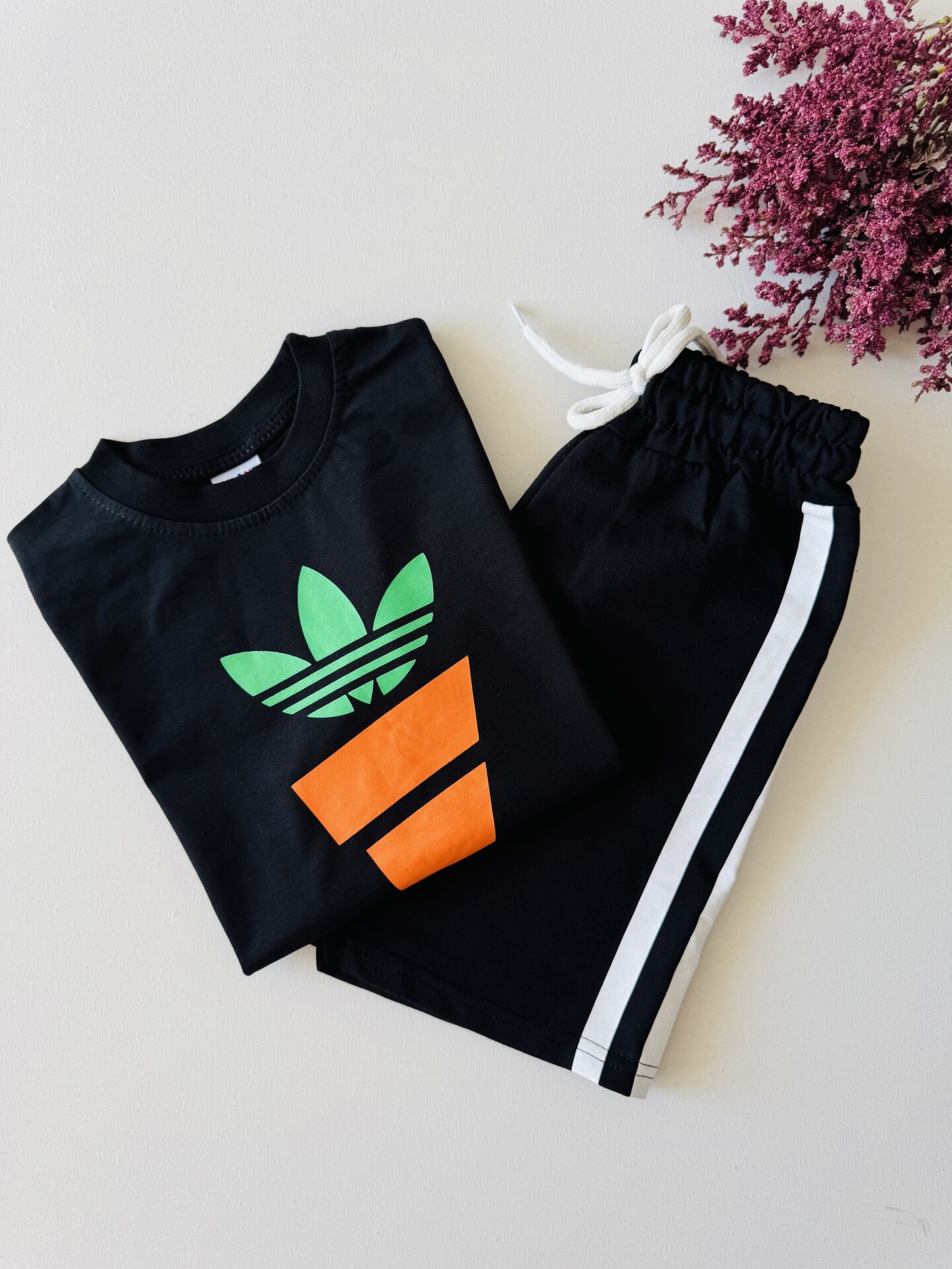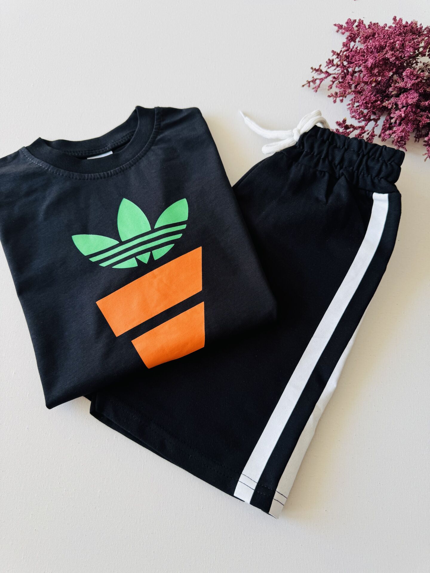 Havuç Baskılı Üç Çizgili Deniz Takım - Siyah