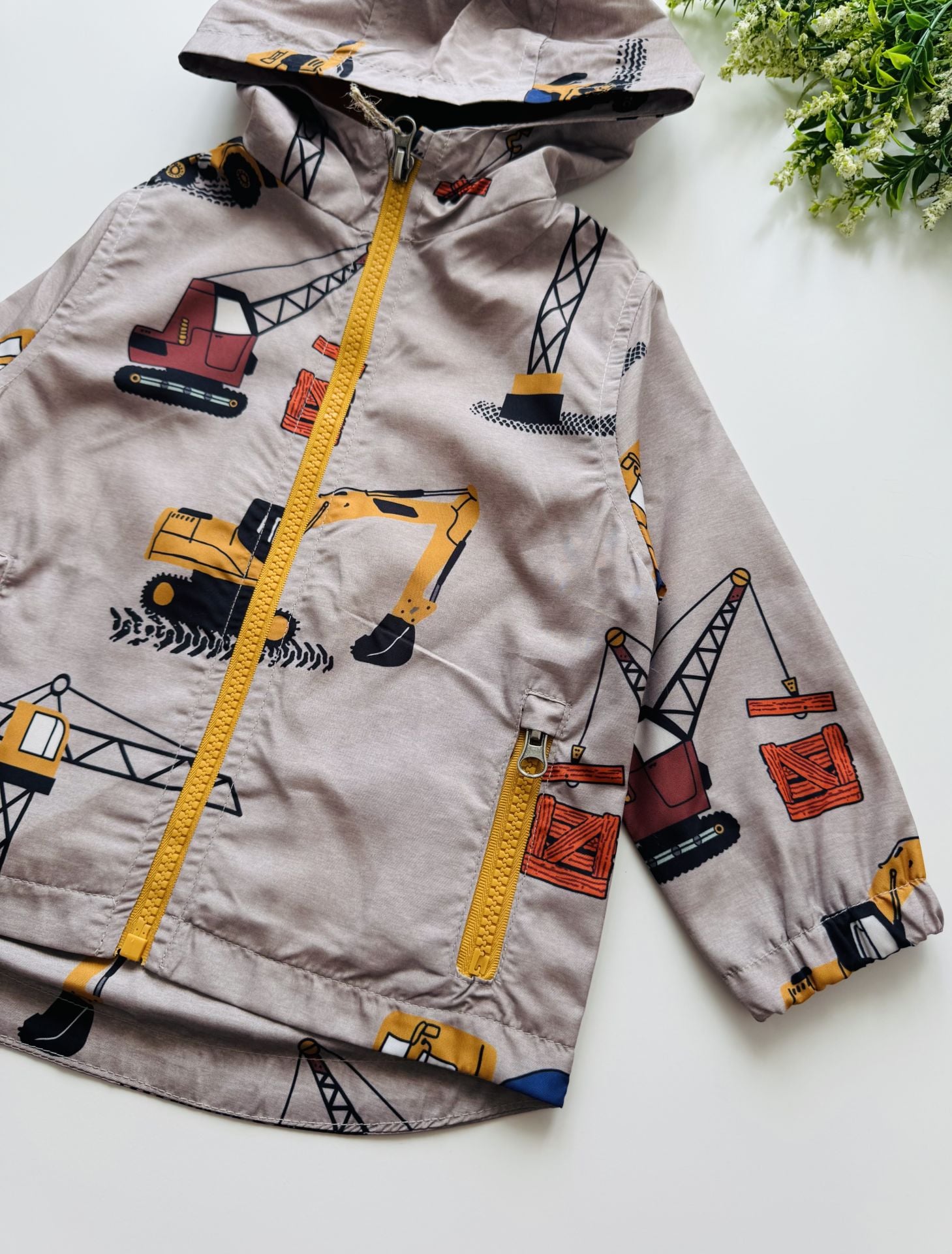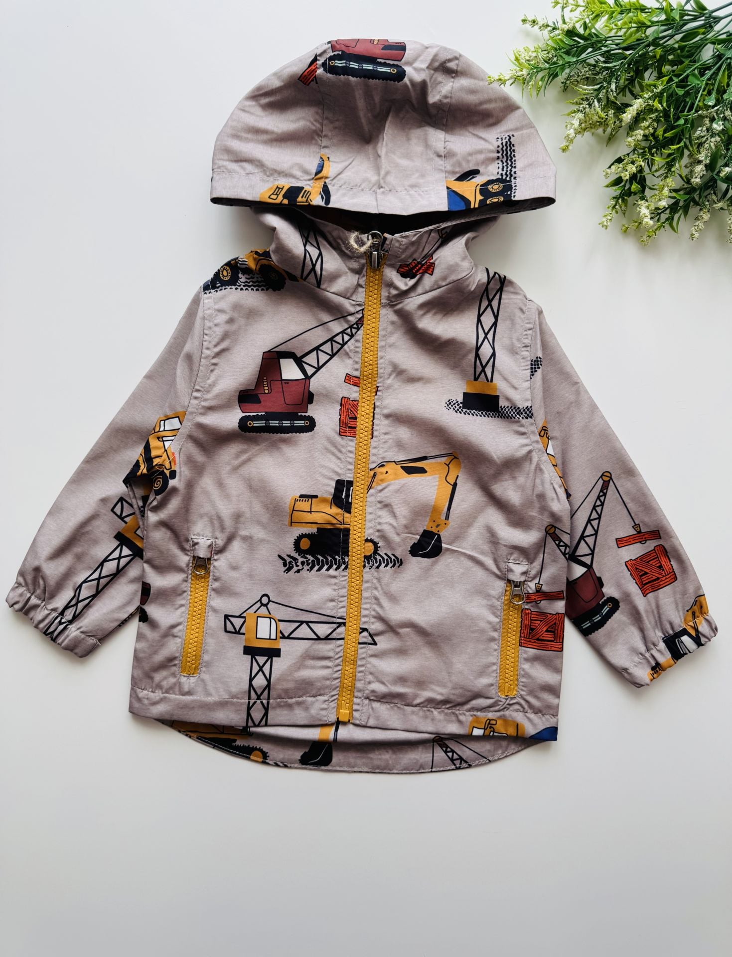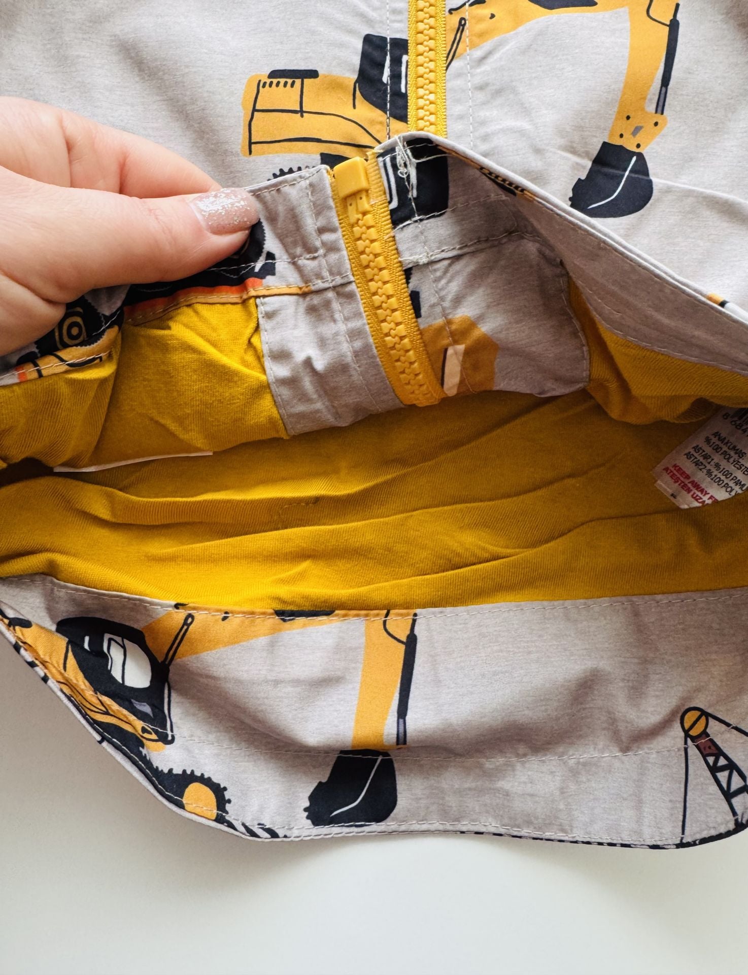 Ürün Bilgisi : İçi astarlı üzerinde iş makineleri oaln tarz yağmurluk. uygun sıcaklıkta yıkandığında solma atma yapmaz