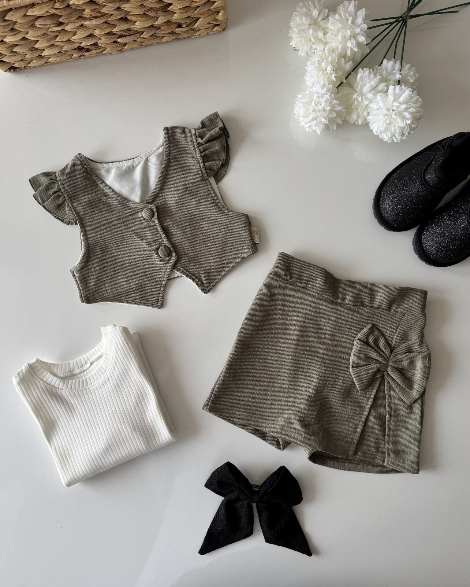 Kadife Şort Etekli Yelekli Takım - Yeşil