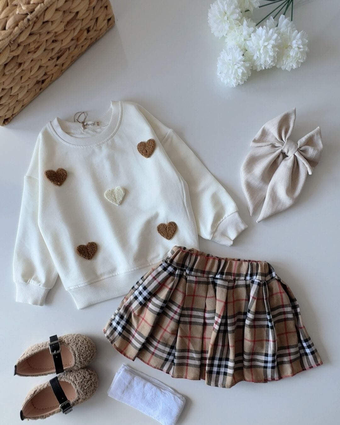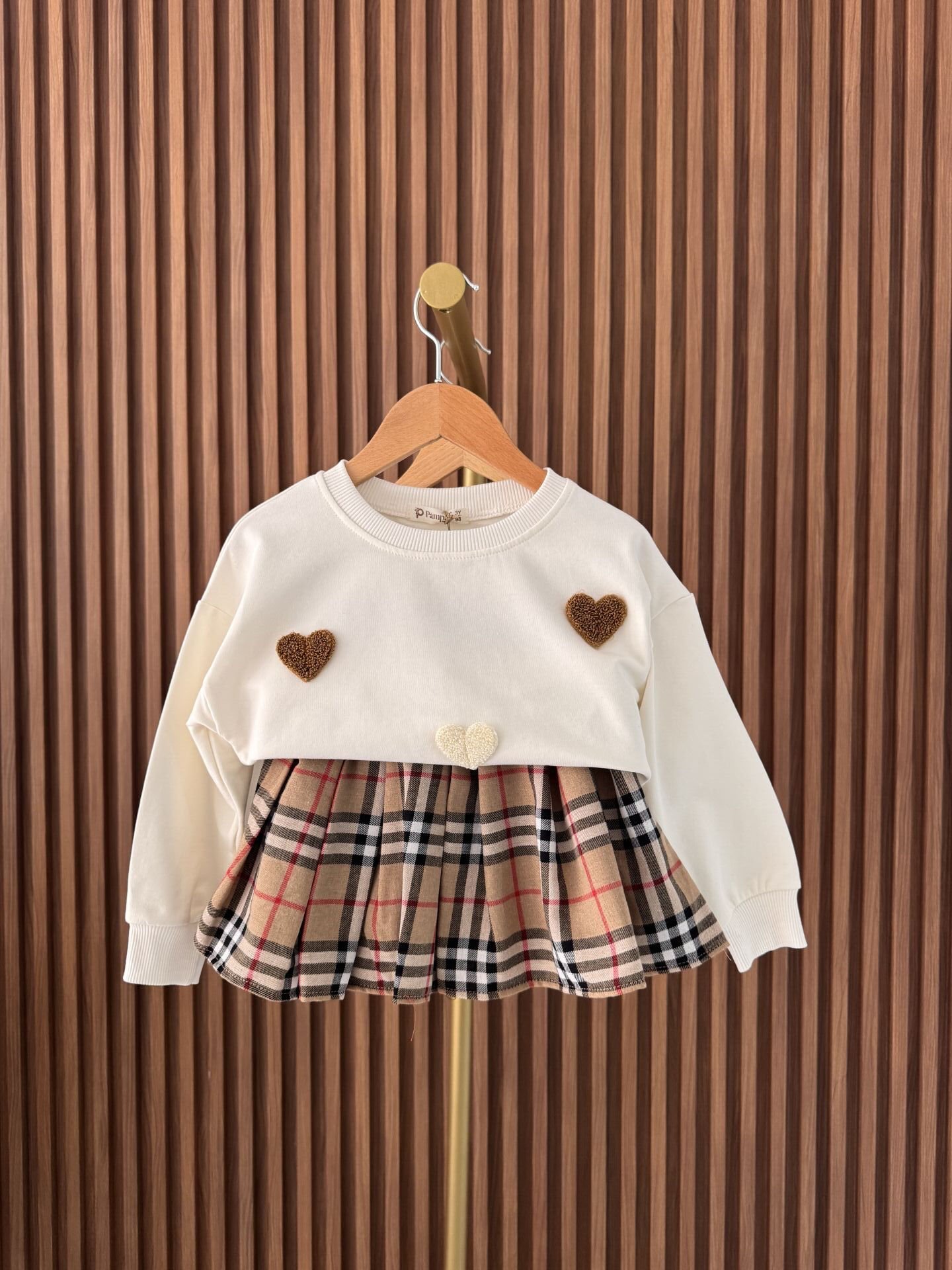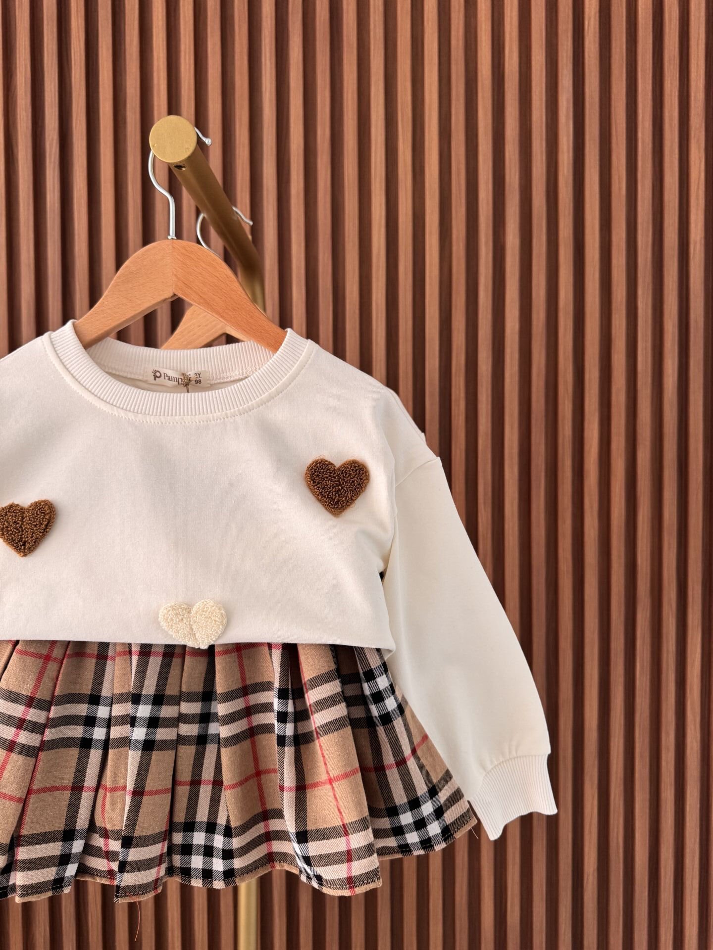 Kalp Punch Nakışlı Kareli Etekli Takım - Kahve