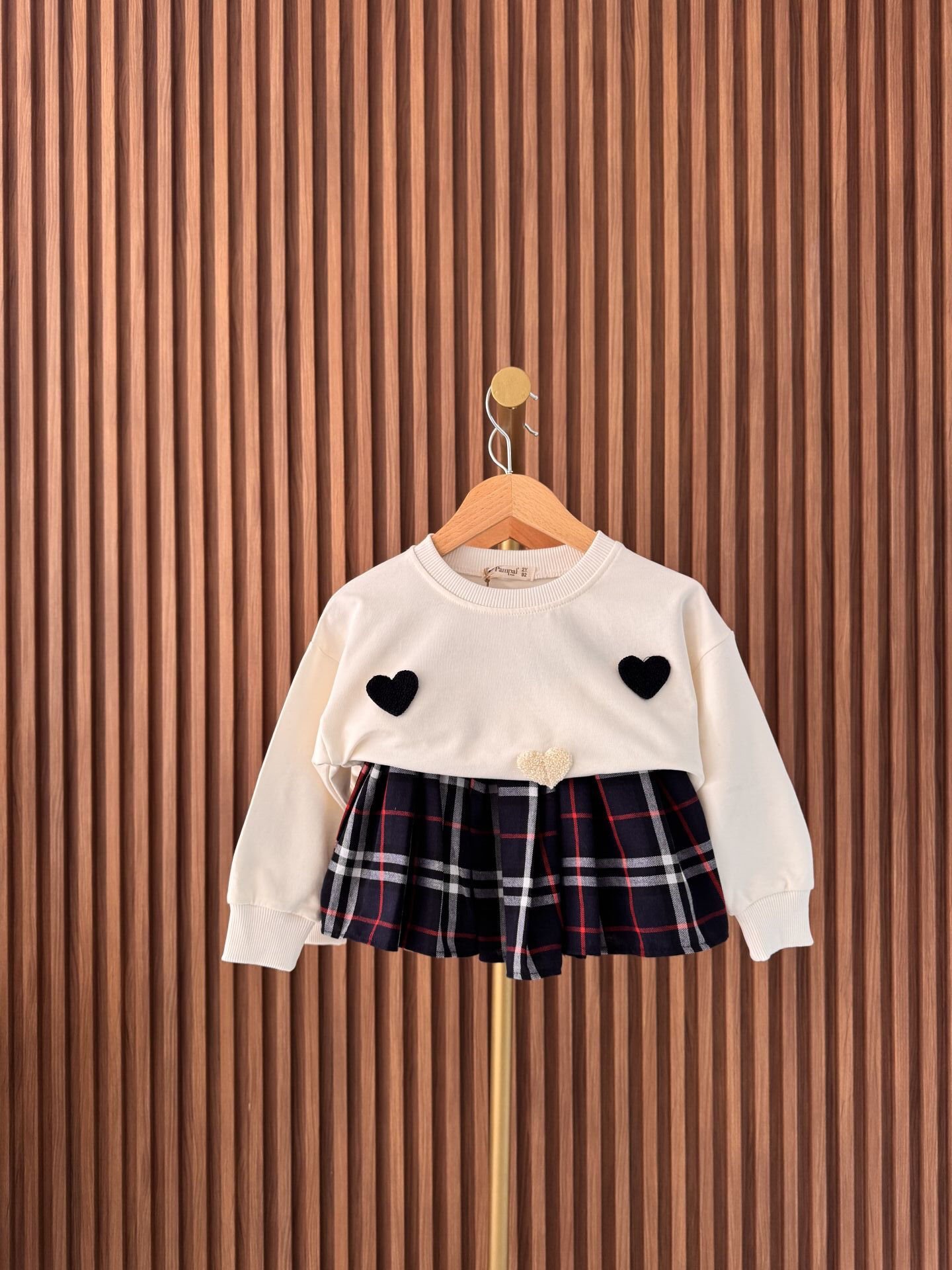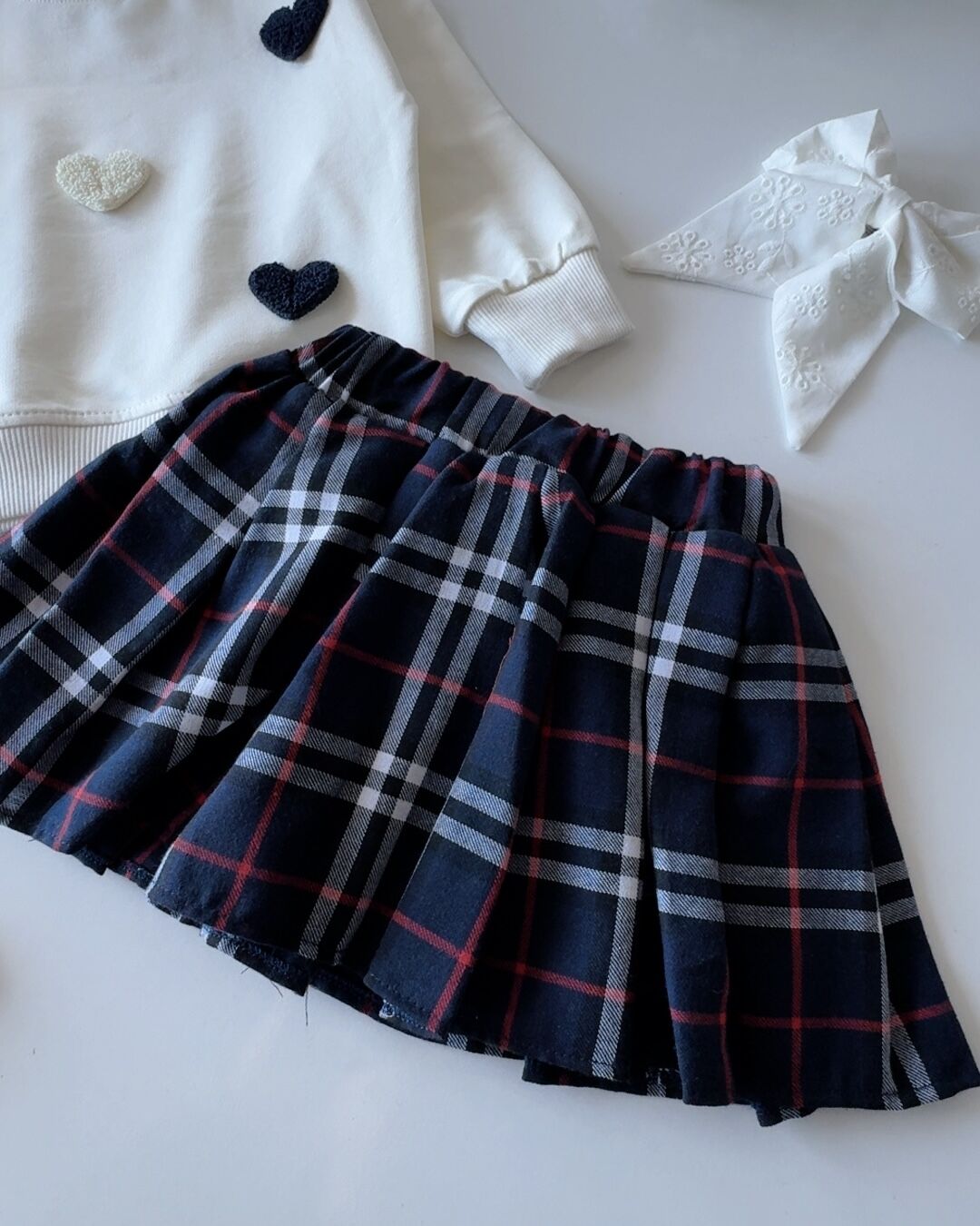 Kalp Punch Nakışlı Kareli Etekli Takım - Lacivert