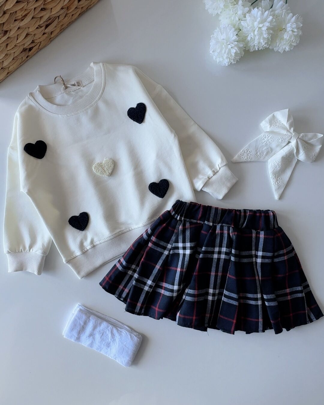 ‣ 3 İplik Takım üst kalp punch nakışlı, kareli dokuma etek