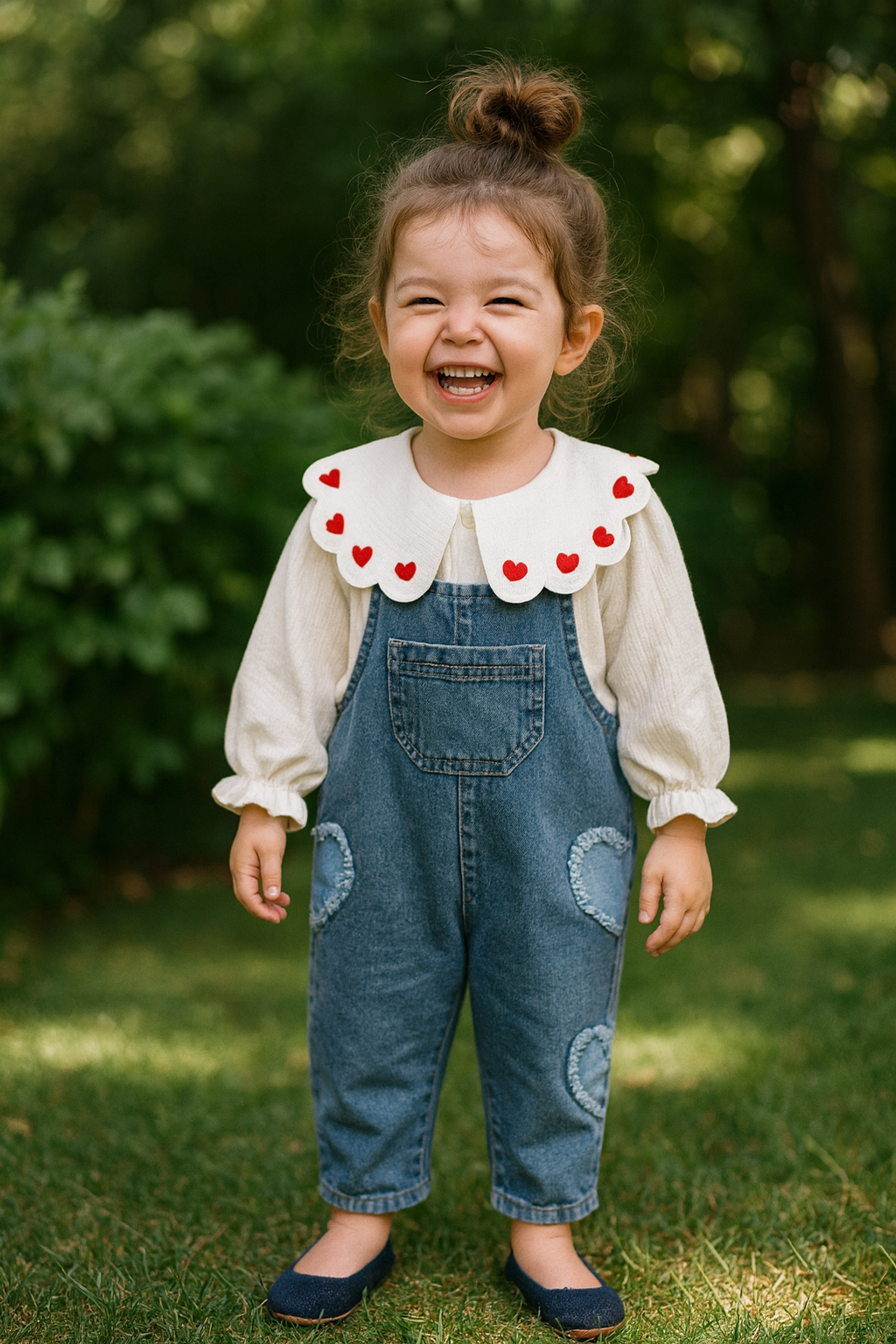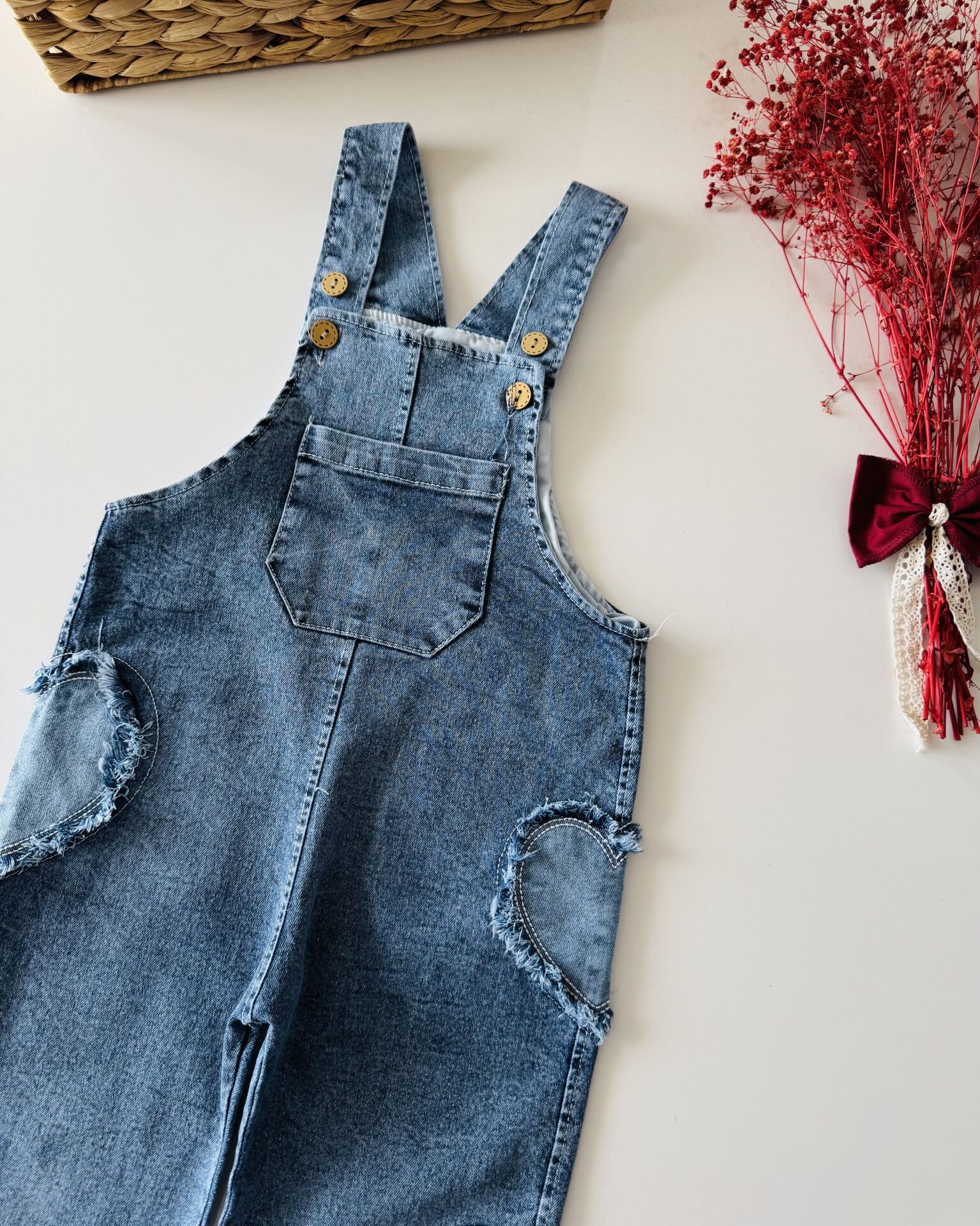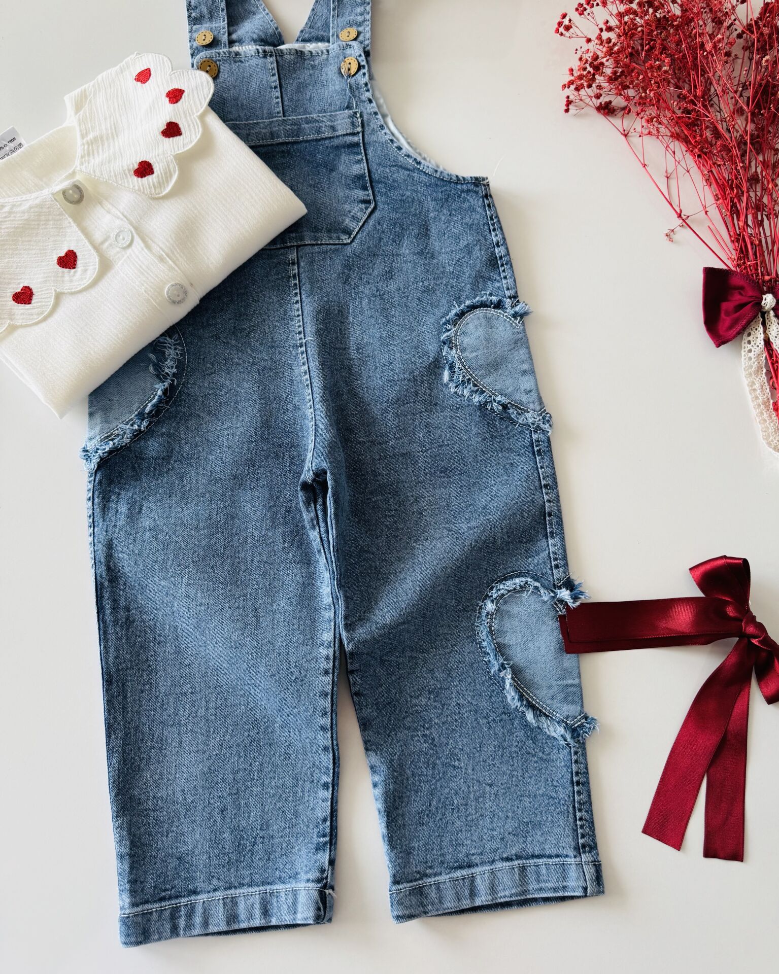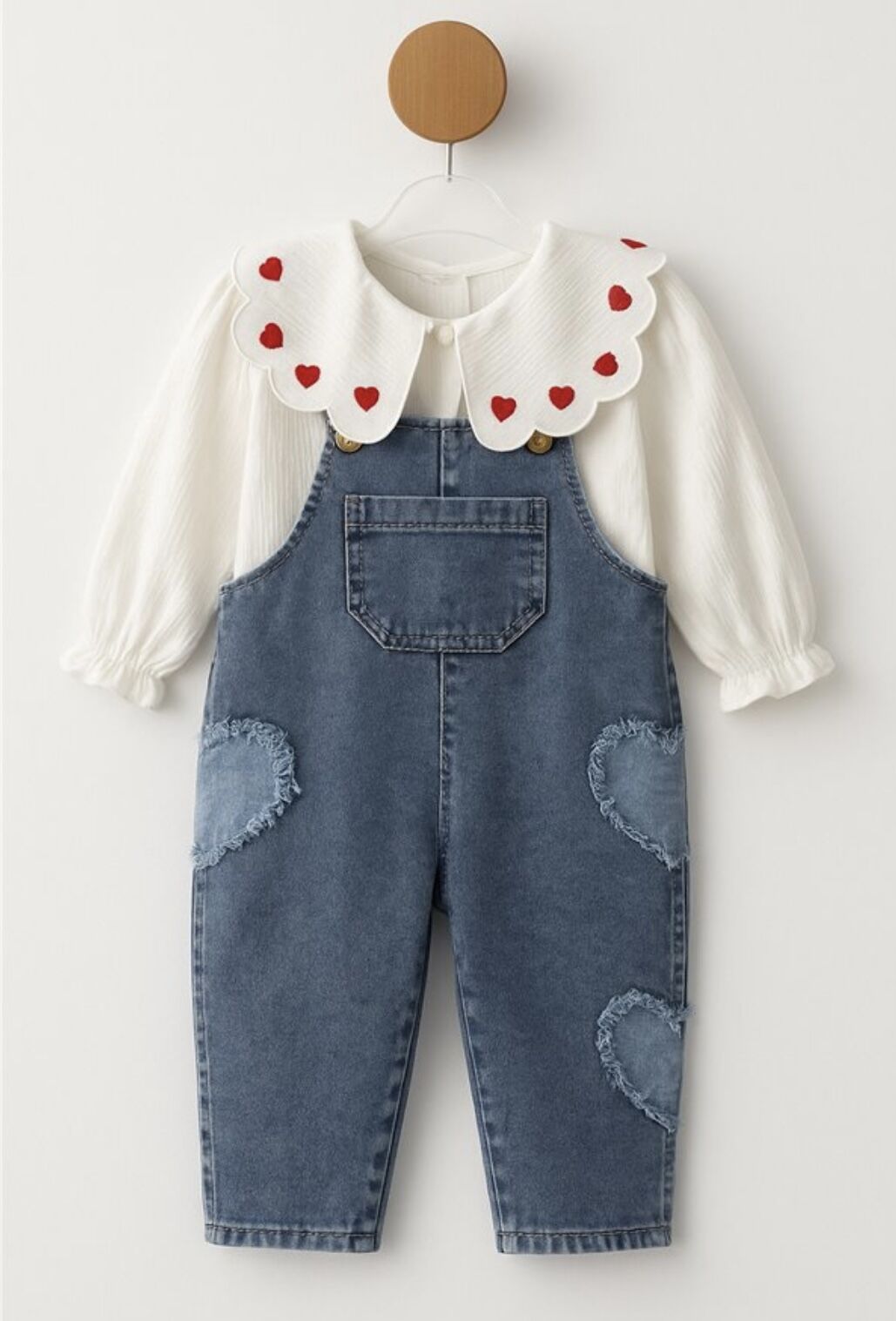 Kalp Yakalı Denim Salopet - Mavi
