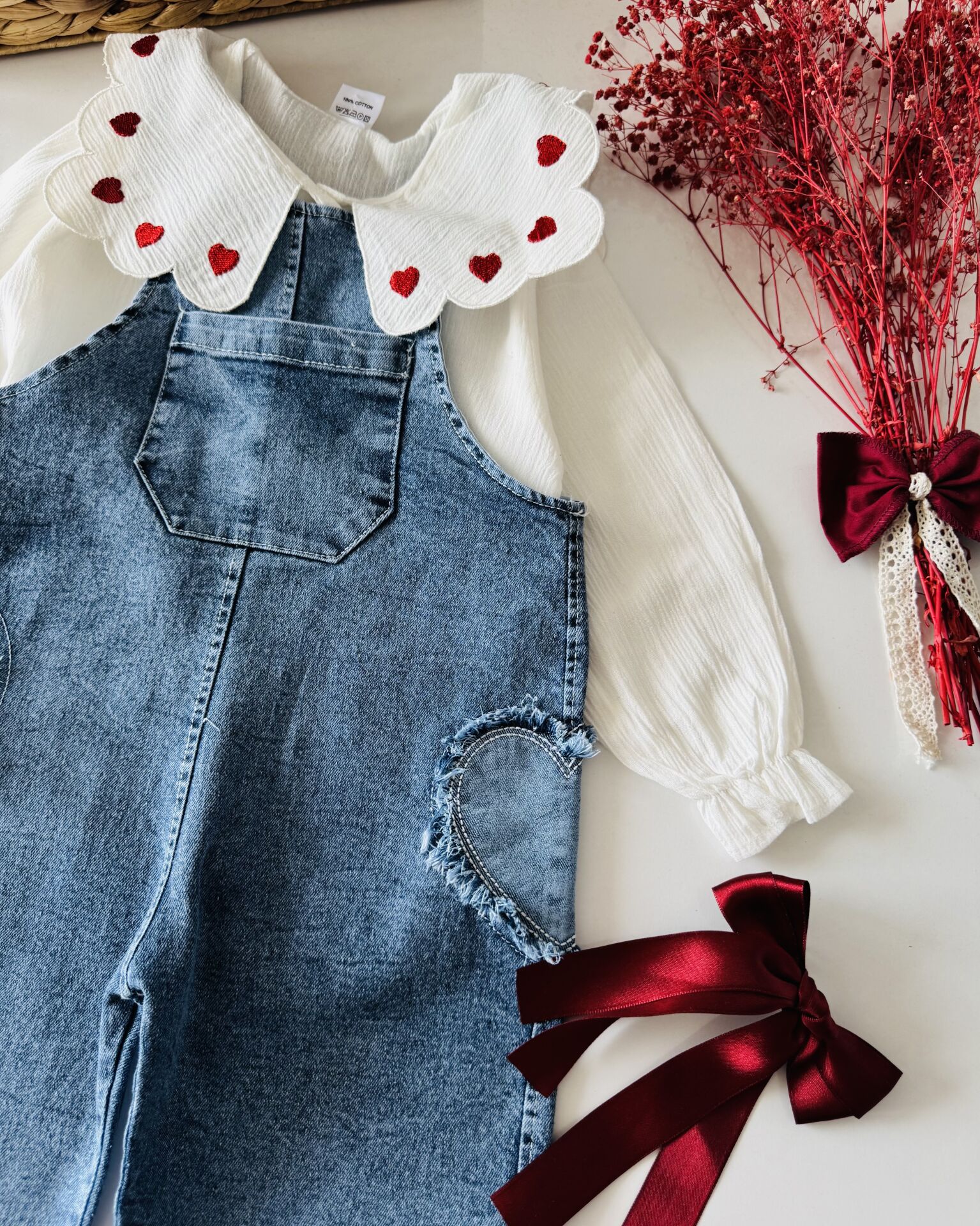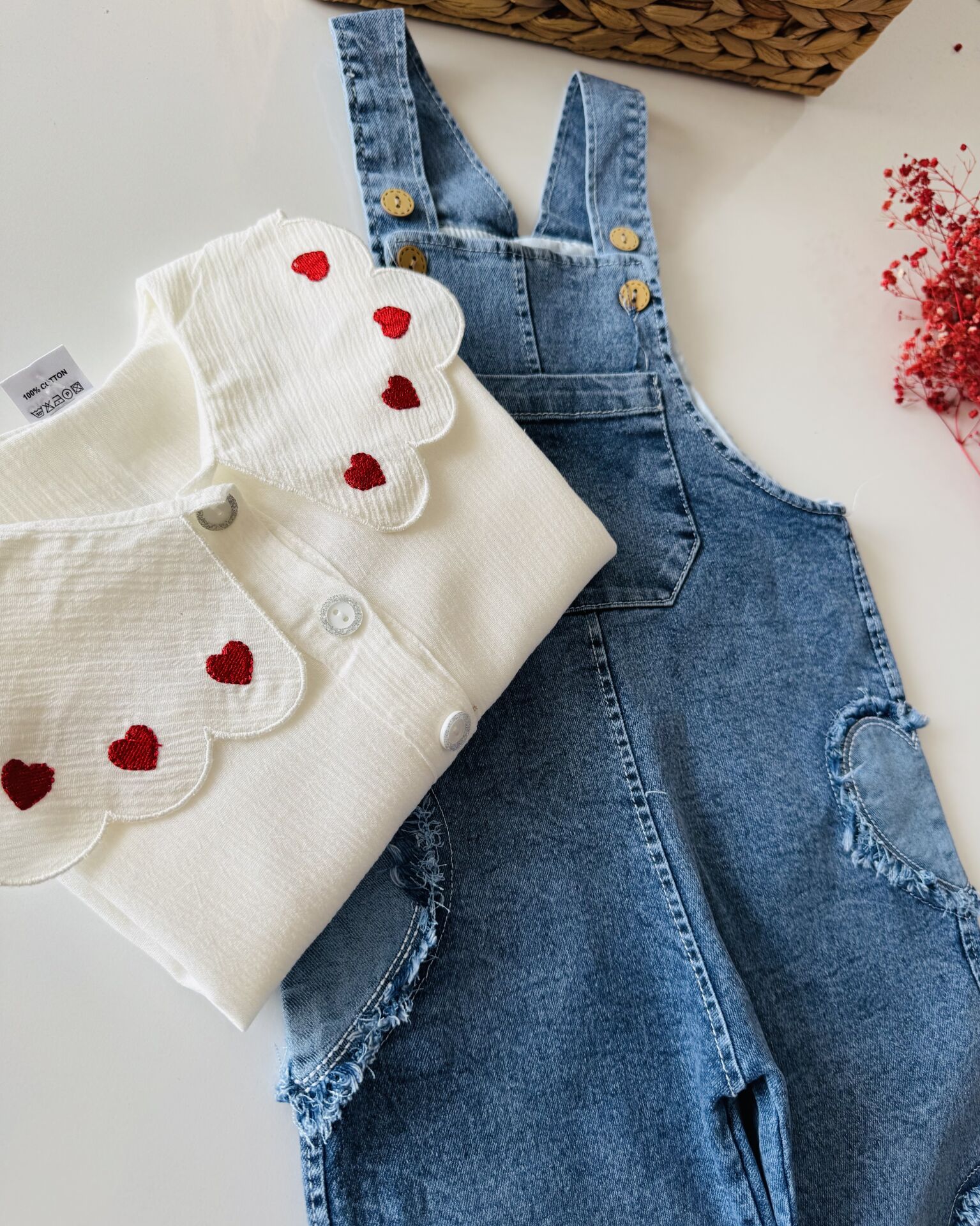 ‣ Üst gömlek bürümcük kumaştır. Salopet esnek denim kumaştır.