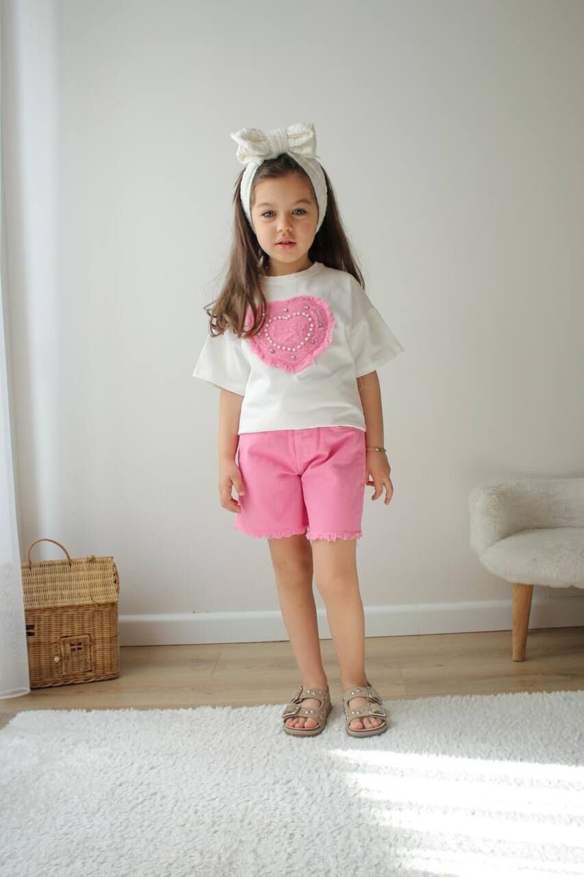 Ürün Bilgisi : Pamuklu beyaz basic tişört üzerine kalp aplikeli .. Alt esnek şort