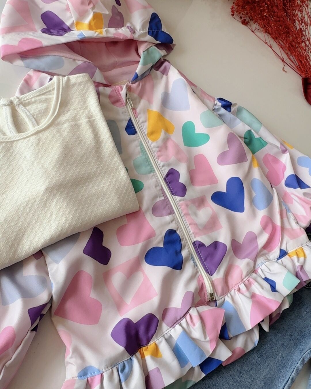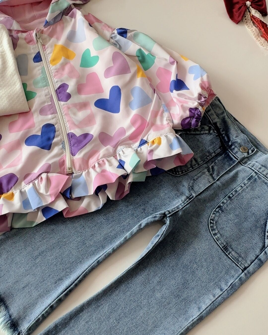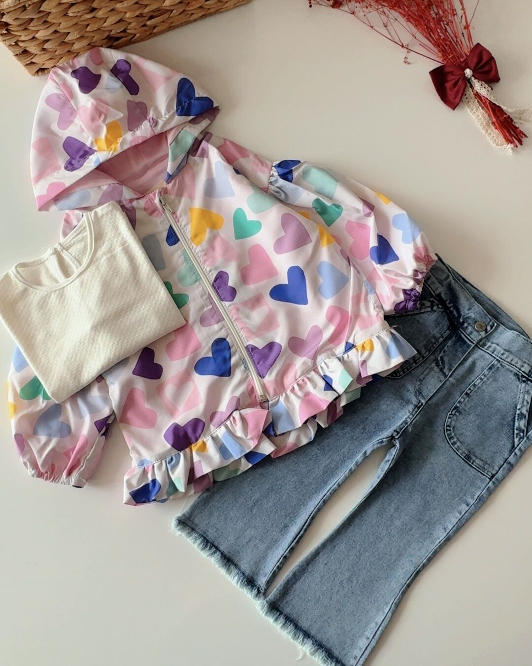Kalpli Yağmurluklu 3'lü Jean Takım - Pembe