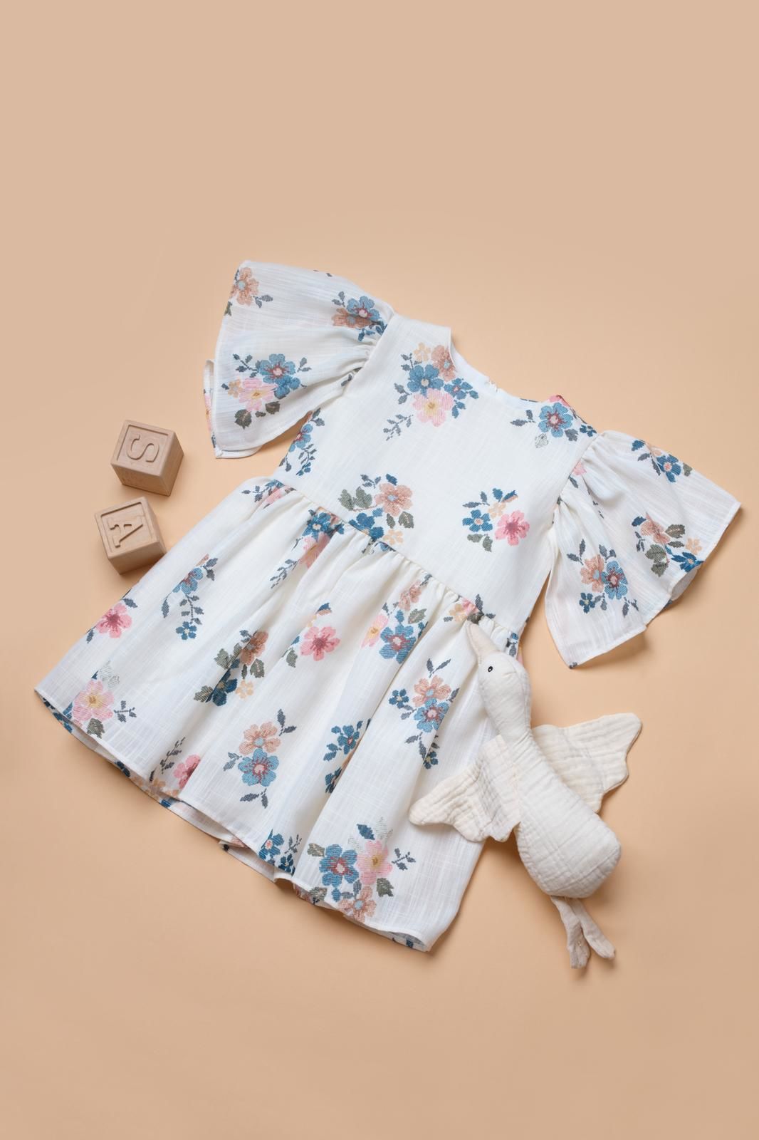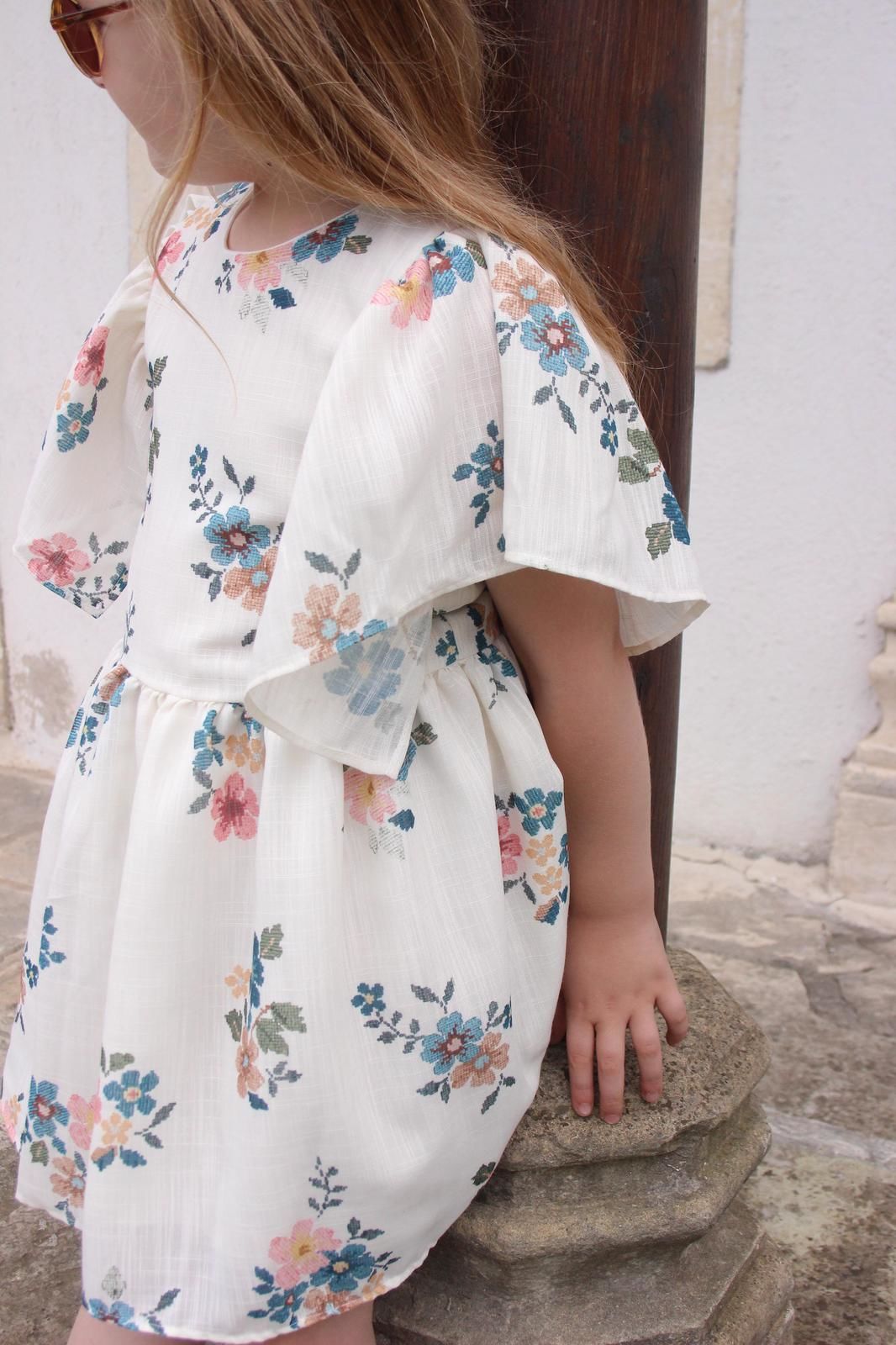 Ürün Bilgisi :Pamuklu kumaş içi astarlı üzeri kanaviçe baskılı elbise, kolları volanlıdır.