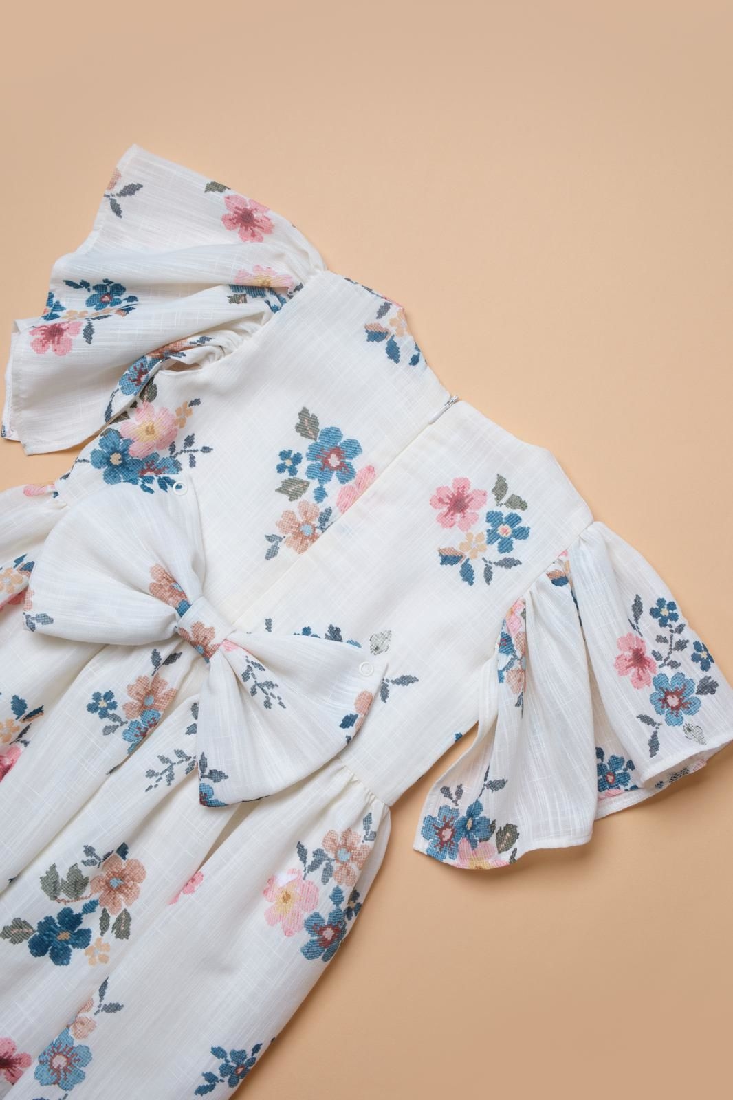 Kanaviçe Baskılı Çiçekli Gülru Elbise - Beyaz