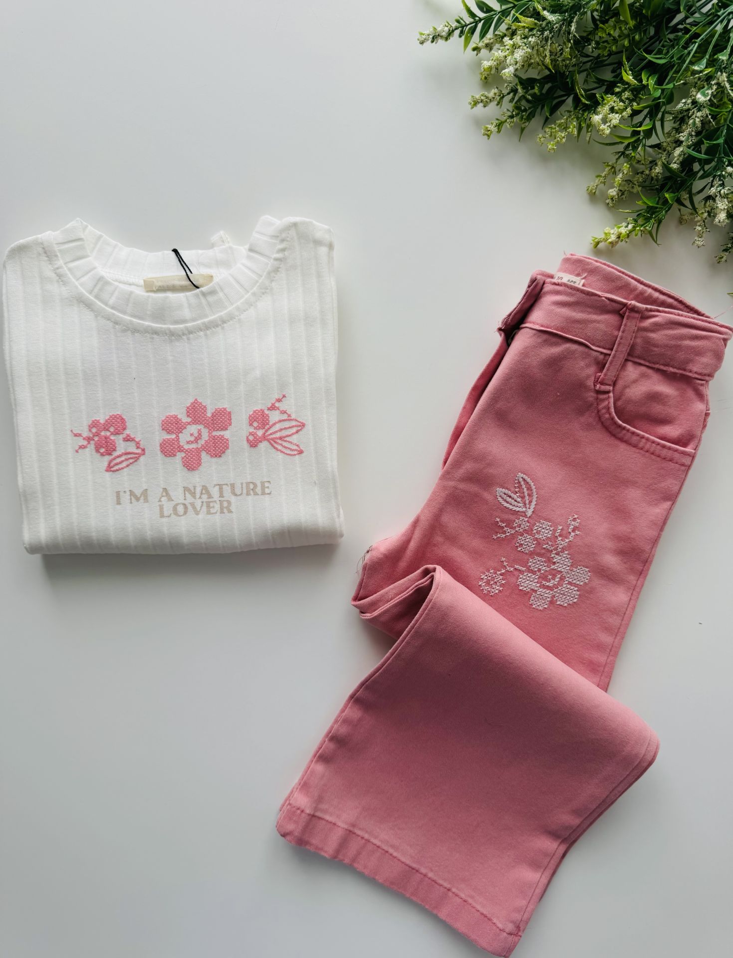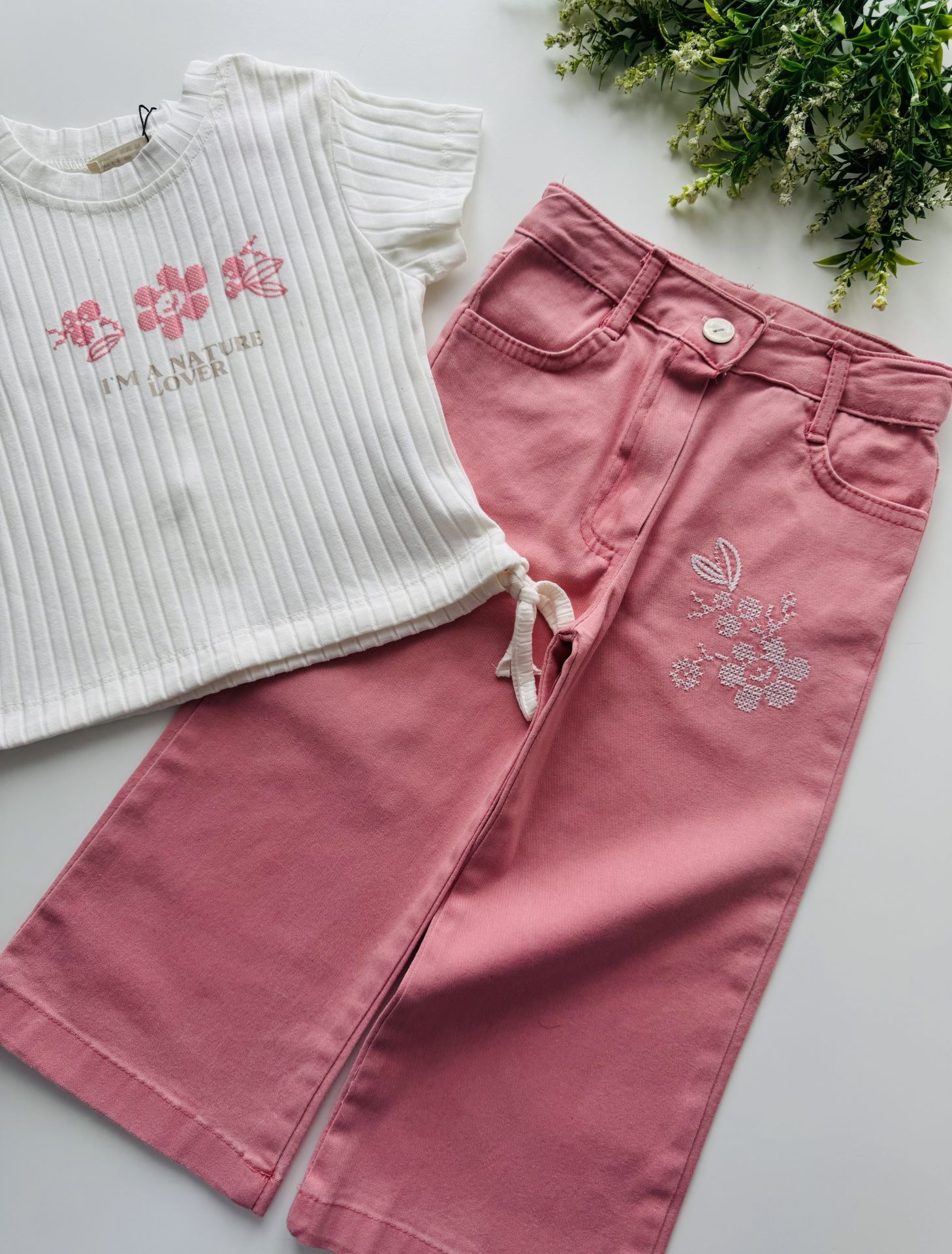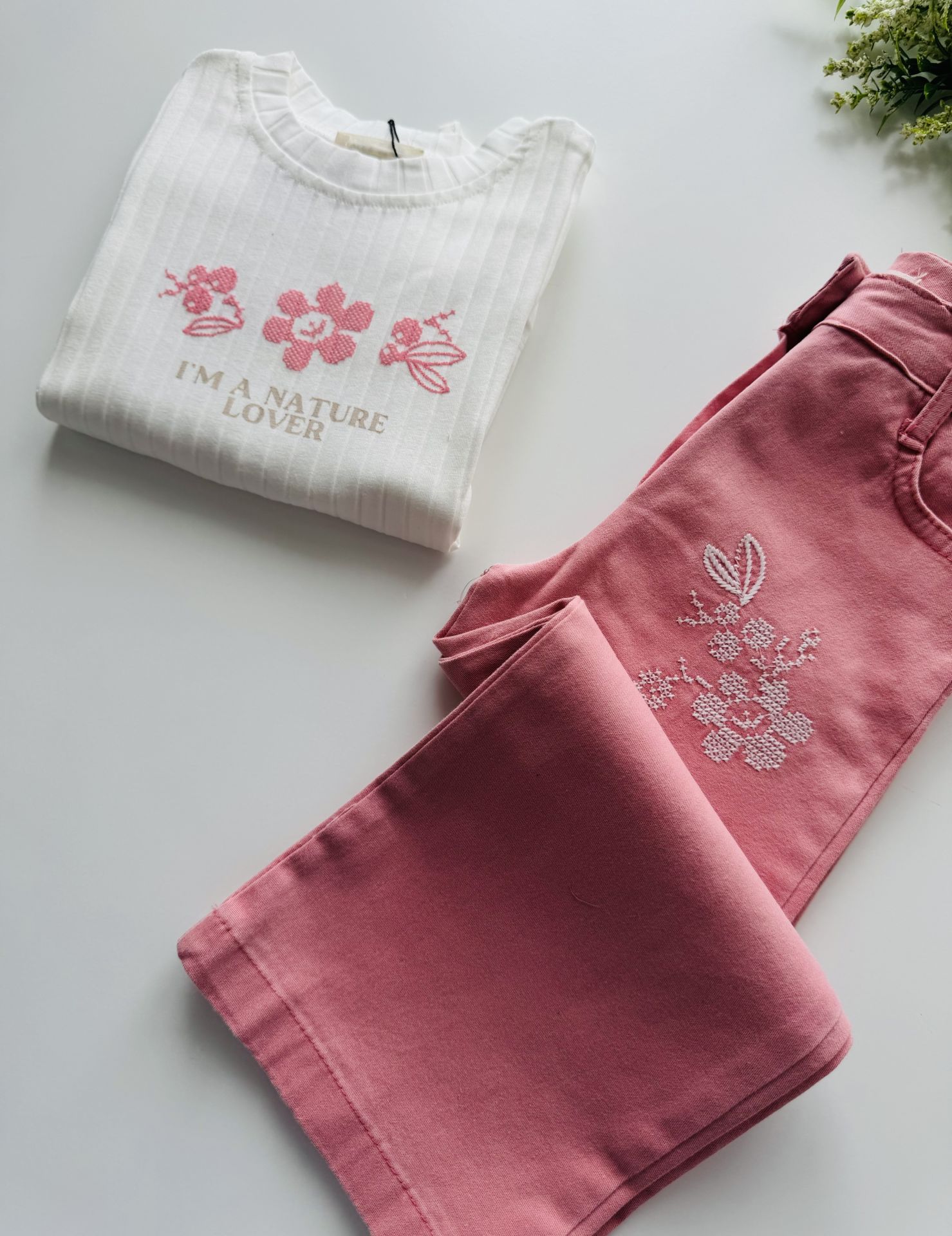 Ürün Bilgisi : Pamuklu tişört üzerine slogan baskılı alt gabardin kumaş hafif bol paça pantolon. Pantolon üzerinde kanaviçe işlemeleri mevcuttur.