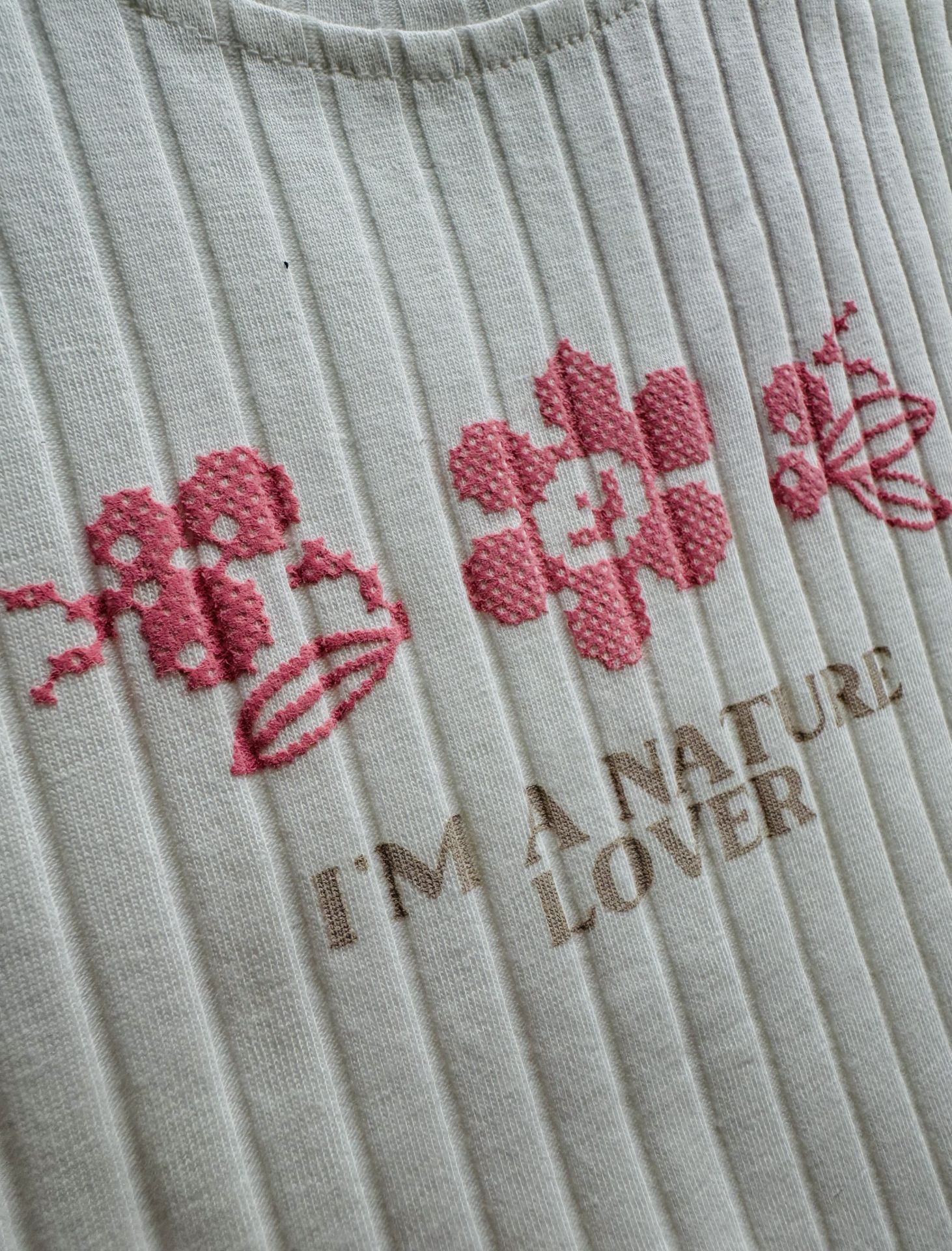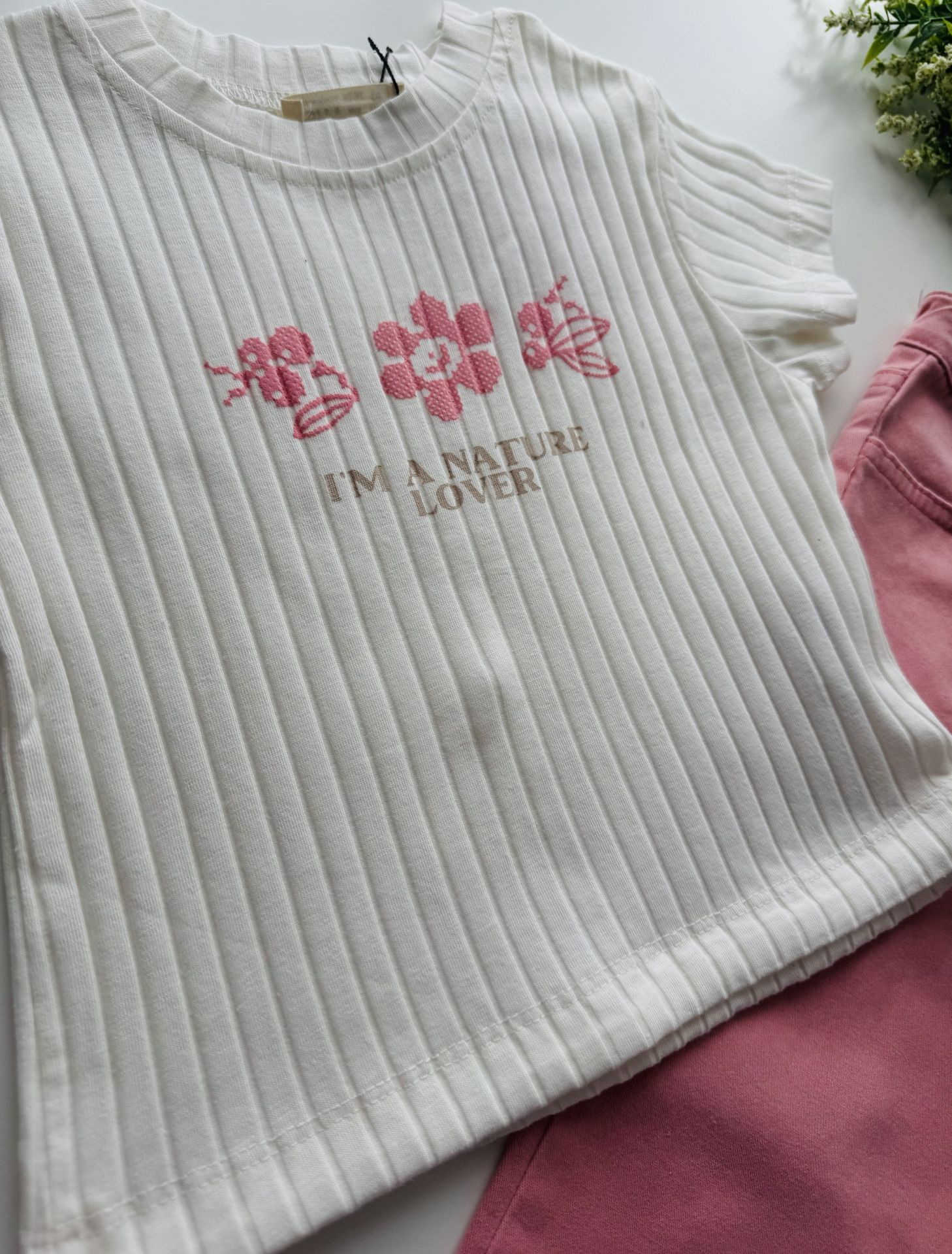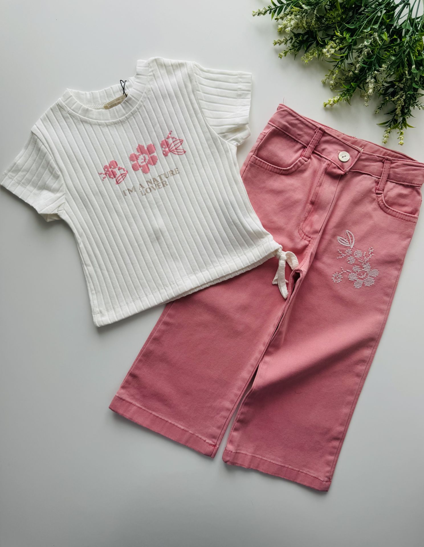 Ürün Bilgisi : Pamuklu tişört üzerine slogan baskılı alt gabardin kumaş hafif bol paça pantolon. Pantolon üzerinde kanaviçe işlemeleri mevcuttur.