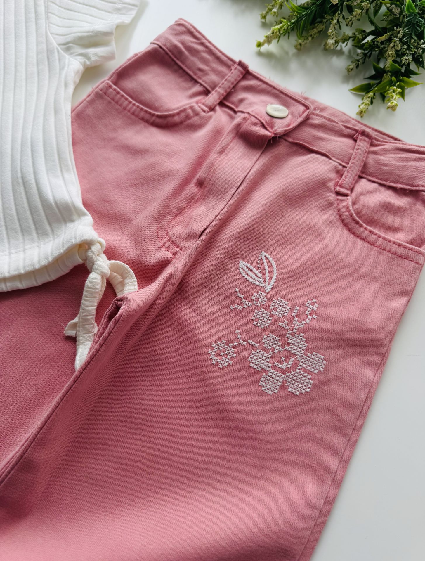 Kanaviçe İşlemeli Pantolonlu 2'li Gülru Set - Beyaz