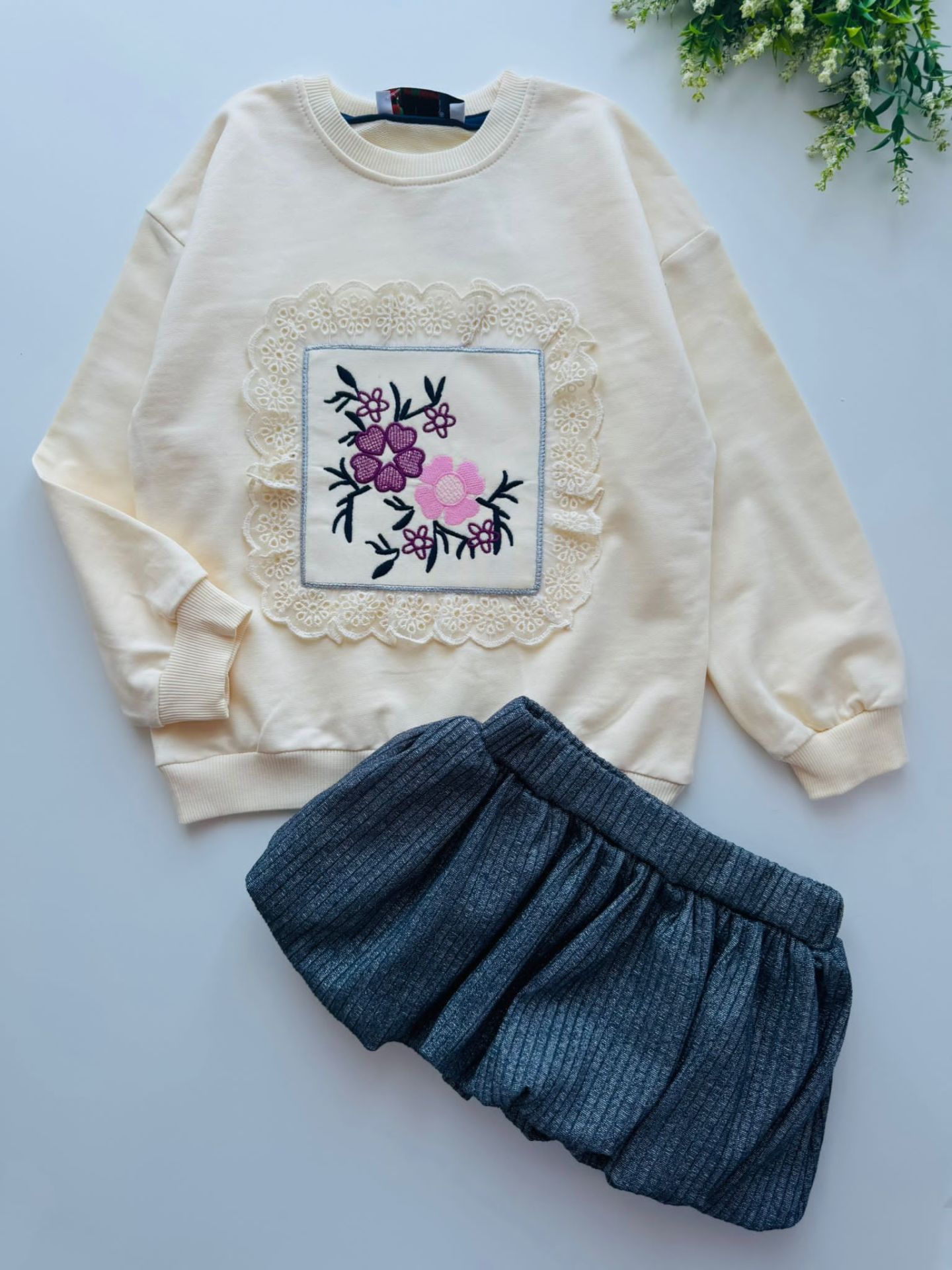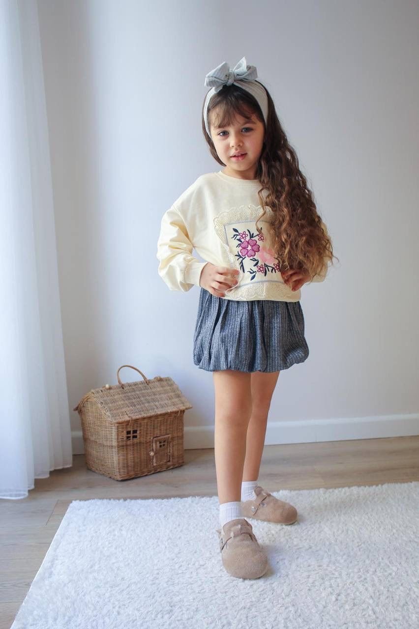 Kanaviçe ve Fisto Çerçeveli Simli Balon Etekli Gülru Takım - Gümüş Krem