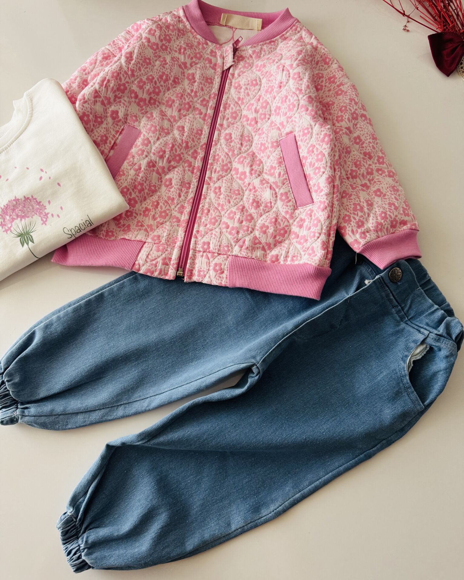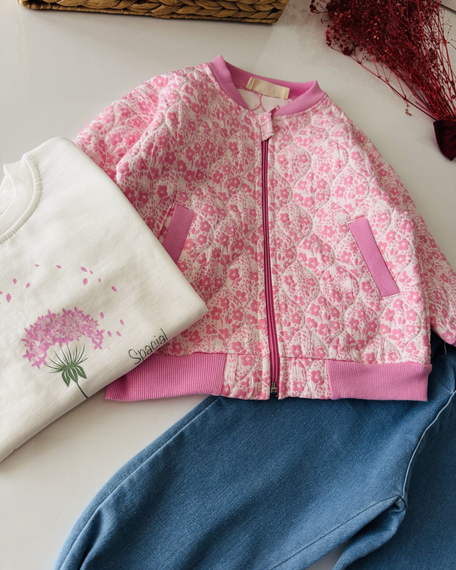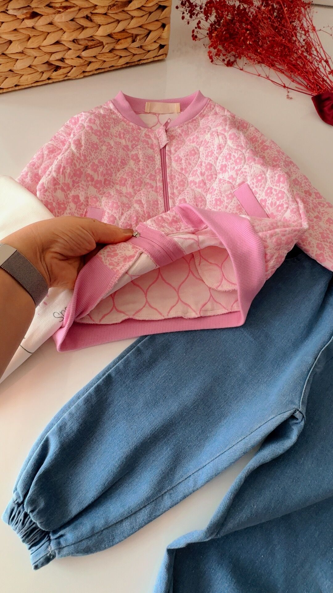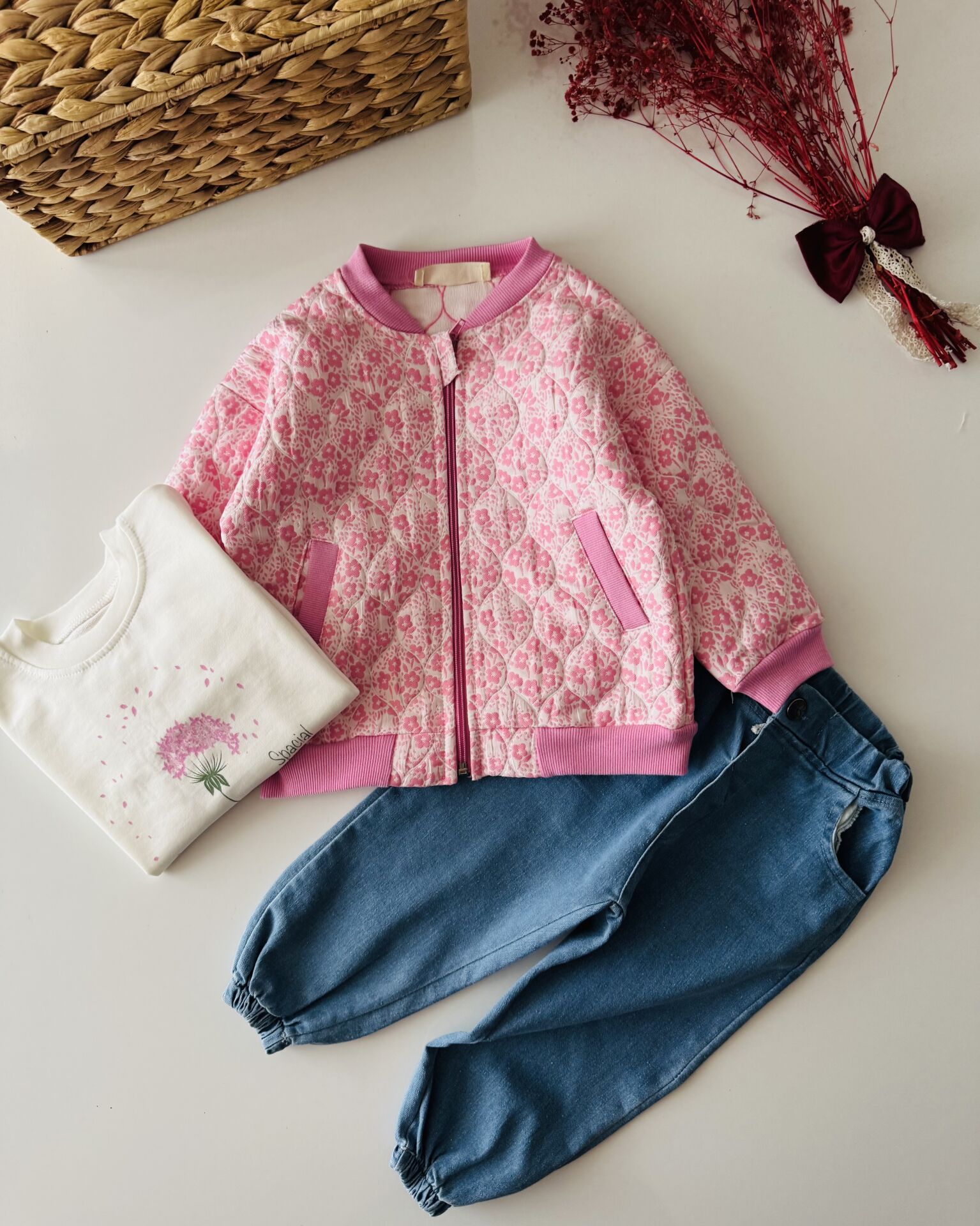 Kapitone Çiçekli Ceketli 3'lü Set - Pembe