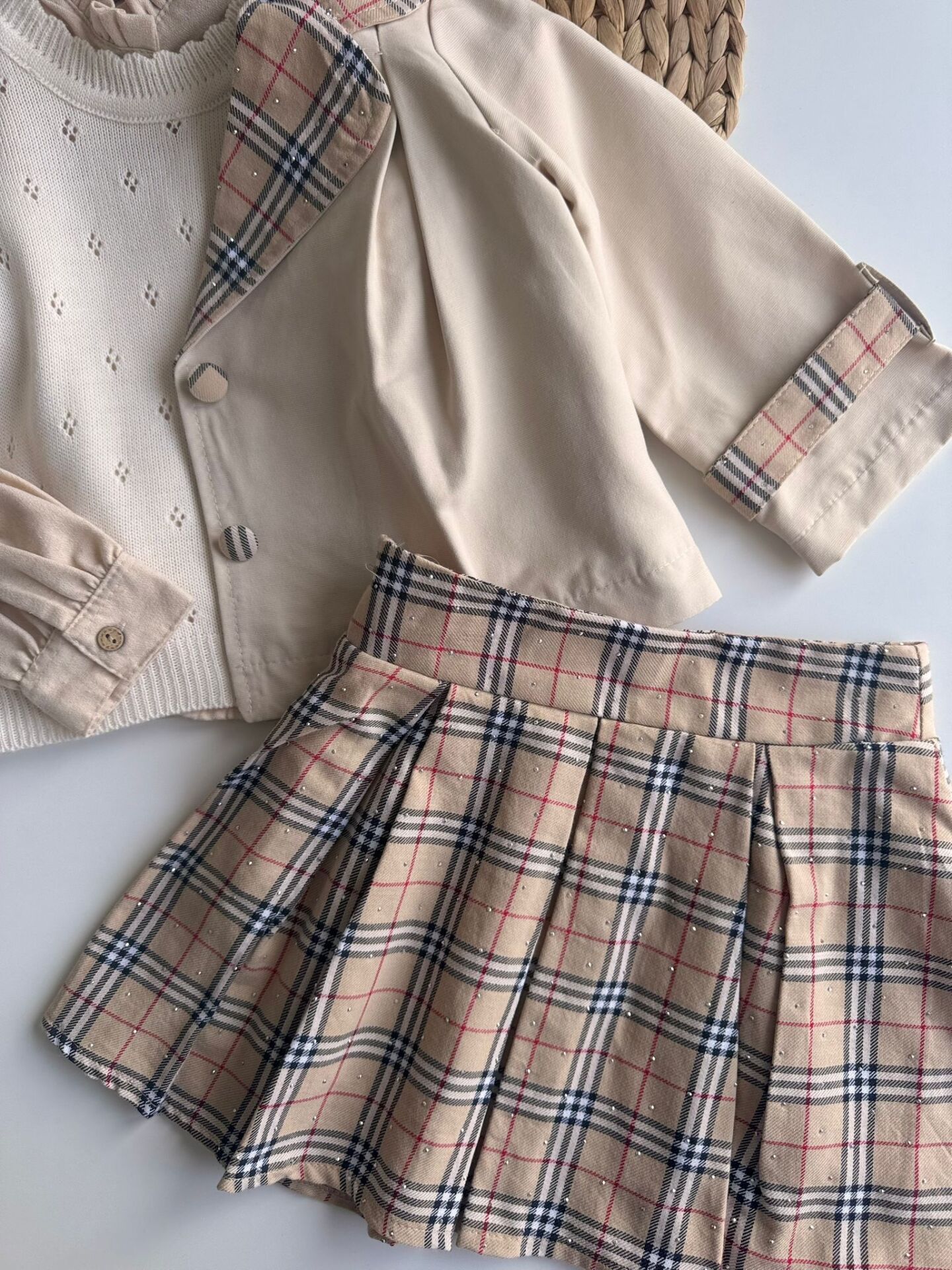 Ürün Özellikleri: Trençkot, İç triko süveter, gömlek, etek ve çorap hediyesi ile.