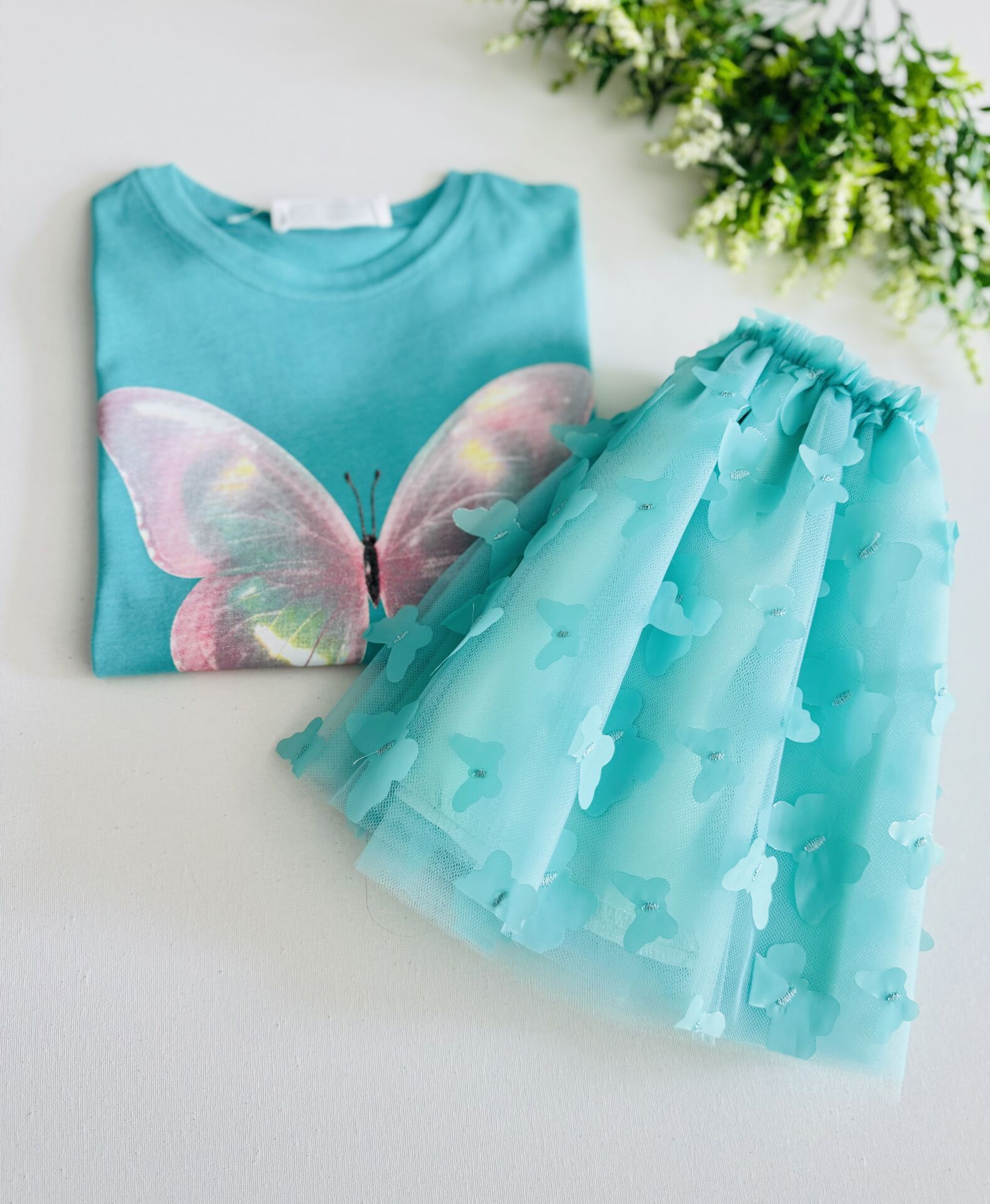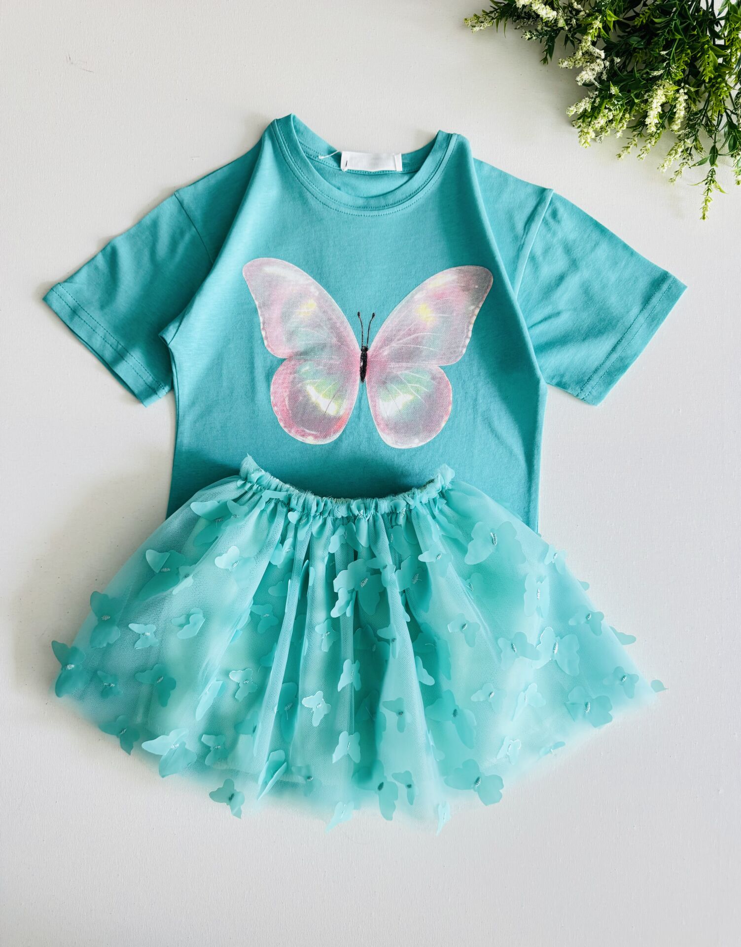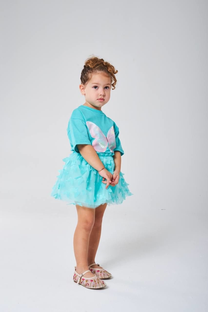 Ürün Bilgisi : Varak kelebek baskılı rahat kesim tişört kelebek aplikeli tütülü etek