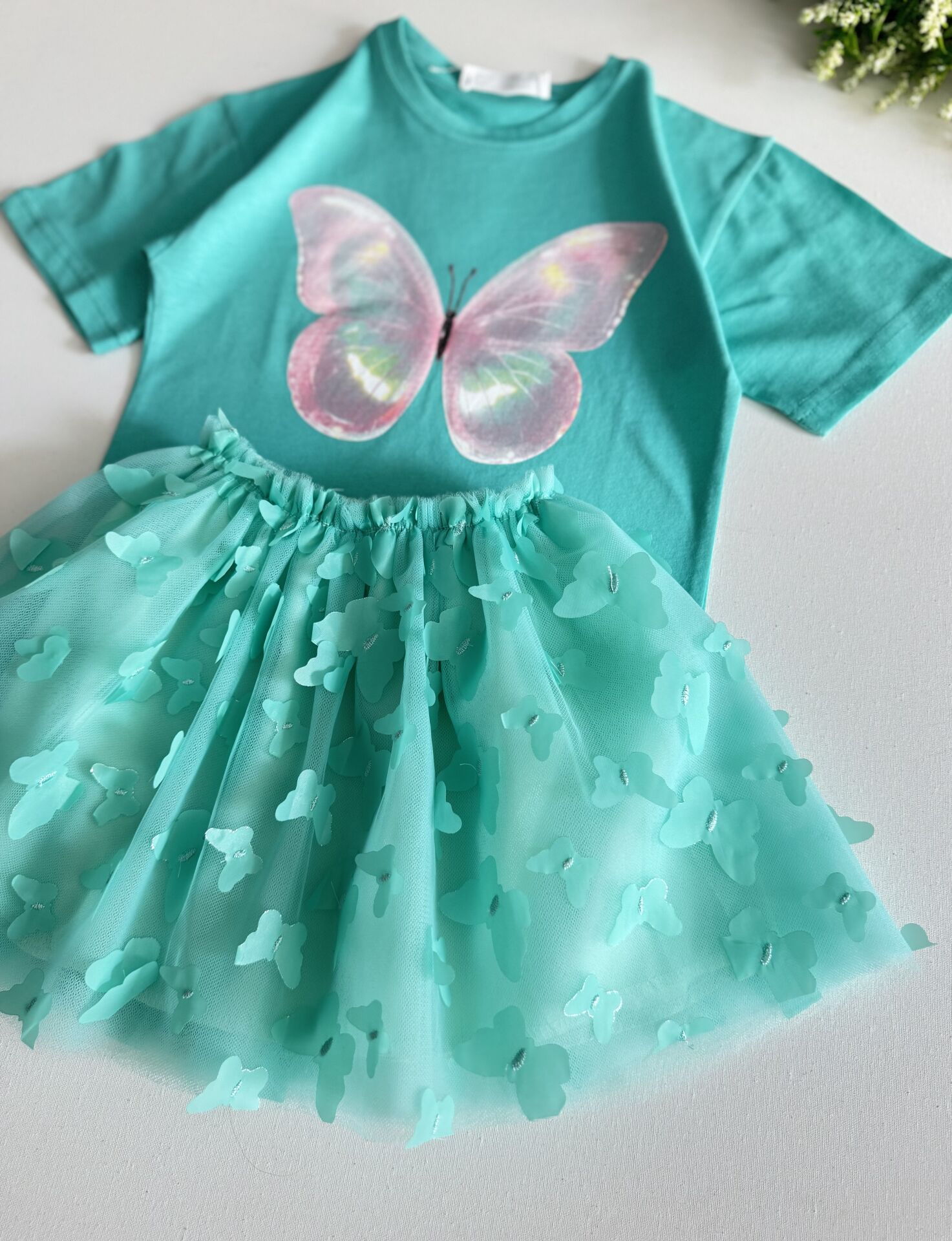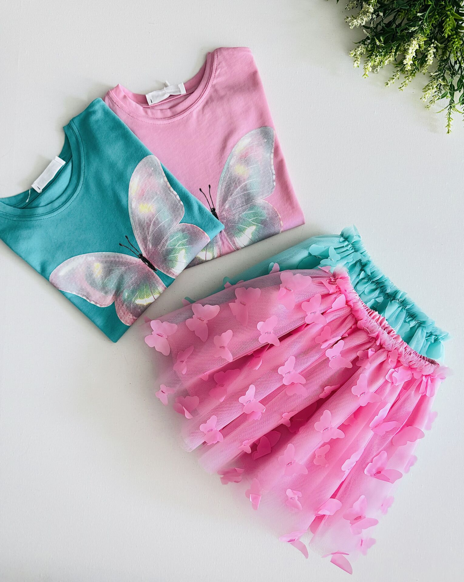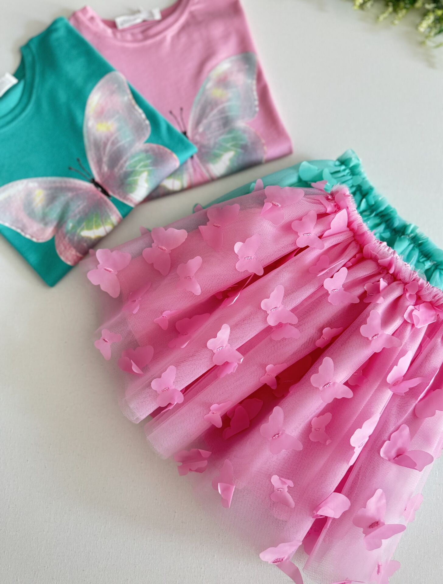 Ürün Bilgisi : Varak kelebek baskılı rahat kesim tişört kelebek aplikeli tütülü etek