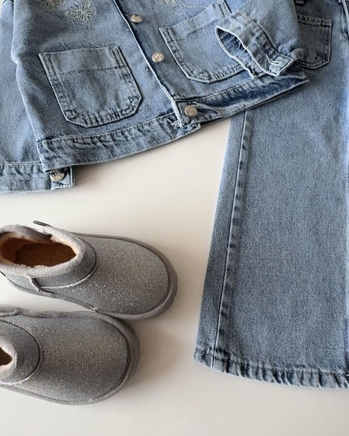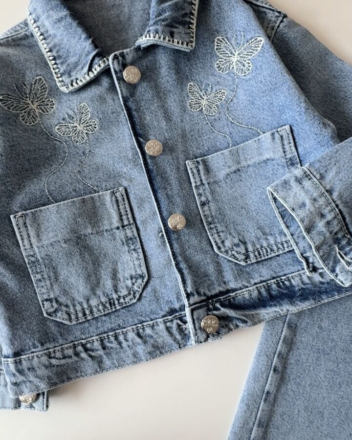 Kelebek Nakışlı Denim 2'li Takım - Mavi
