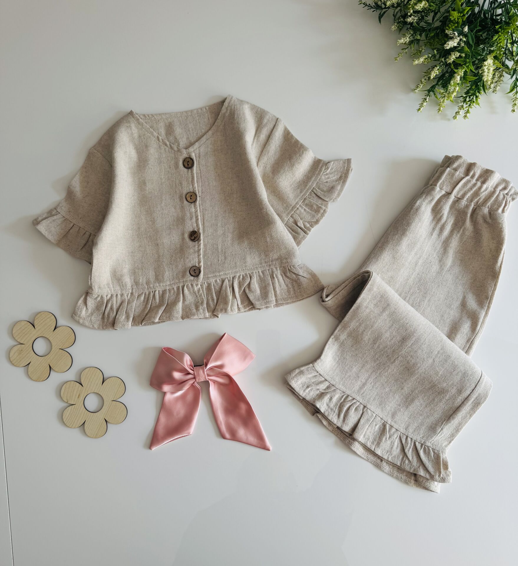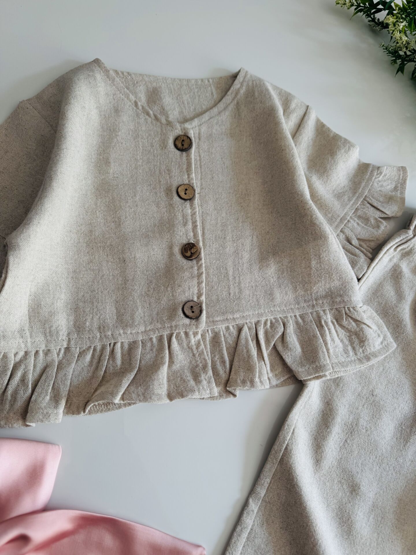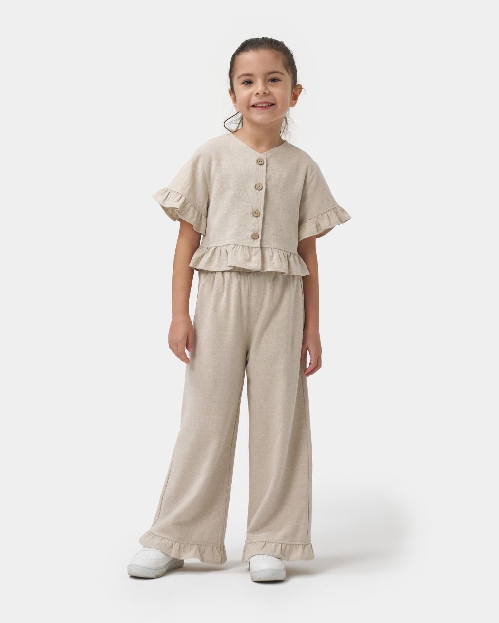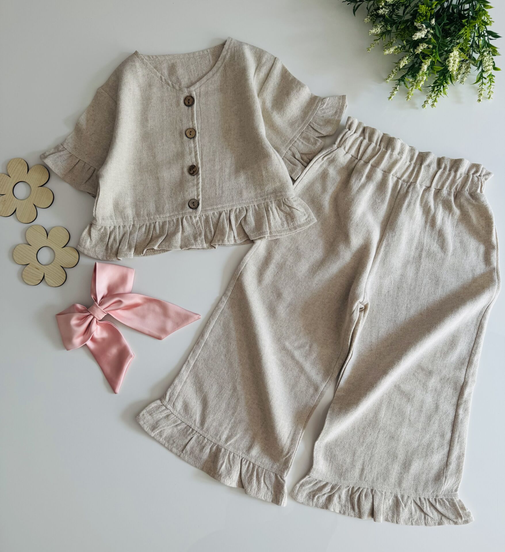 Keten Düğme Detaylı Nehir Takım - Krem
