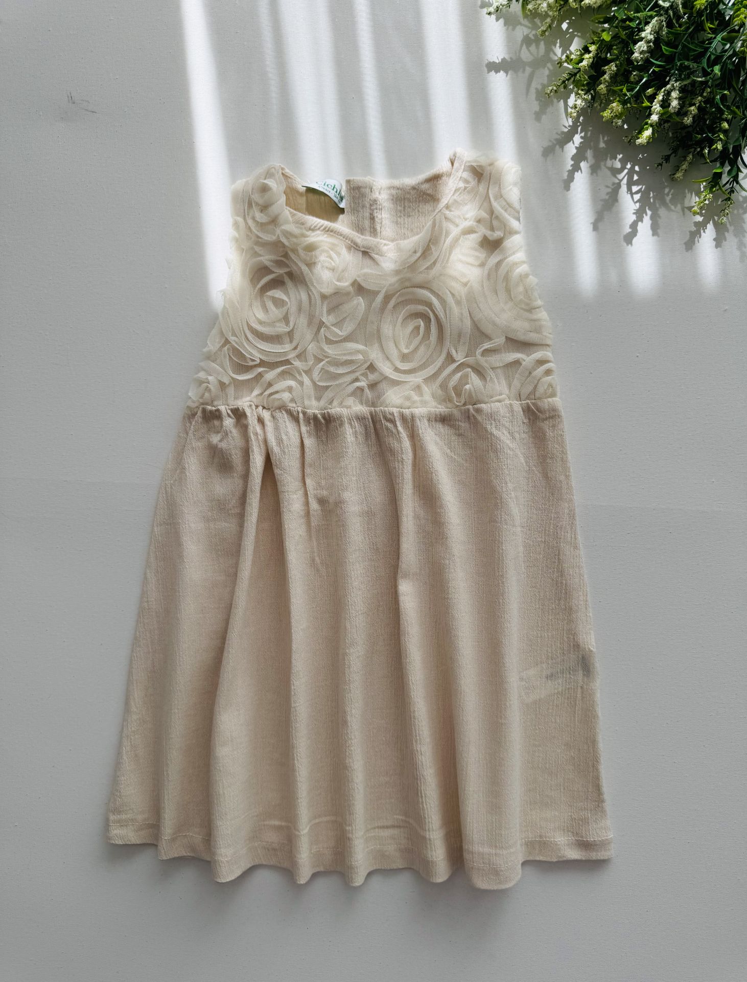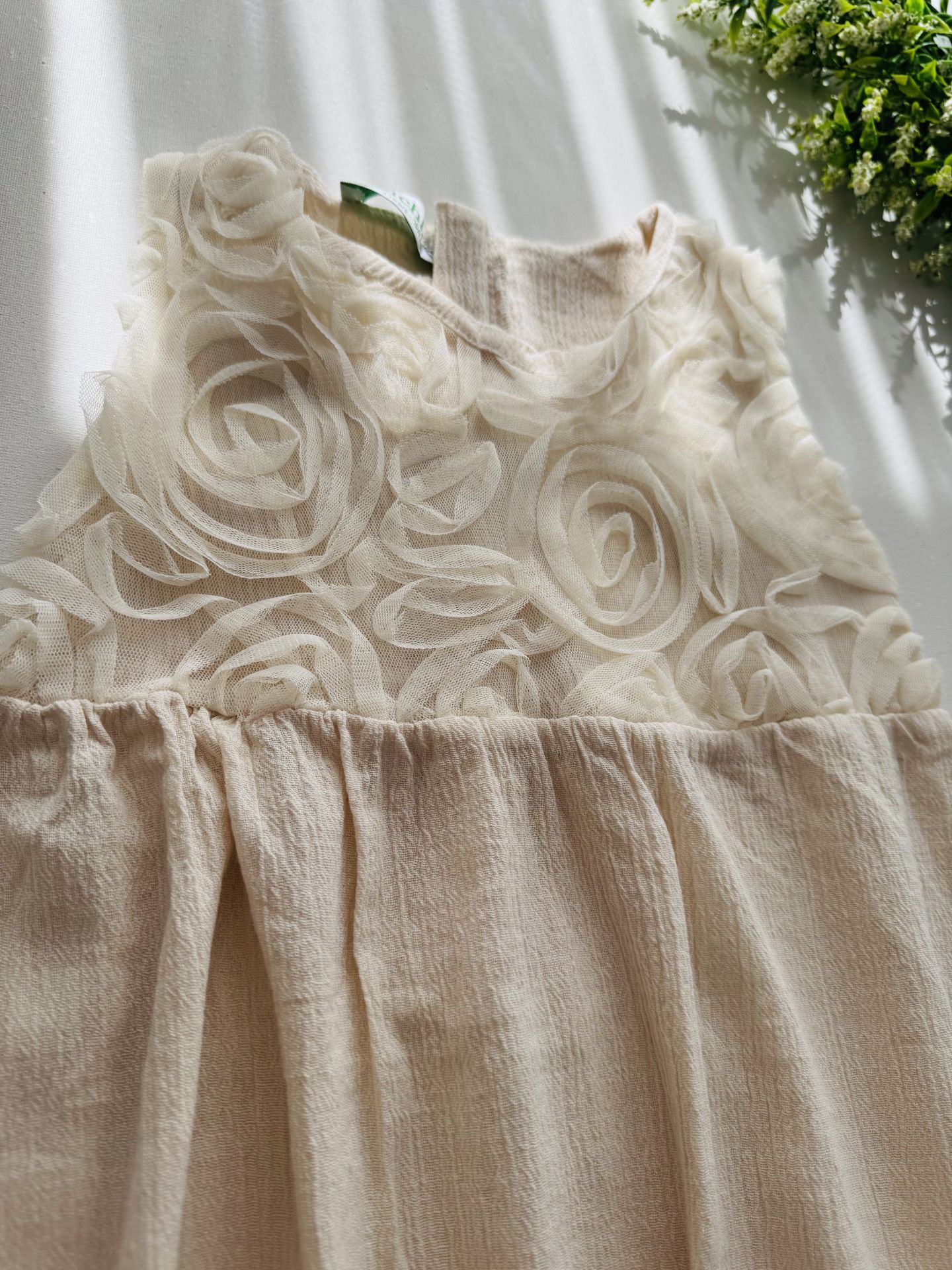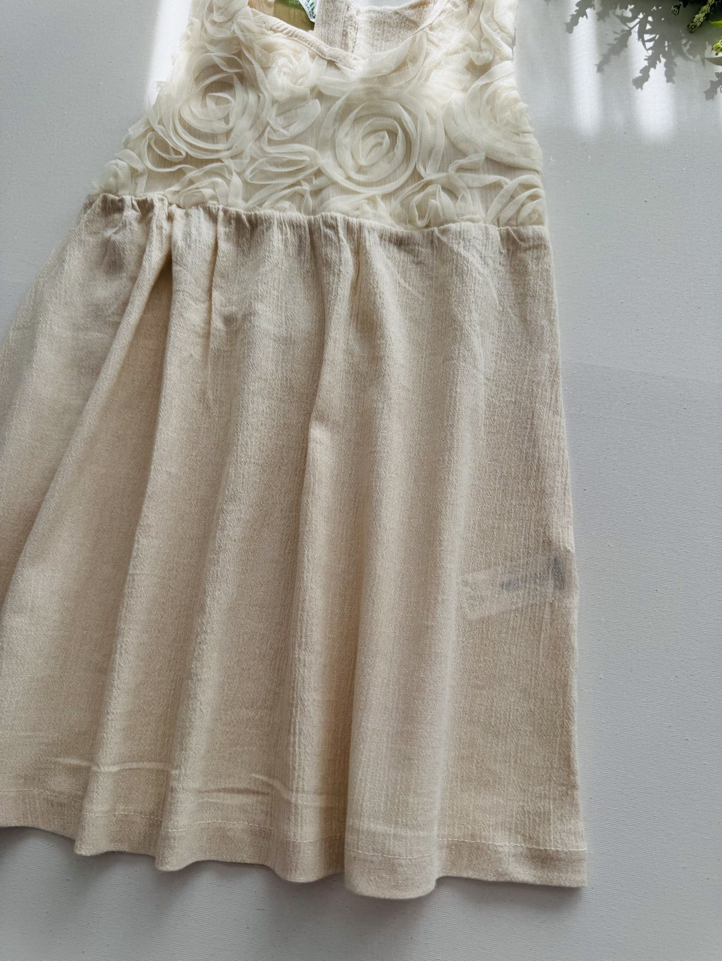 Ürün Bilgisi : Pamuklu keten kumaş üzerine tül gül aplikeli elbise