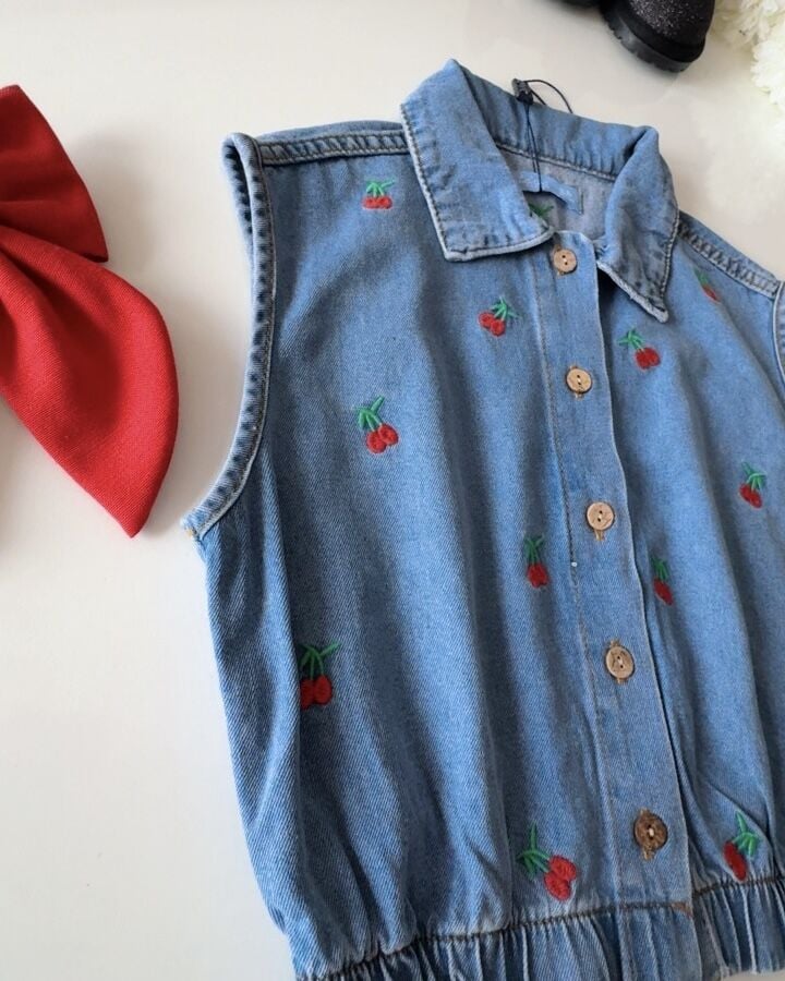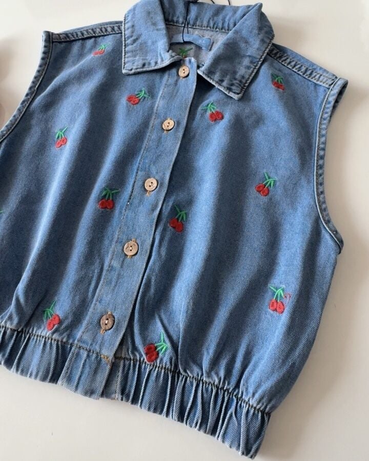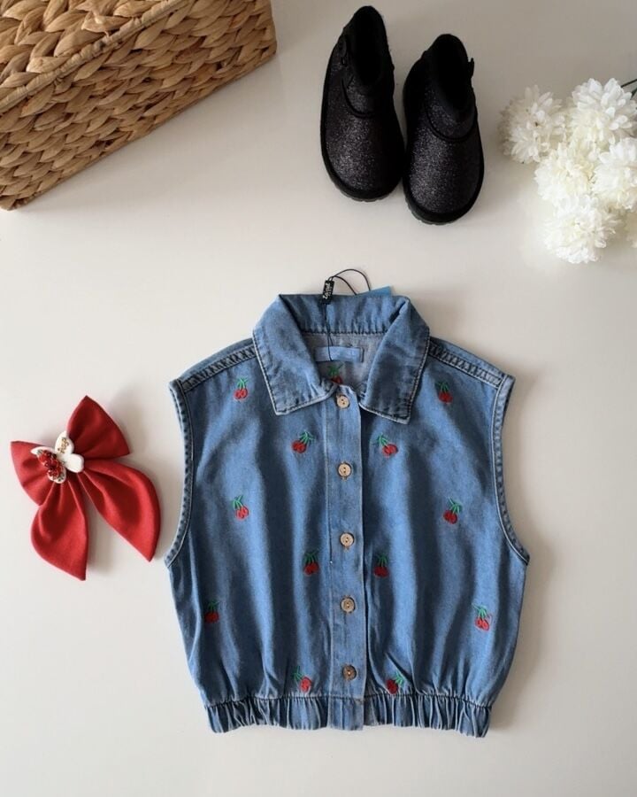 Kiraz Nakışlı Yelek - Mavi