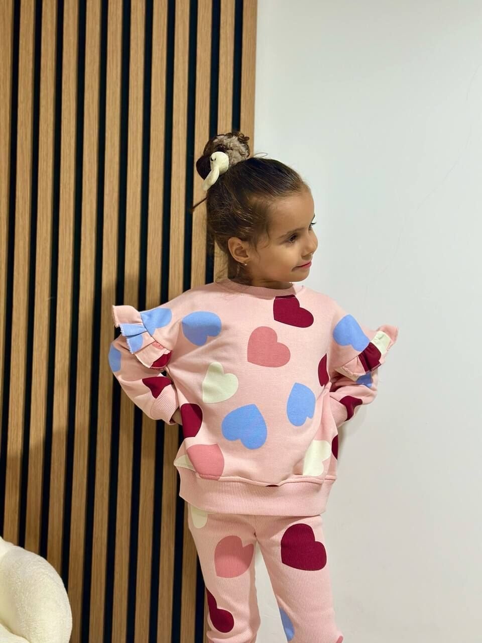 Kolları Fırfırlı Kalp Desenli Taytlı Takım - Pembe