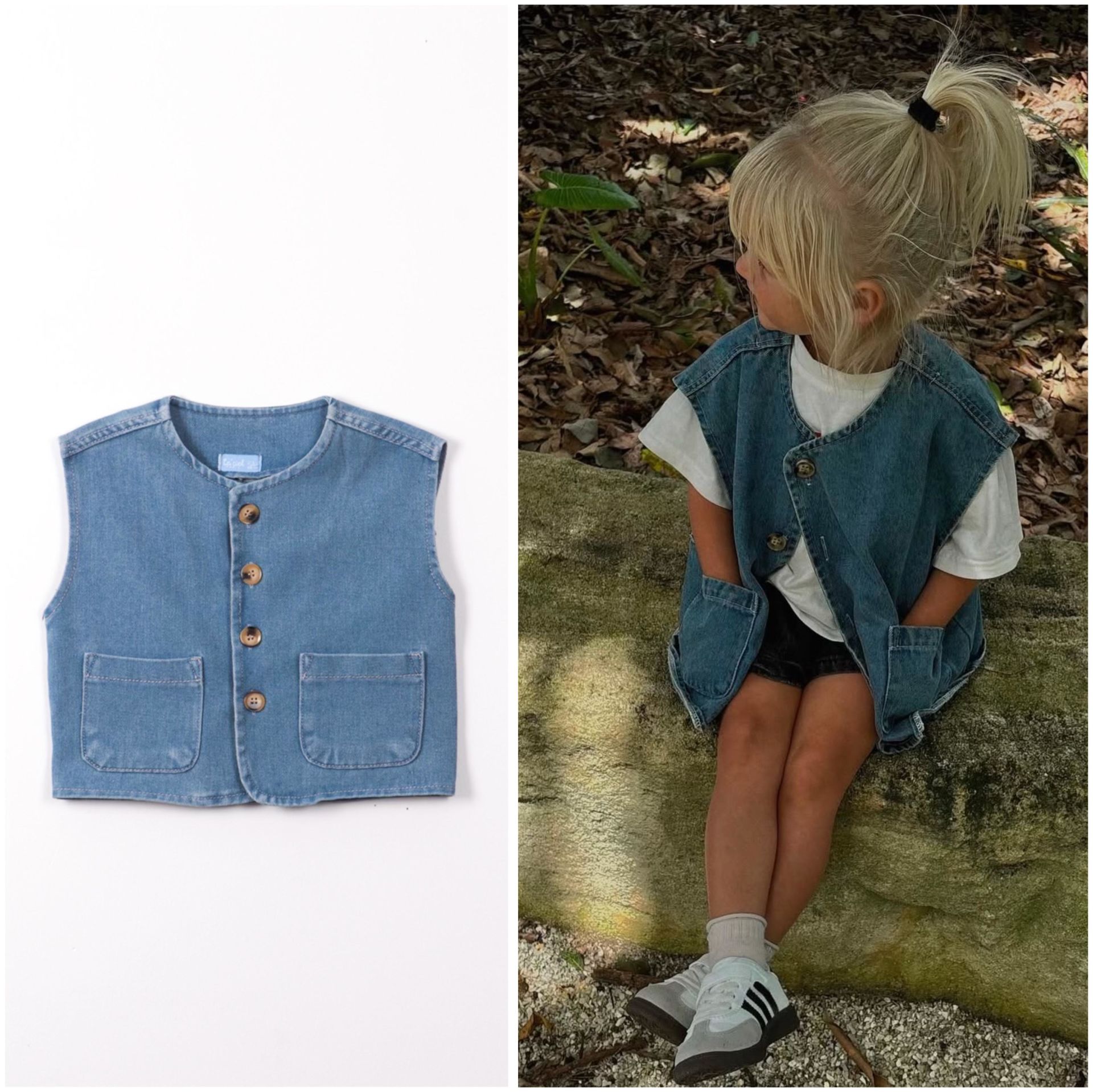 Ürün Bilgisi : Kız erkek kullanımına uygun denim ince mevsimlik yelek. Alt giyim kategorisindeki '' balon '' jeanler ve üst giyim kategorisindeki beyazz basic tişörtlerle kombinlenebilir.