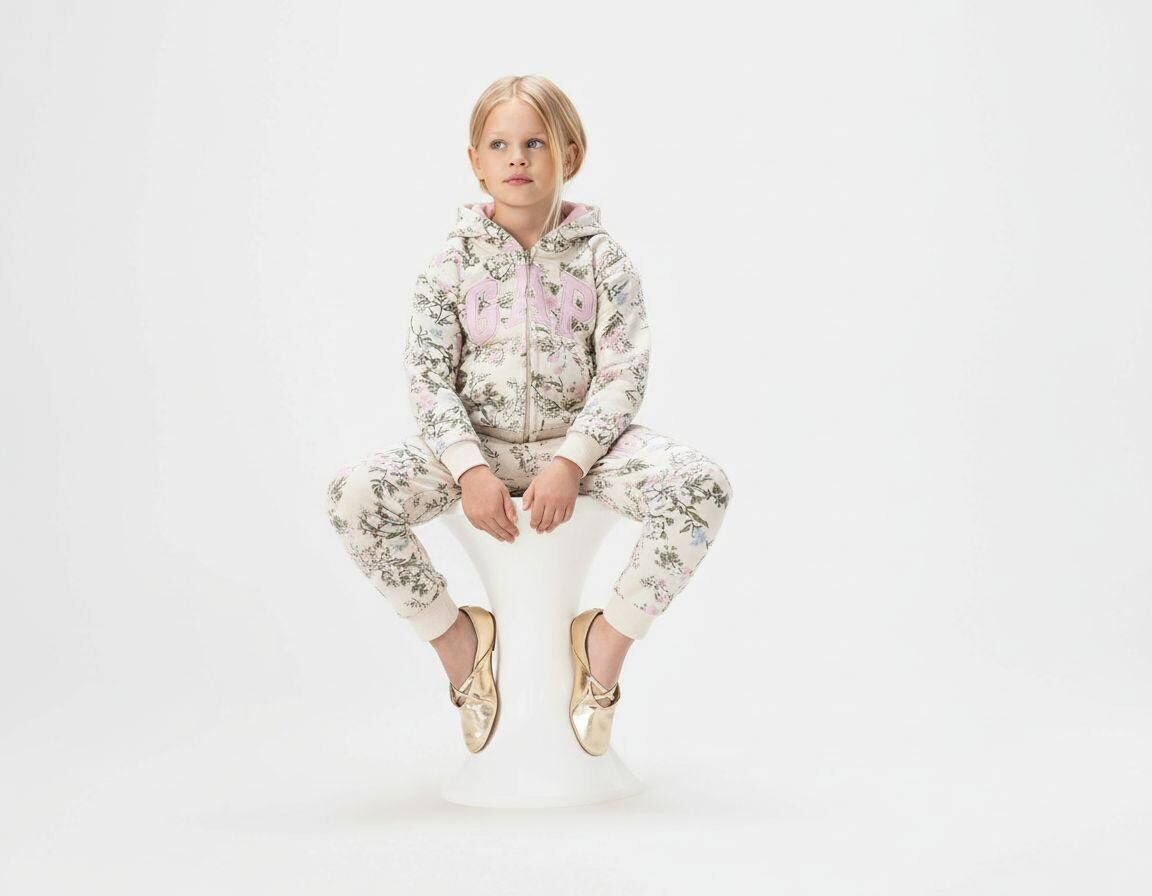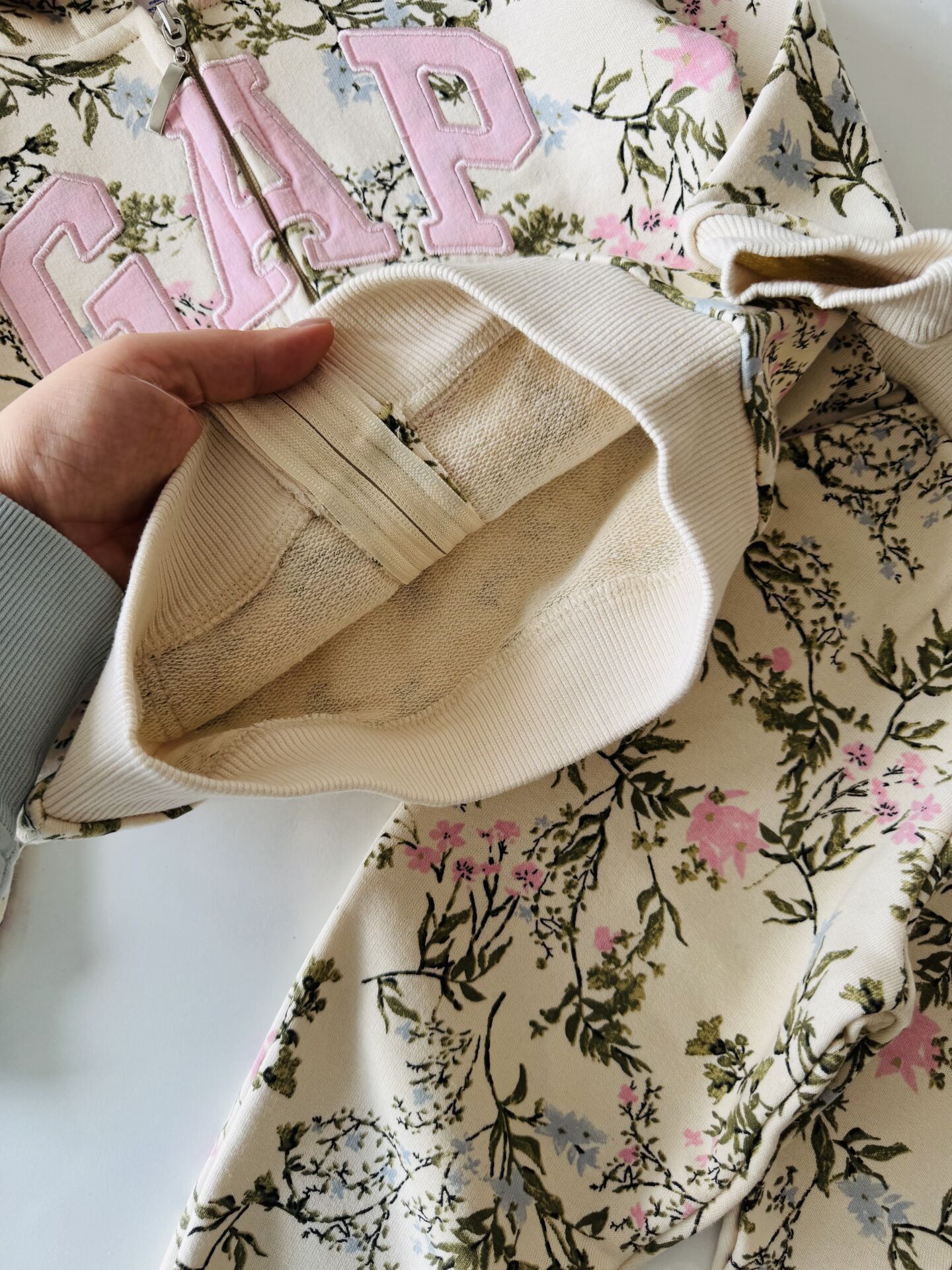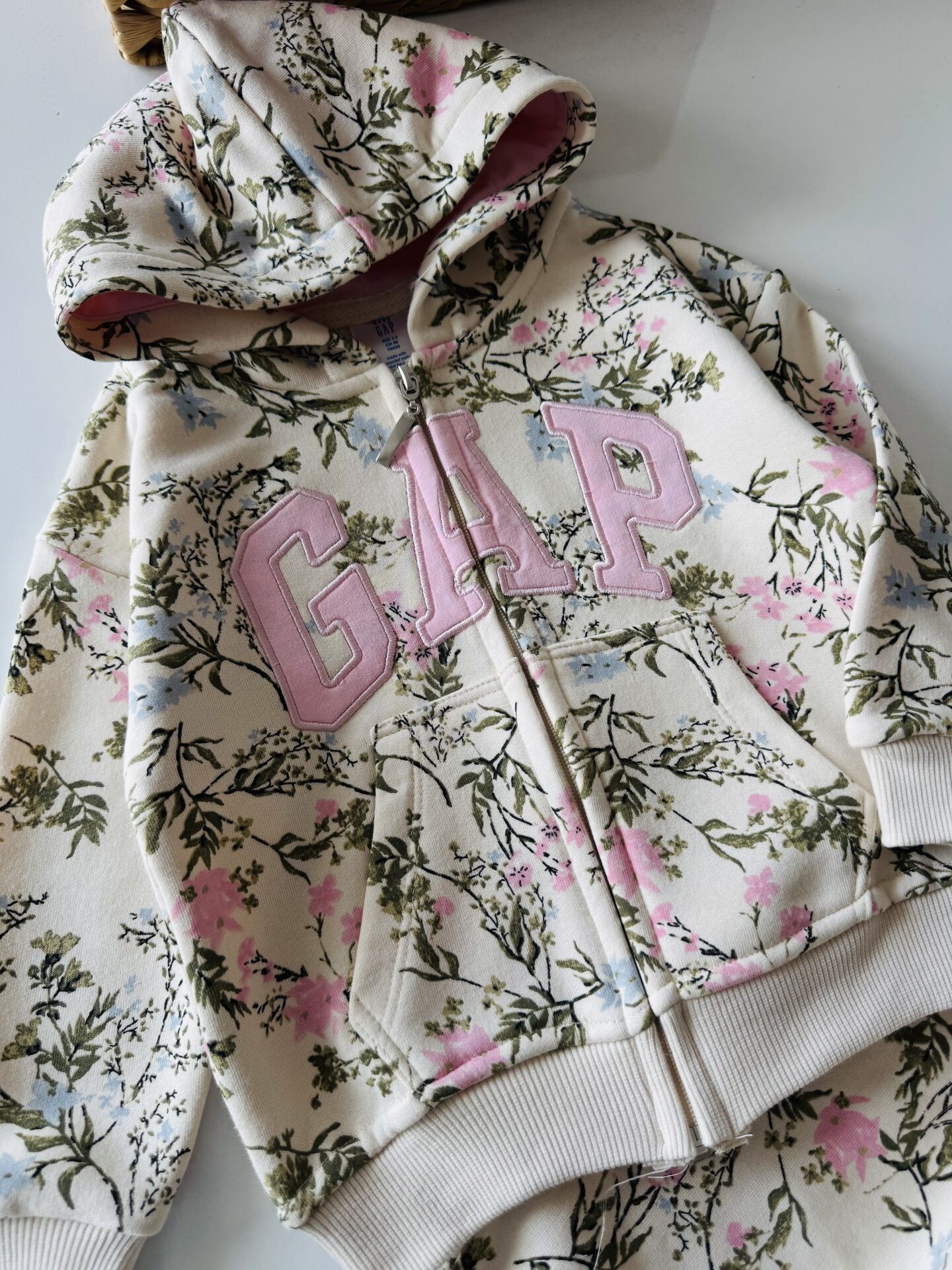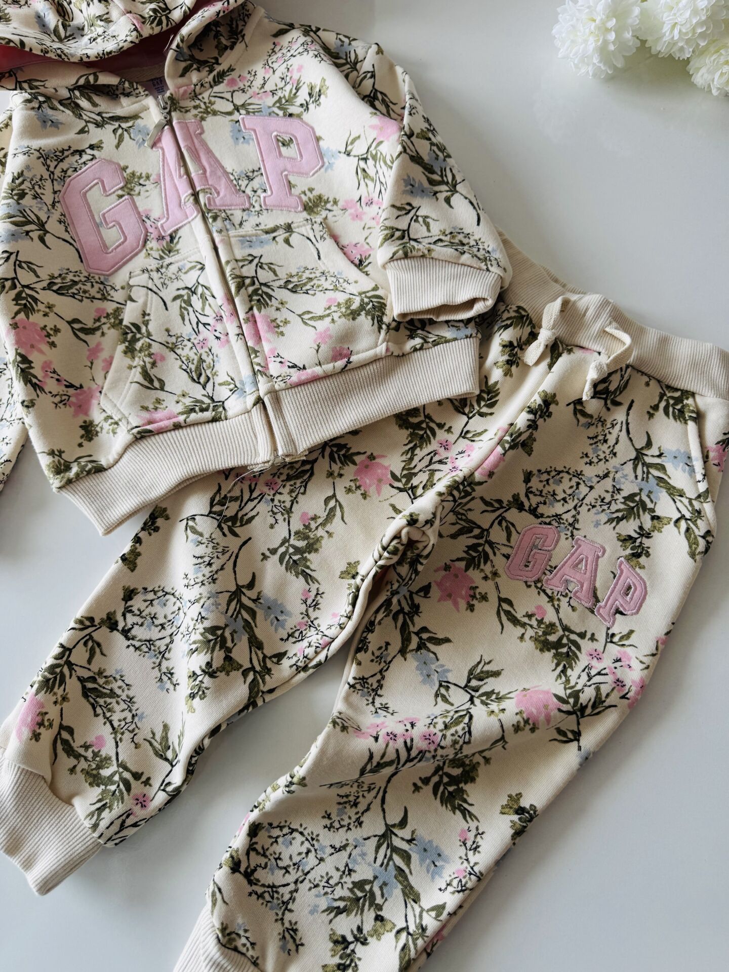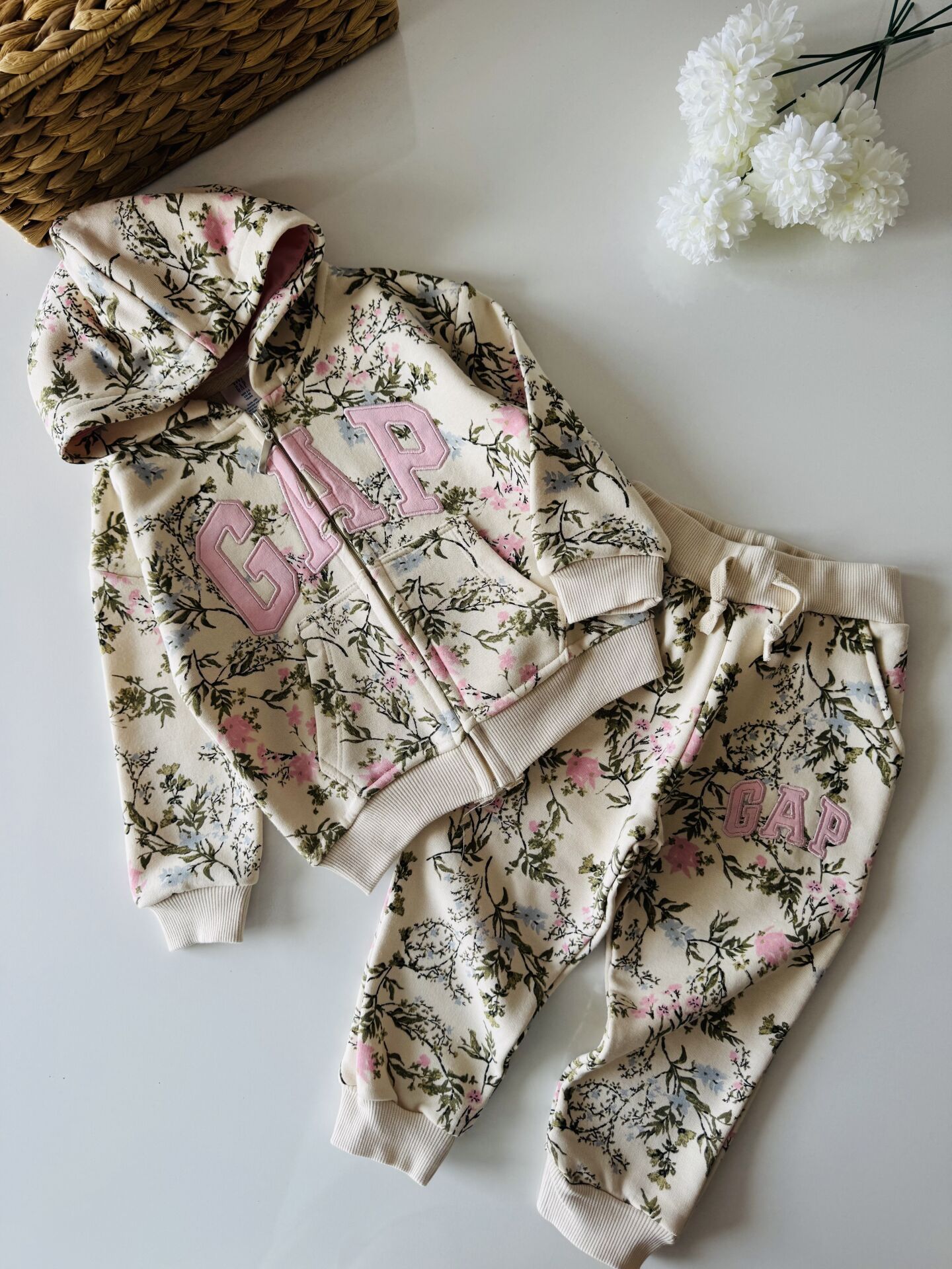 Logolu Çiçek Desenli Kapüşonlu Fermuarlı Eşofman Takımı - Ekru