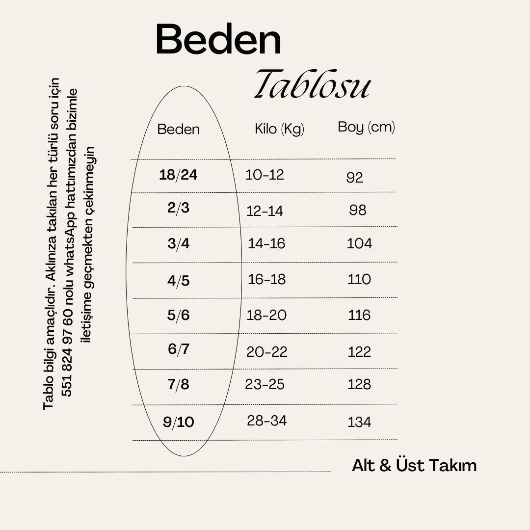 4/5 yaş Etek Beli Lastikli 24 cm / Etek Boyu : 29 cm - Üst iki koltuk arası eni : 40 cm / Omuzdan Boyu : 46 cm