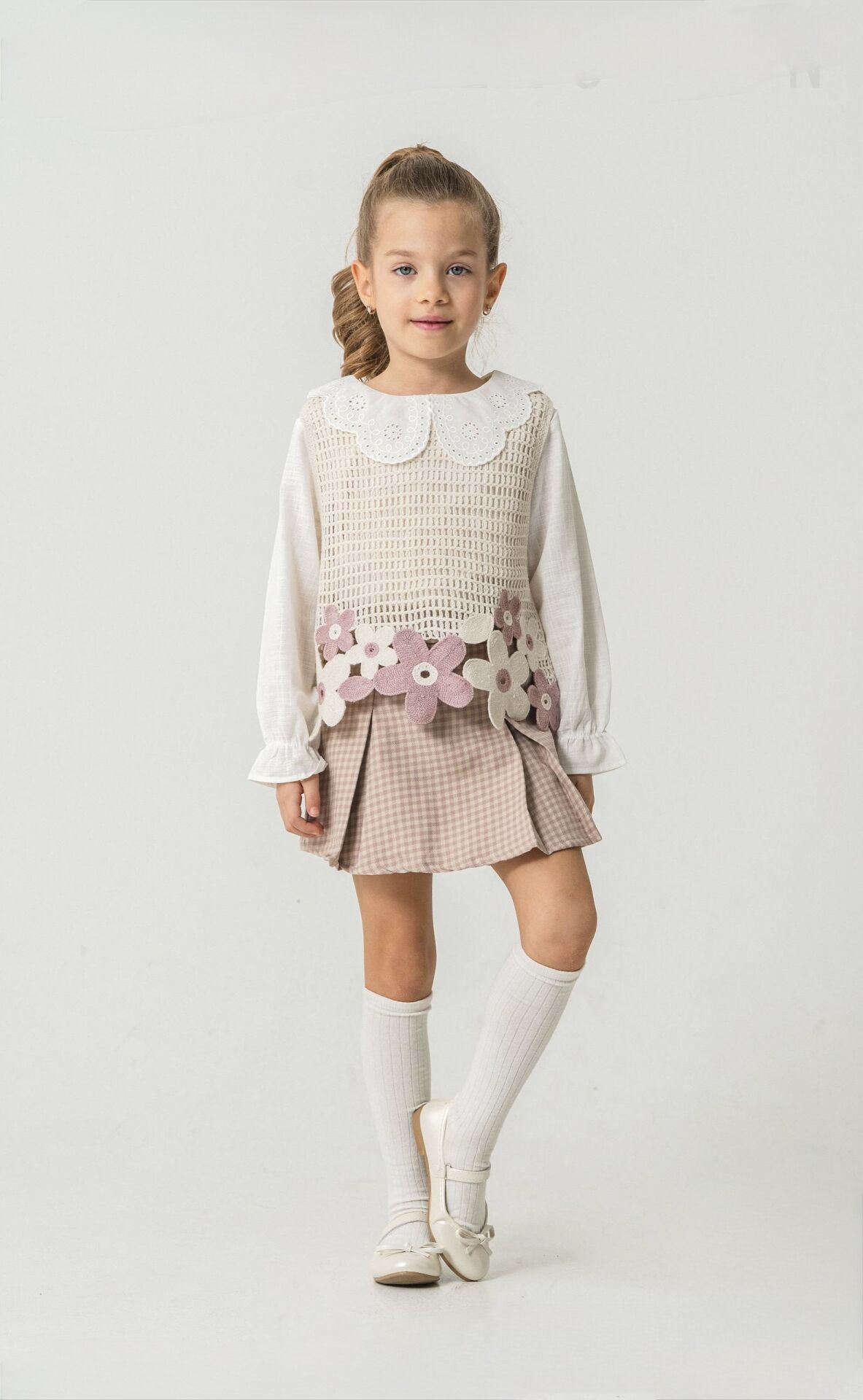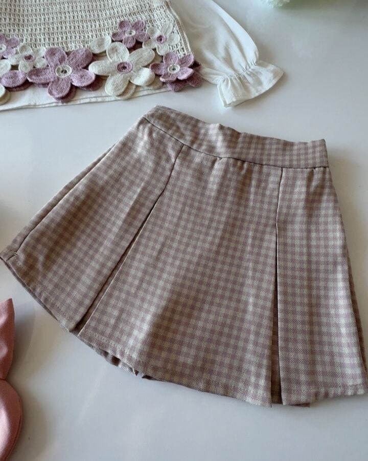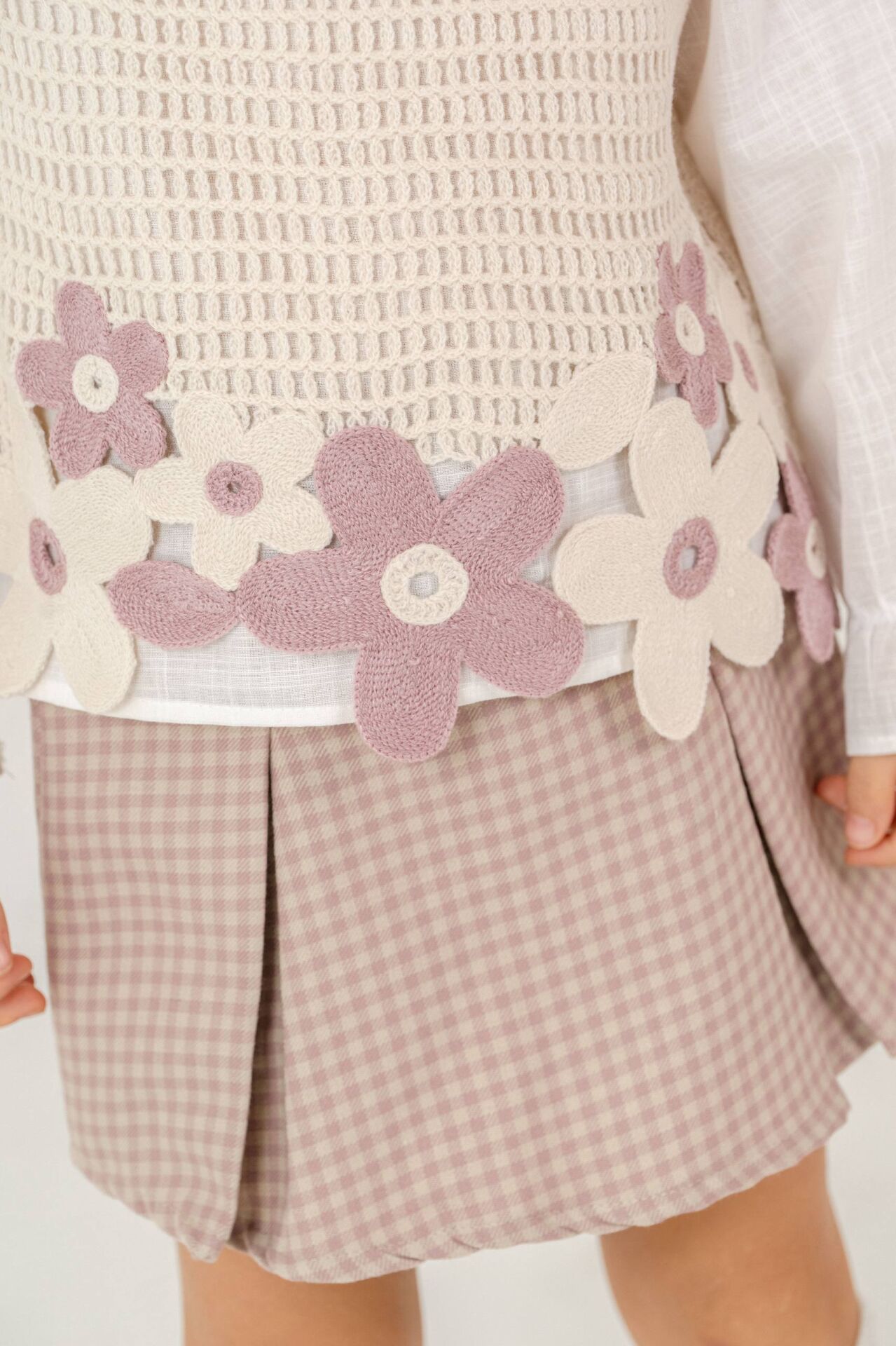 ‣ Dokuma kumal şort etek, pamuklu keten gömlek ve örme motifli crop süceter