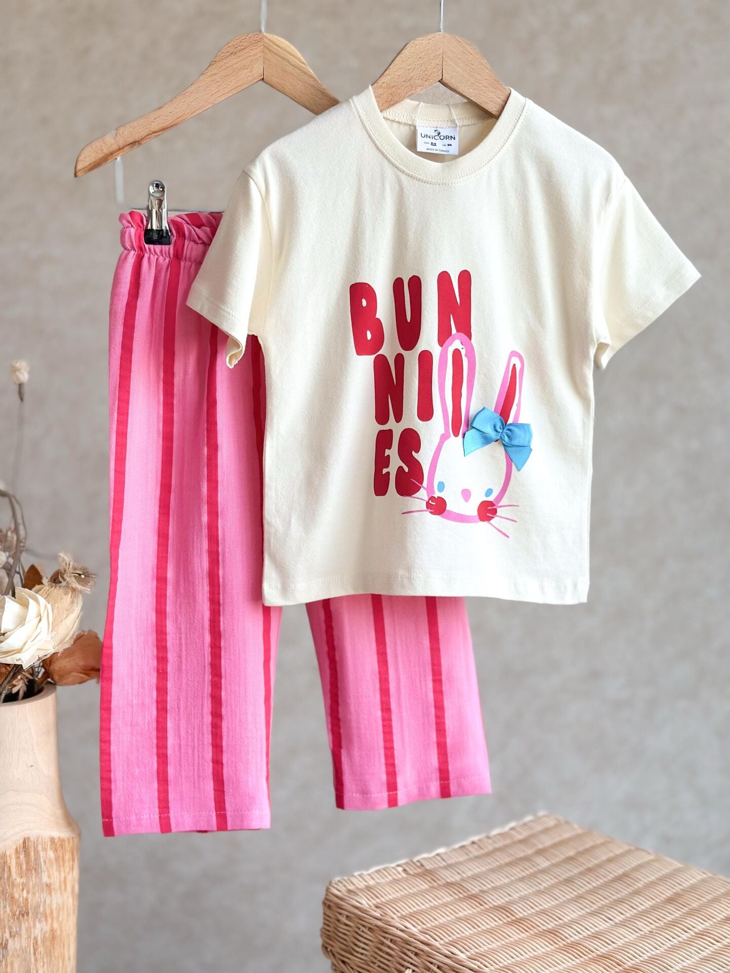 Ürün Bilgisi : Üst pamuklu kumaş kabartma baskılı tişört alt müslin pantolon