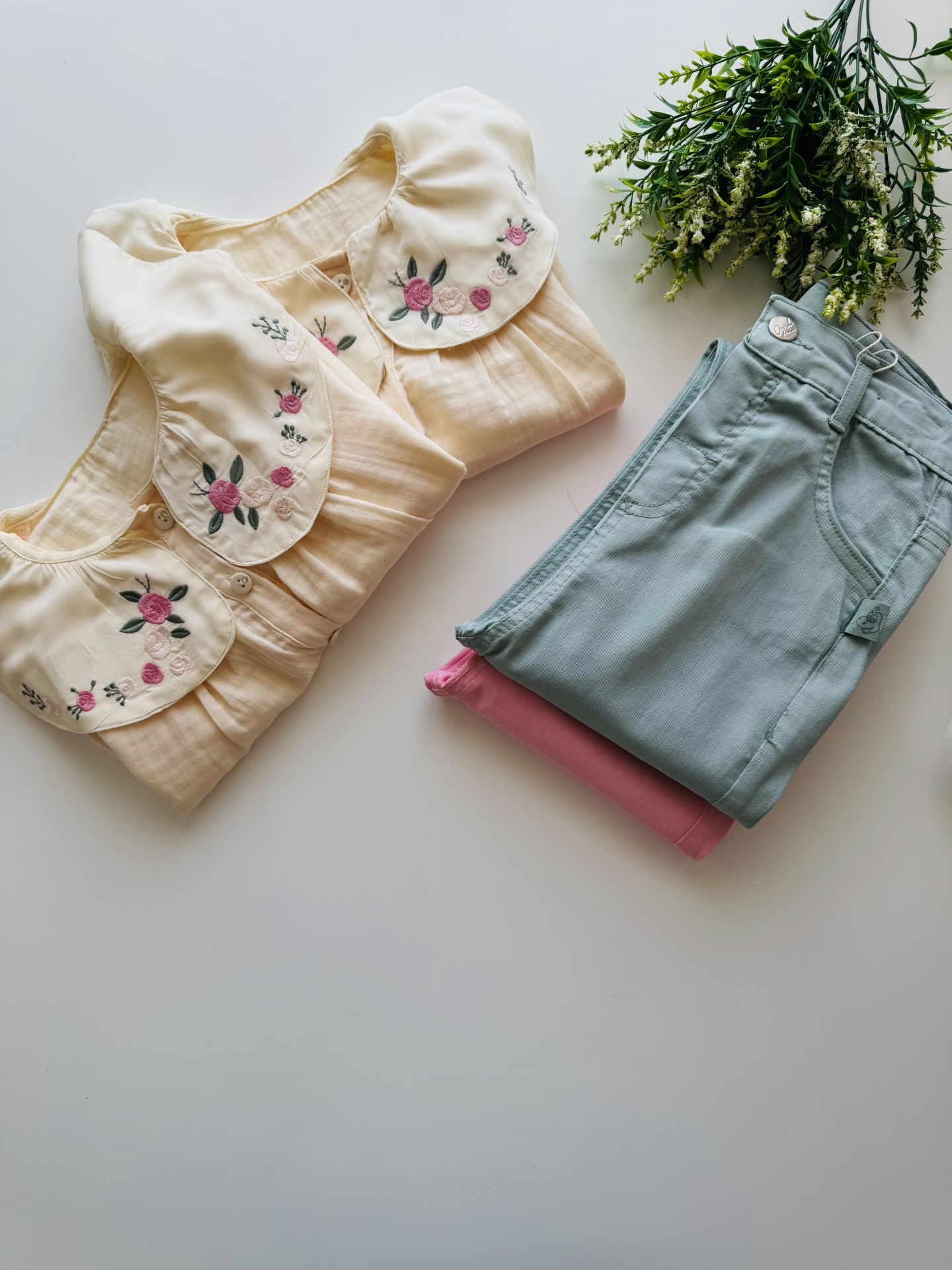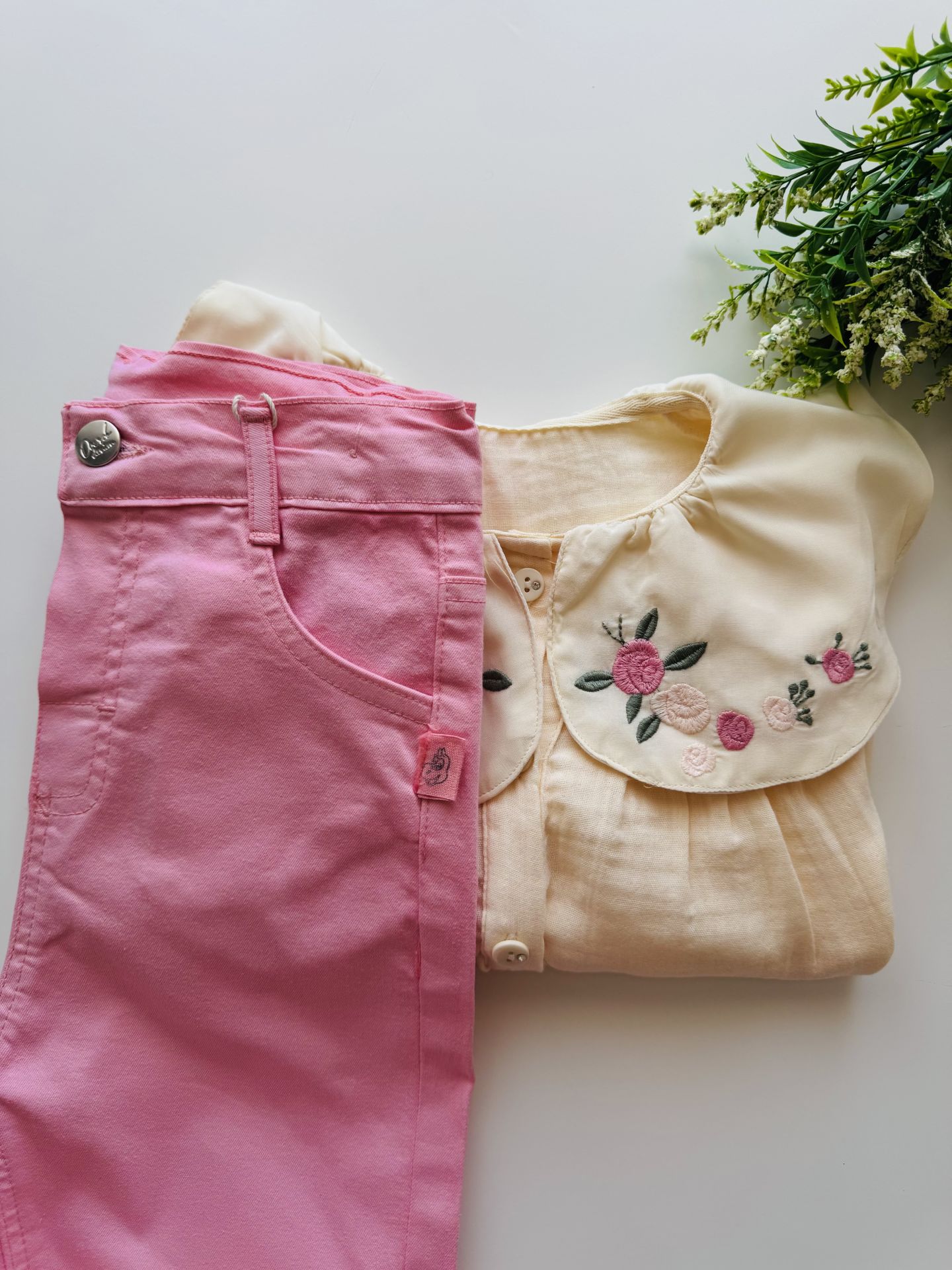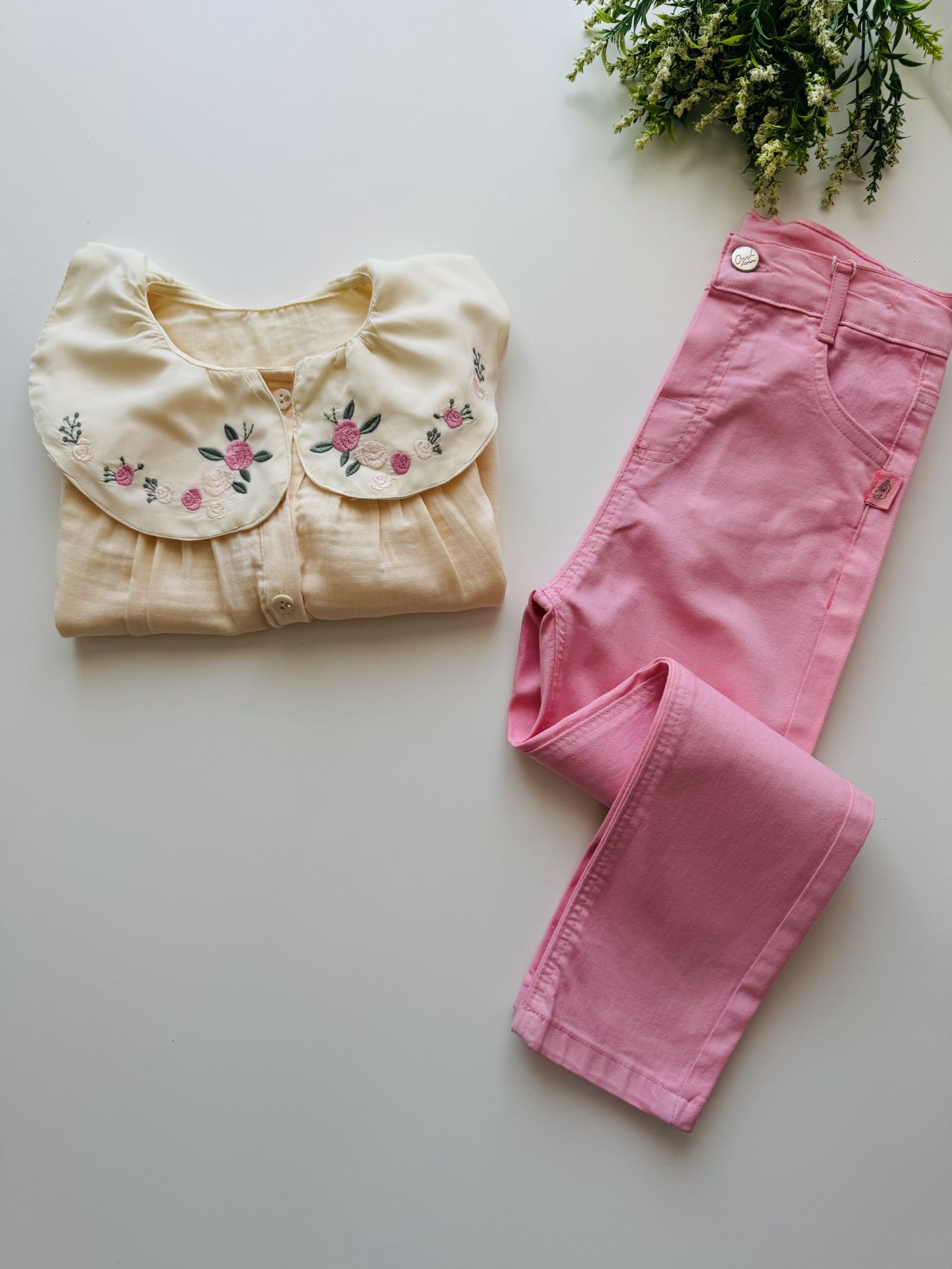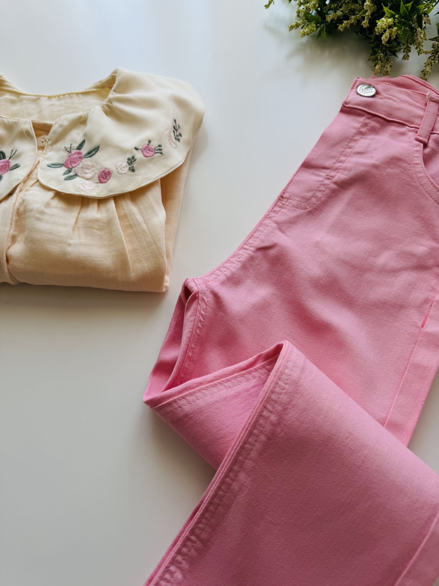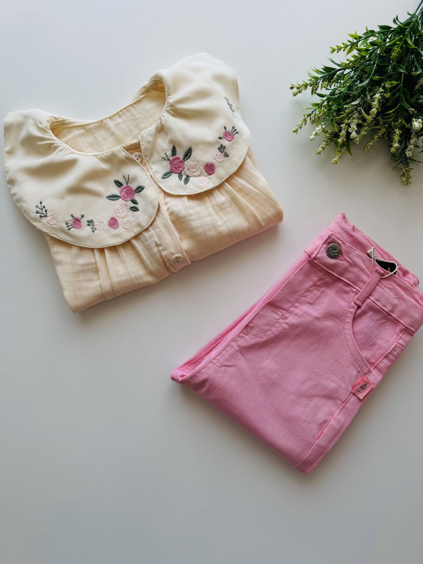 Müslin Gömlek Nakış Yaka Takım - Pembe