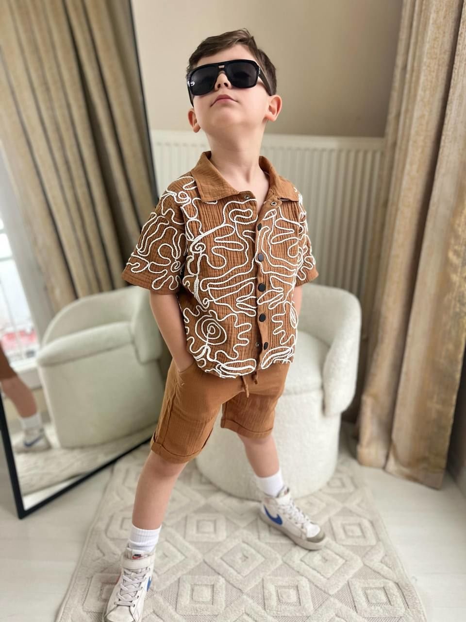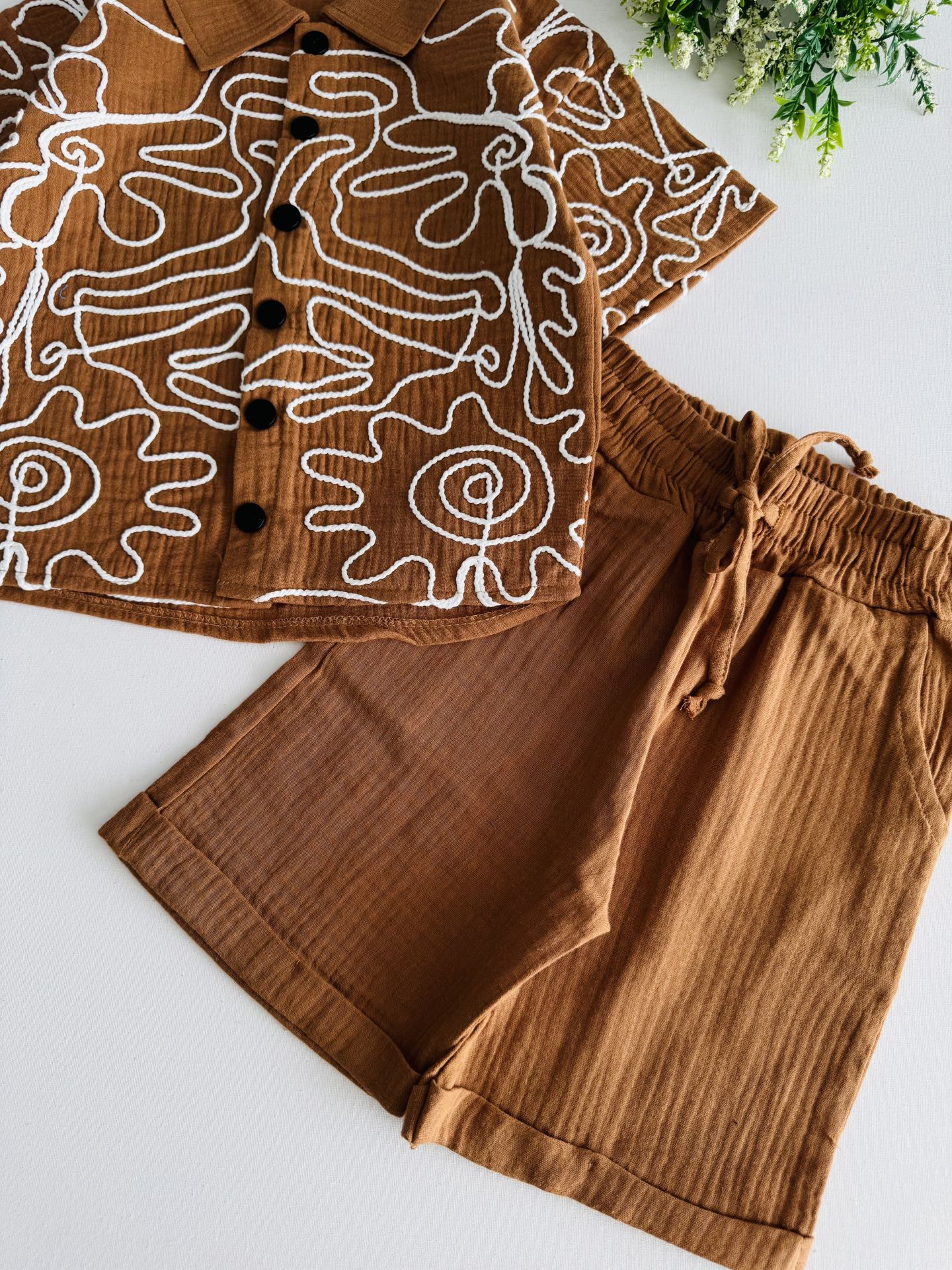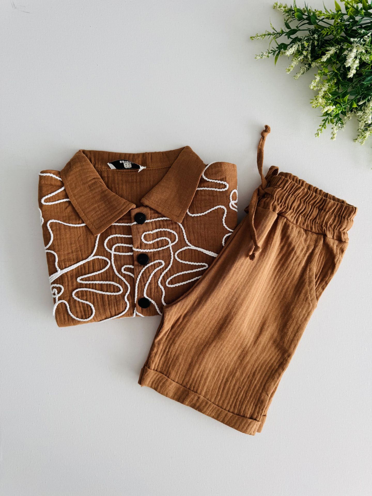Ürün Bilgisi : Müslin kumaş üzerine kumaş kordon nakışlı şortlu takım