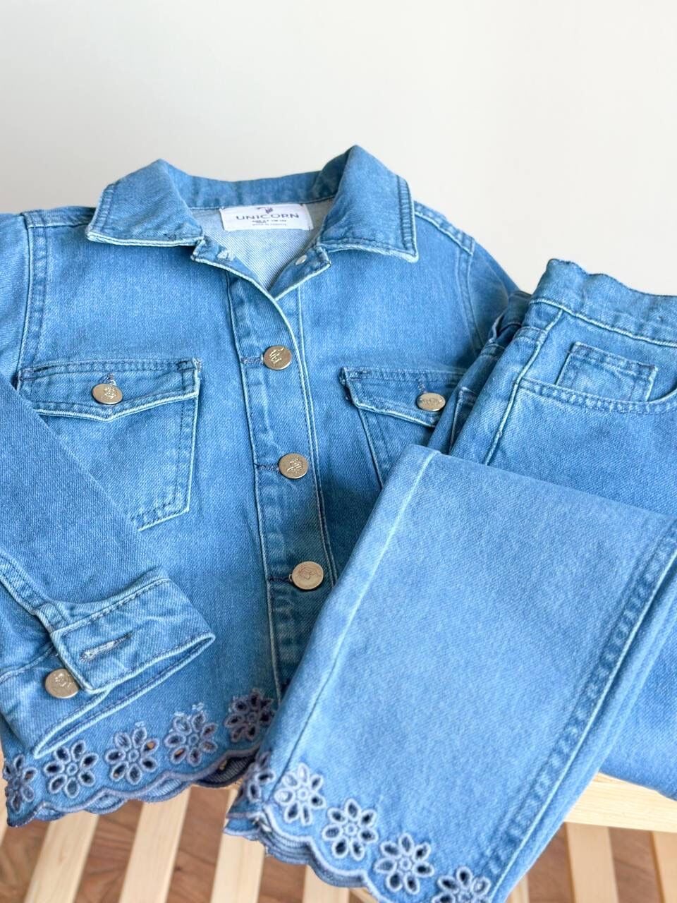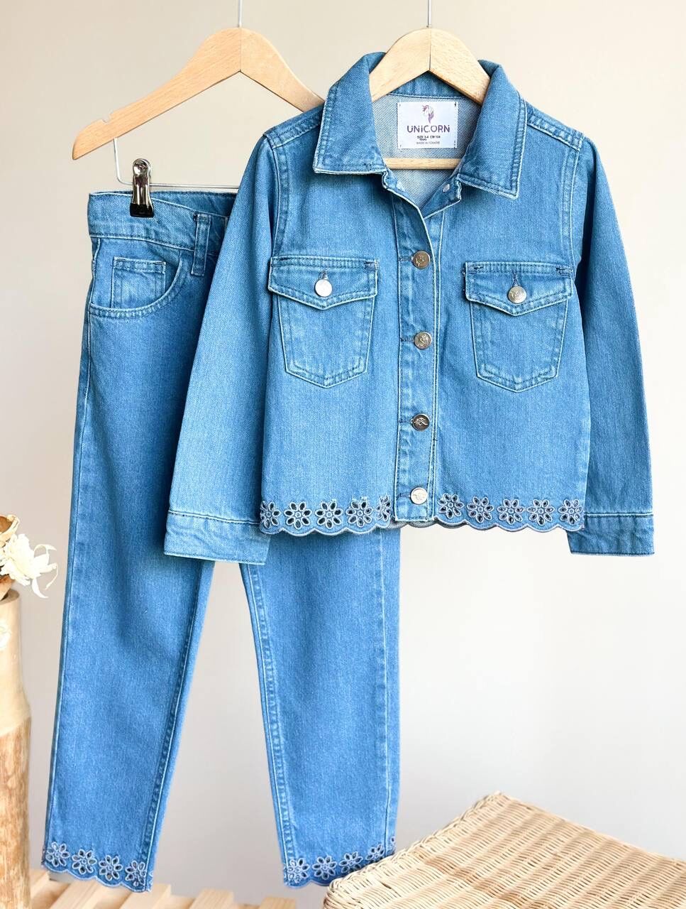 Nakış İşlemeli Denim Takım - Mavi