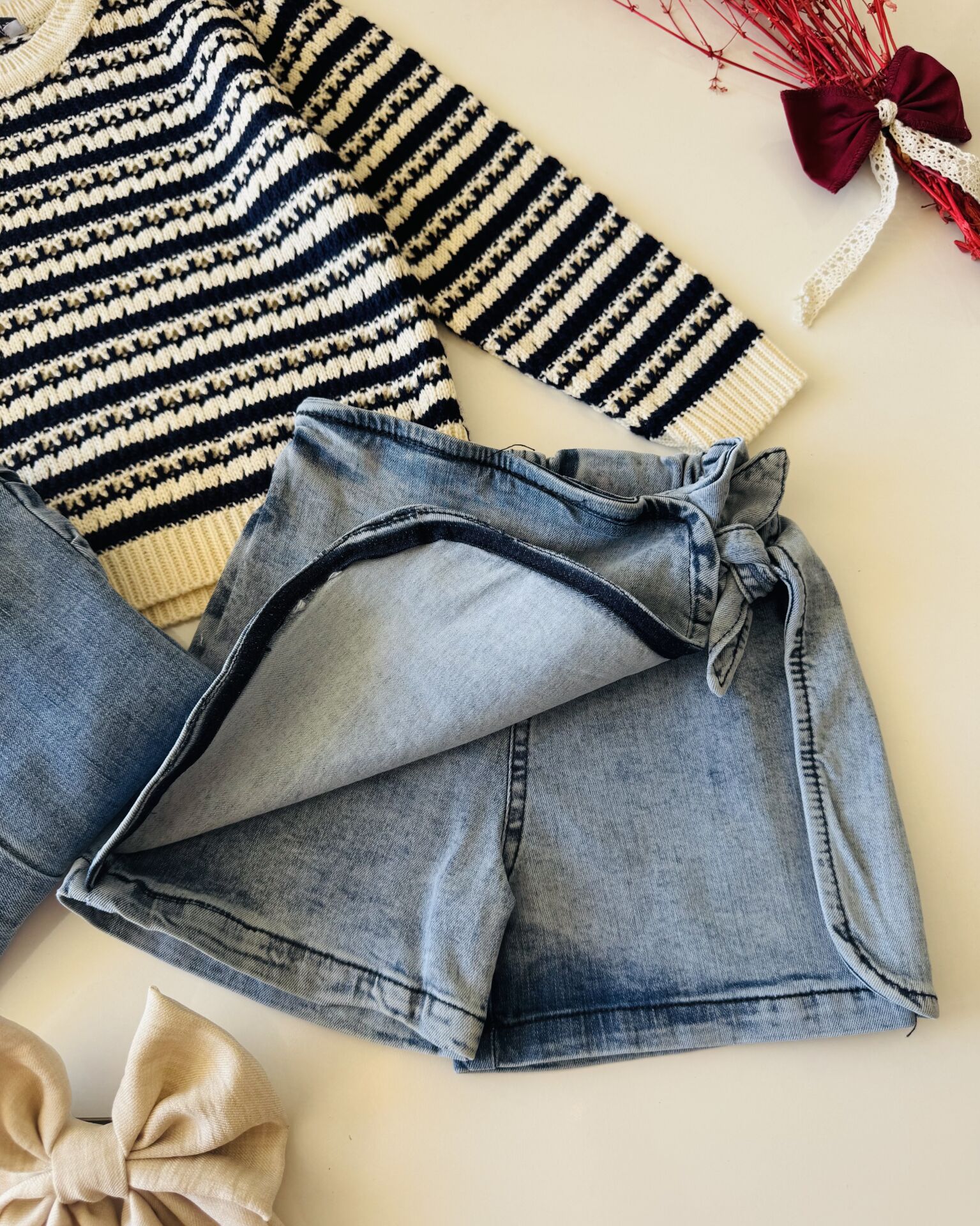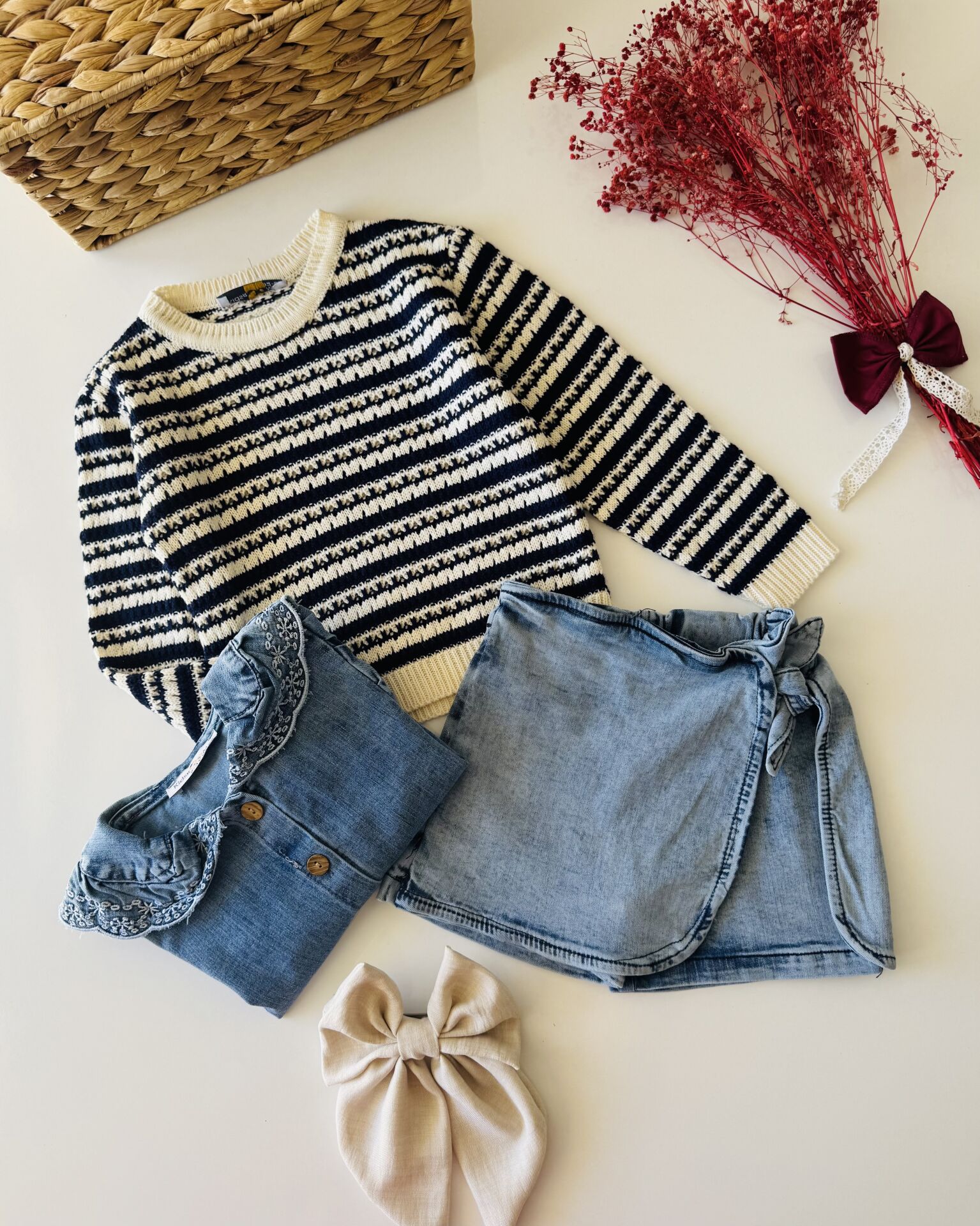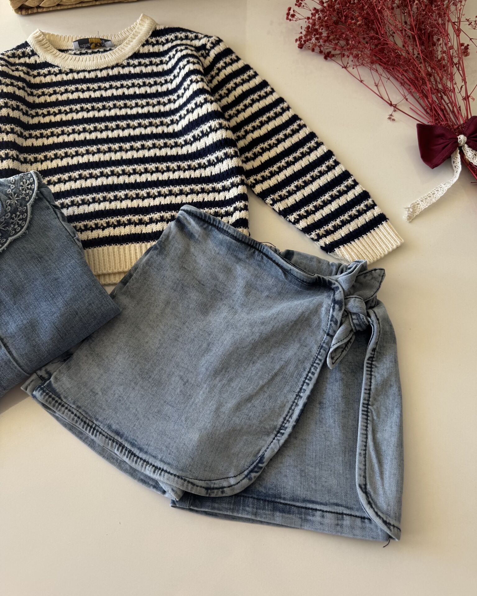 Ürün Bilgisi ; Üst bebe yaka nakışlı, alt şort etek