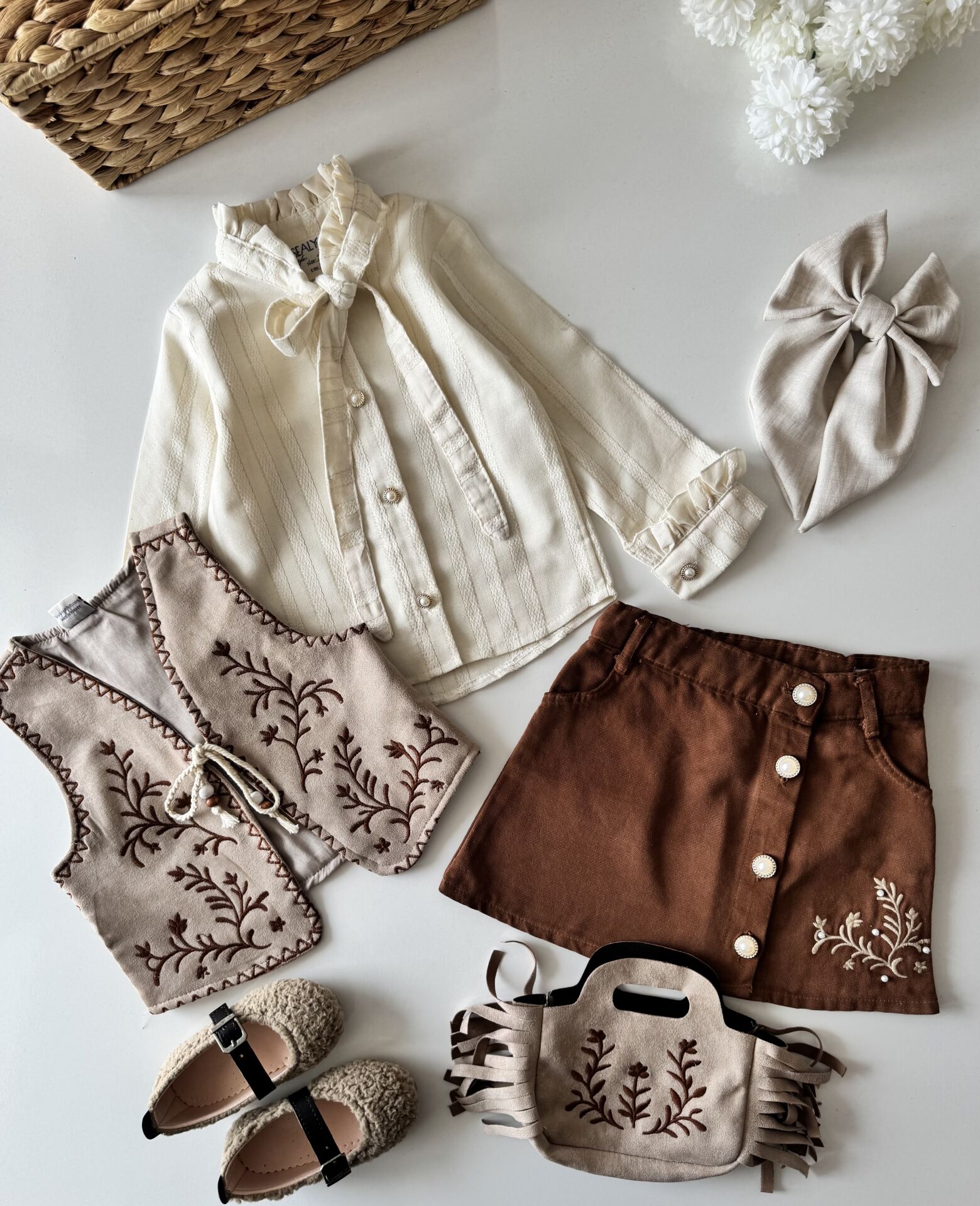 Ürün Özellikleri: Yelek, Gömlek, Etek ve Çantadan oluşmaktadır.
