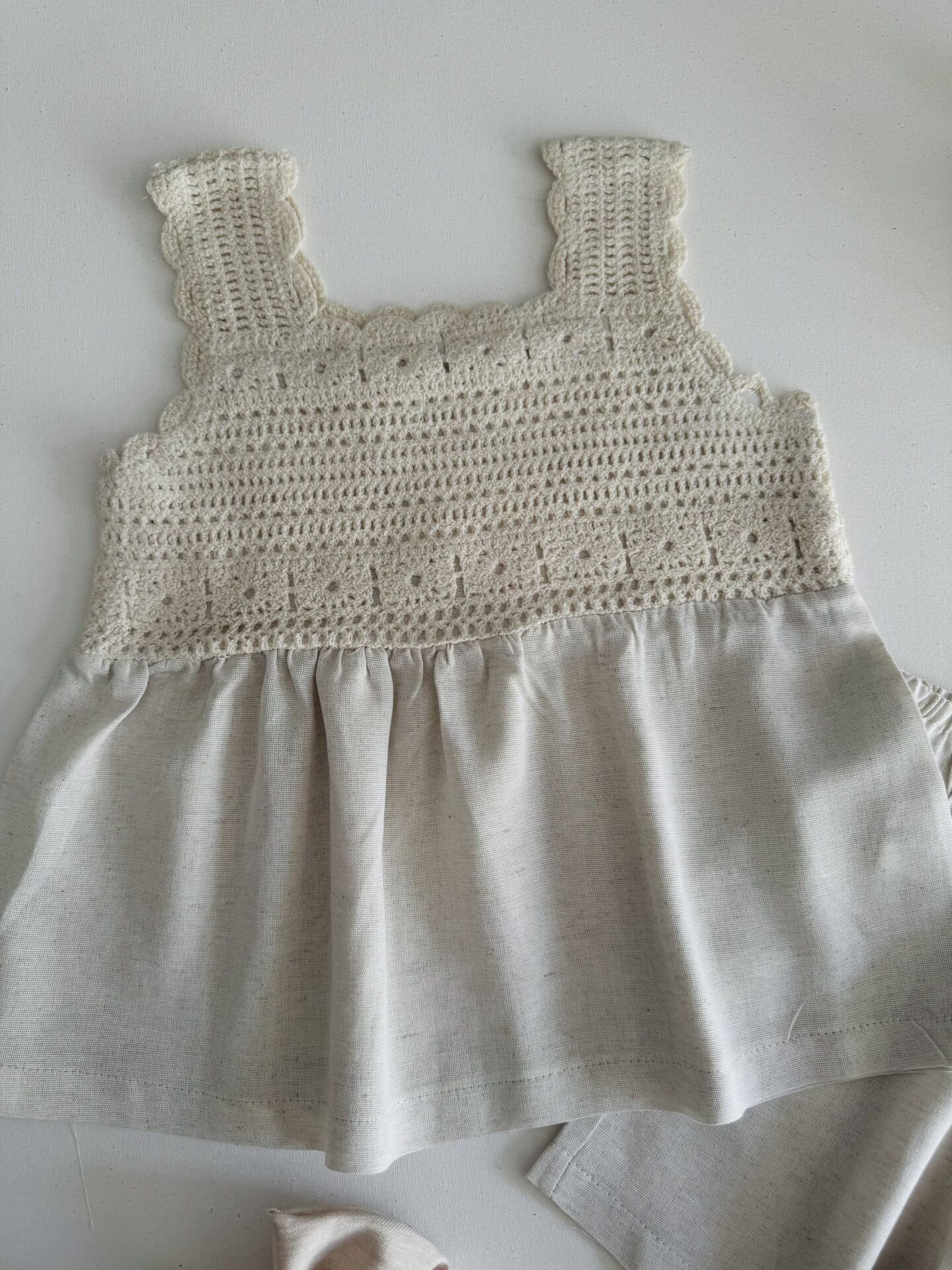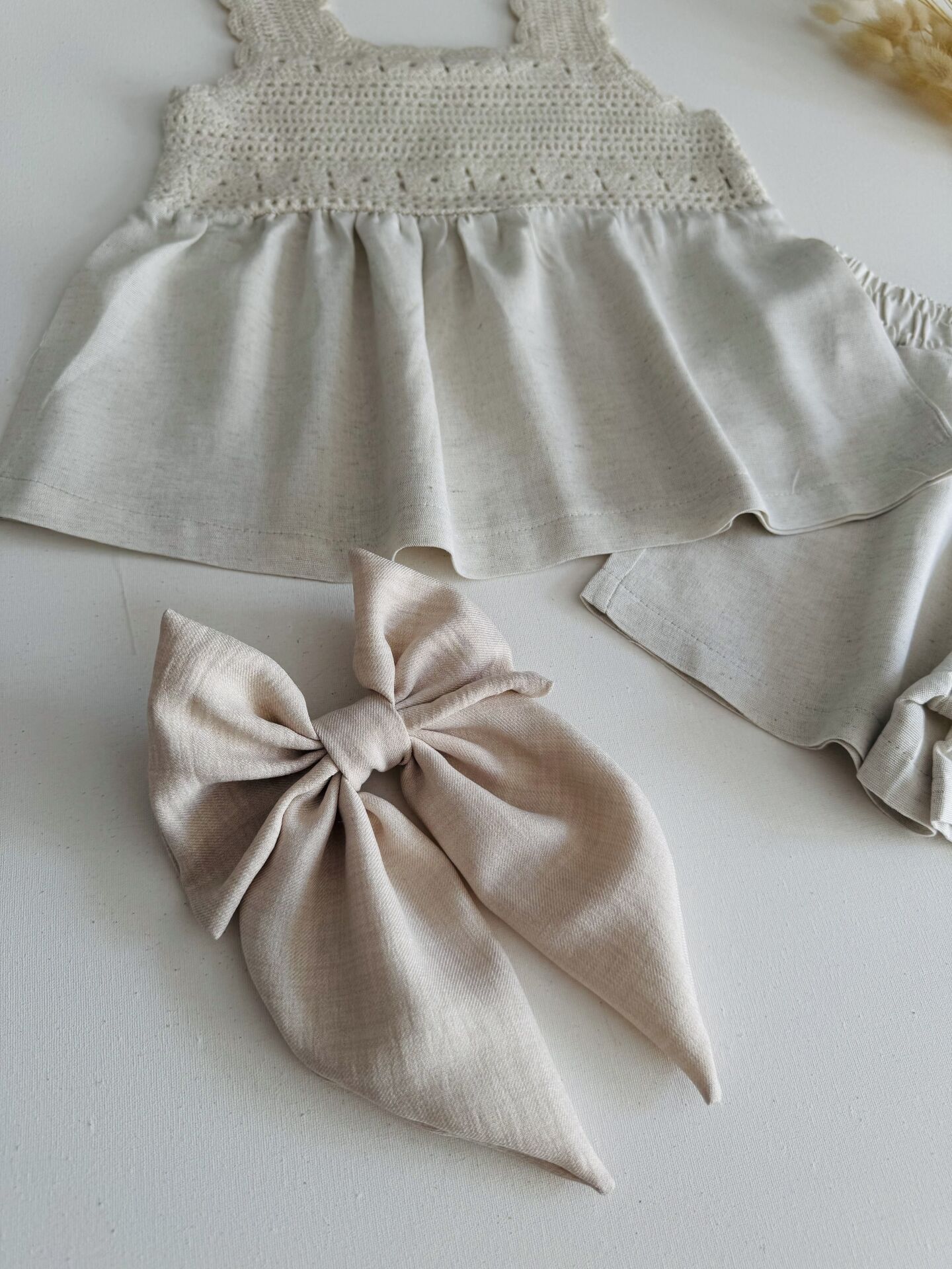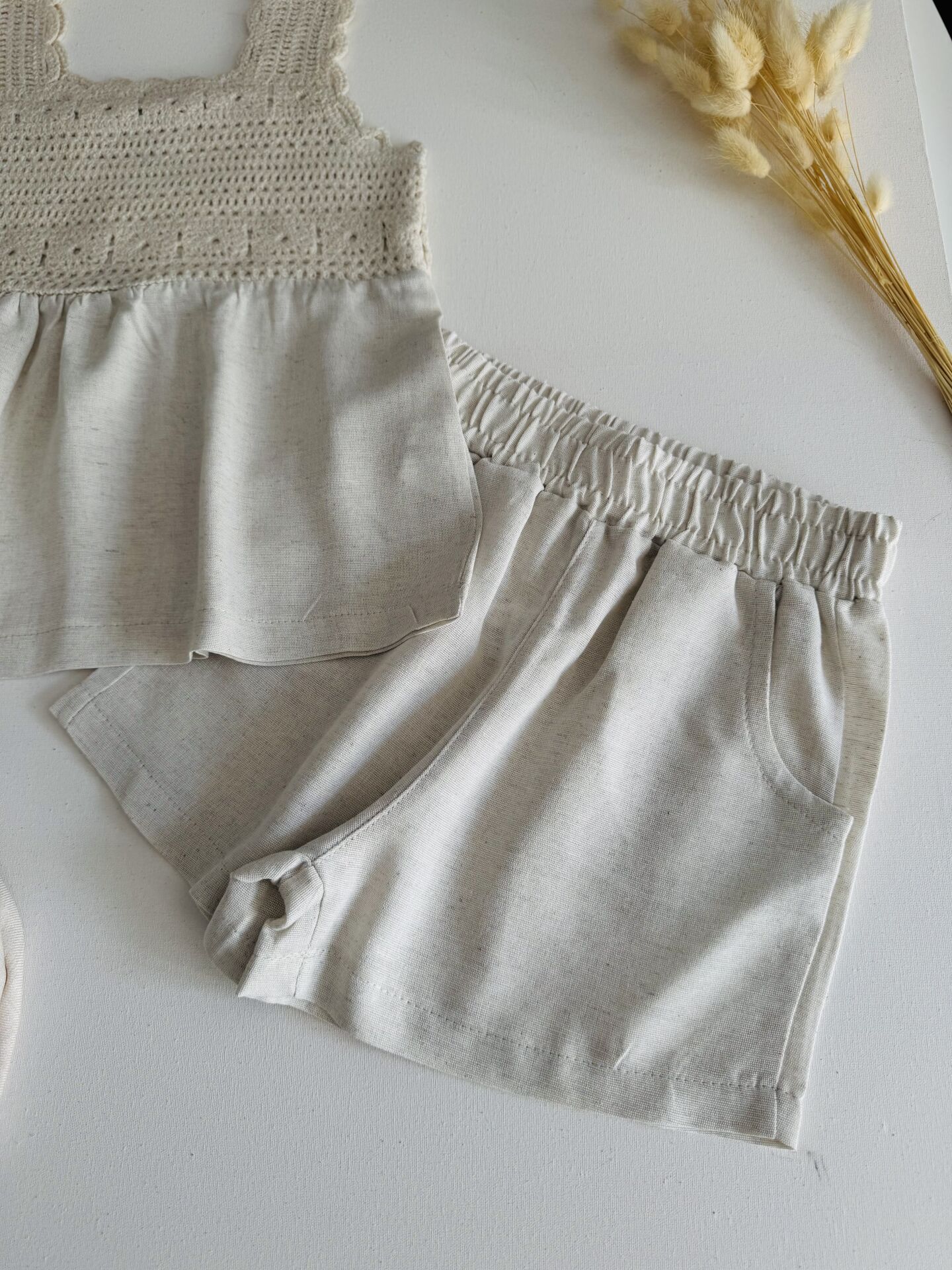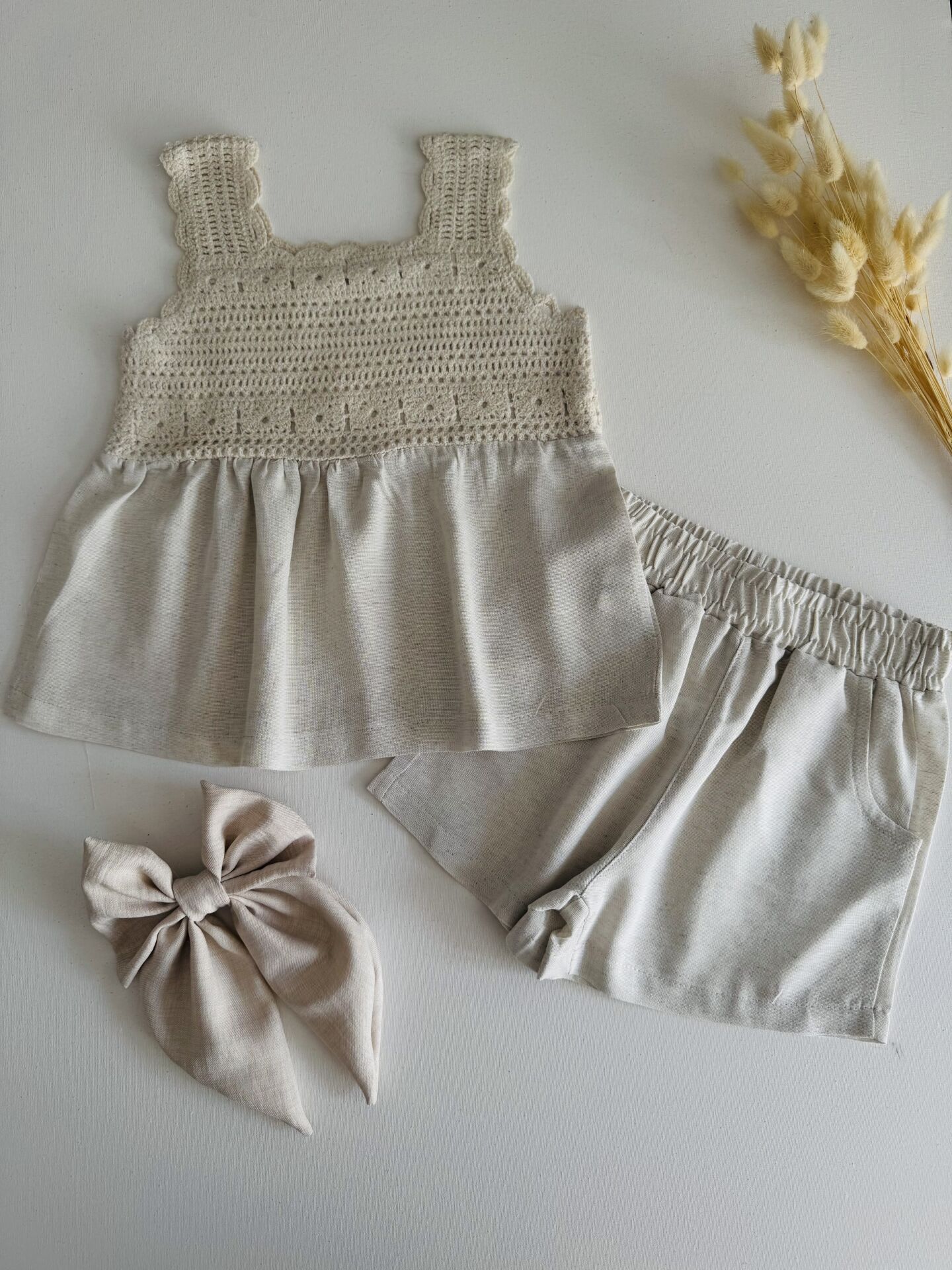 Ürün Bilgisi : Pamuklu keten kumaş üzeri örgülü şahane şortlu takım