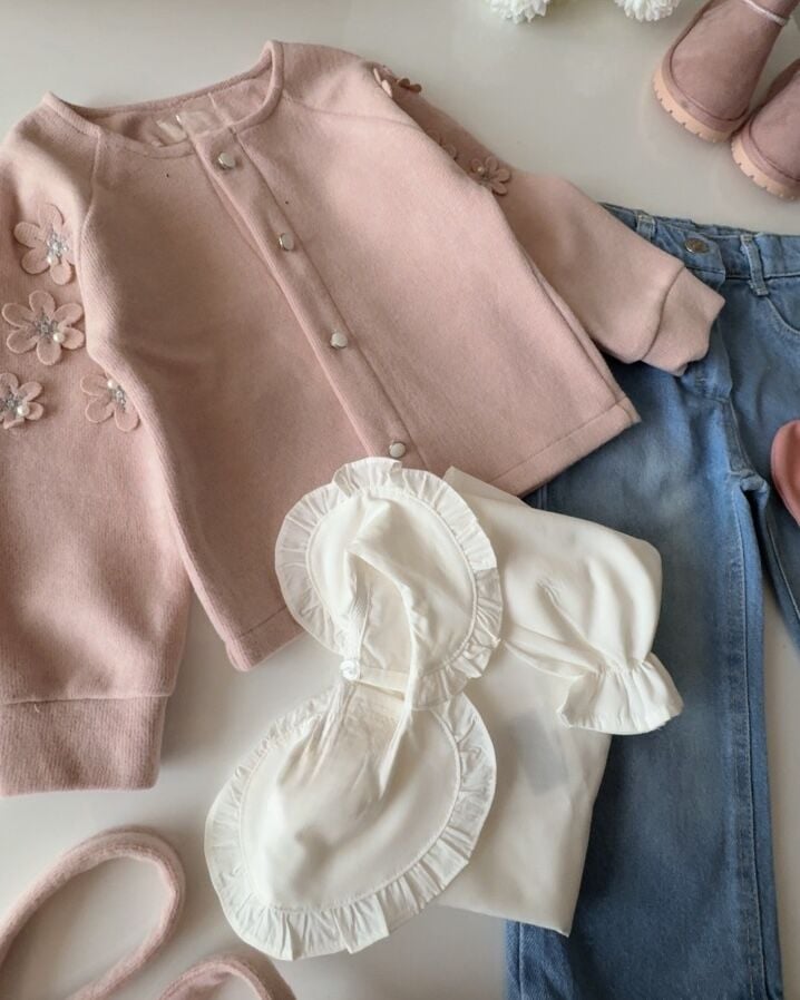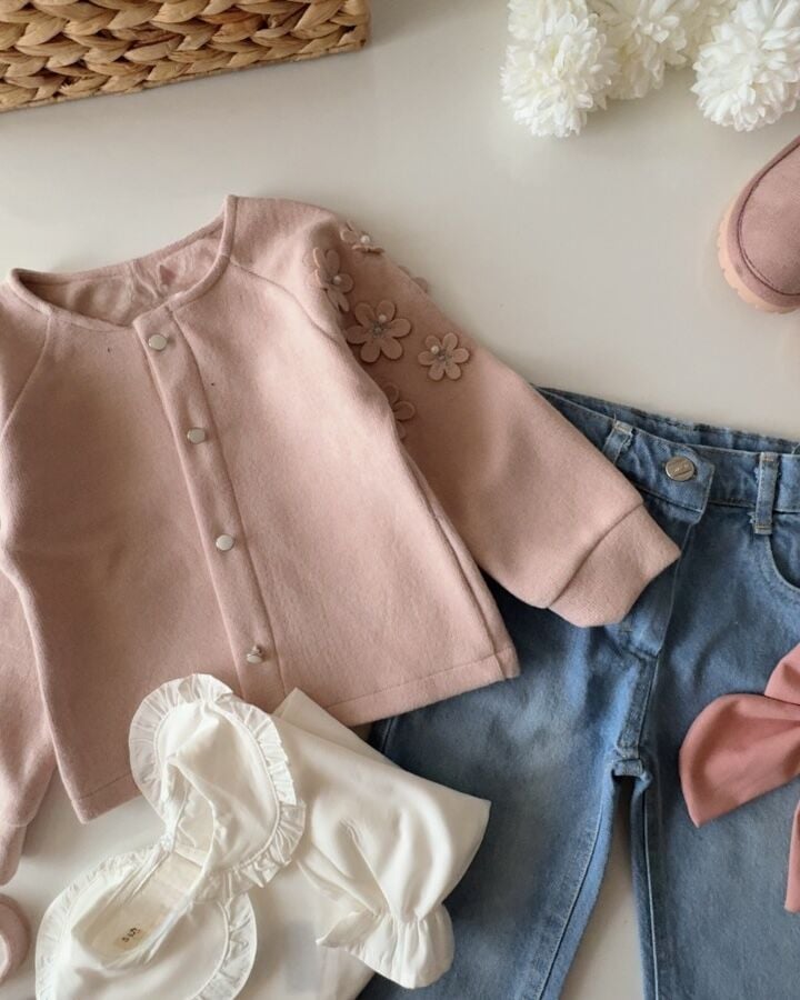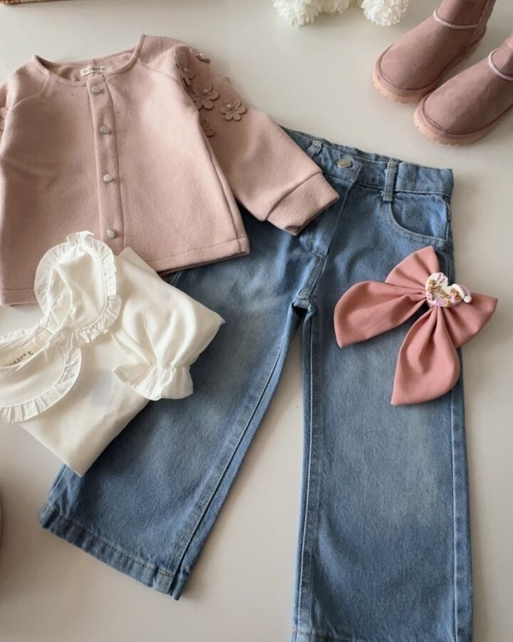 Papatya Aplikeli Denim Pantolonlu 4'lü Set - Gül Kurusu