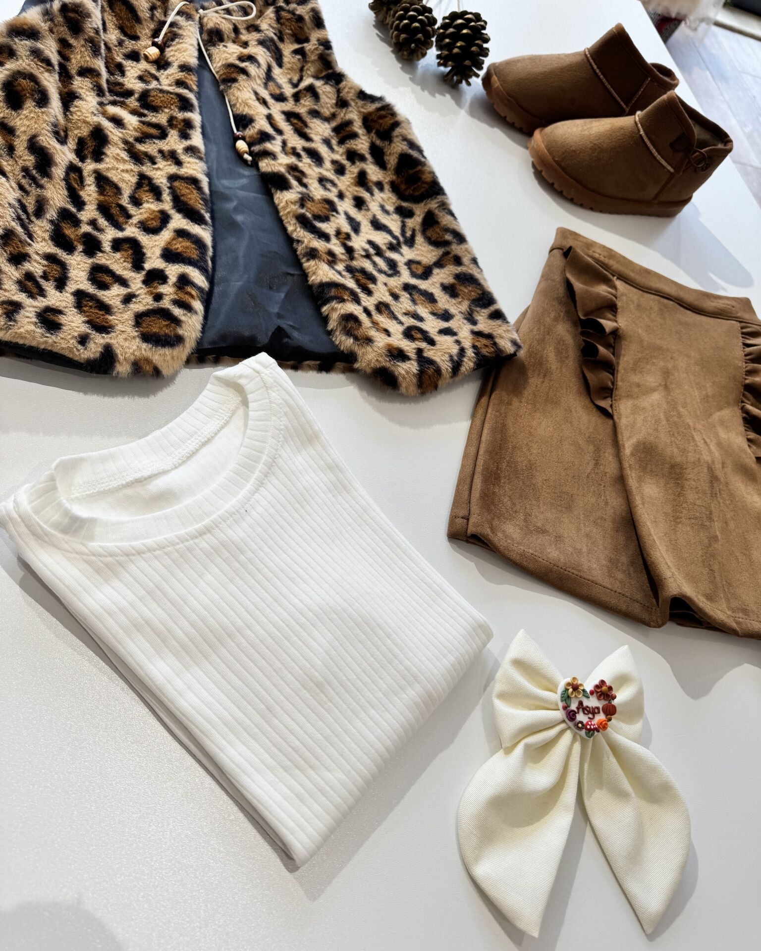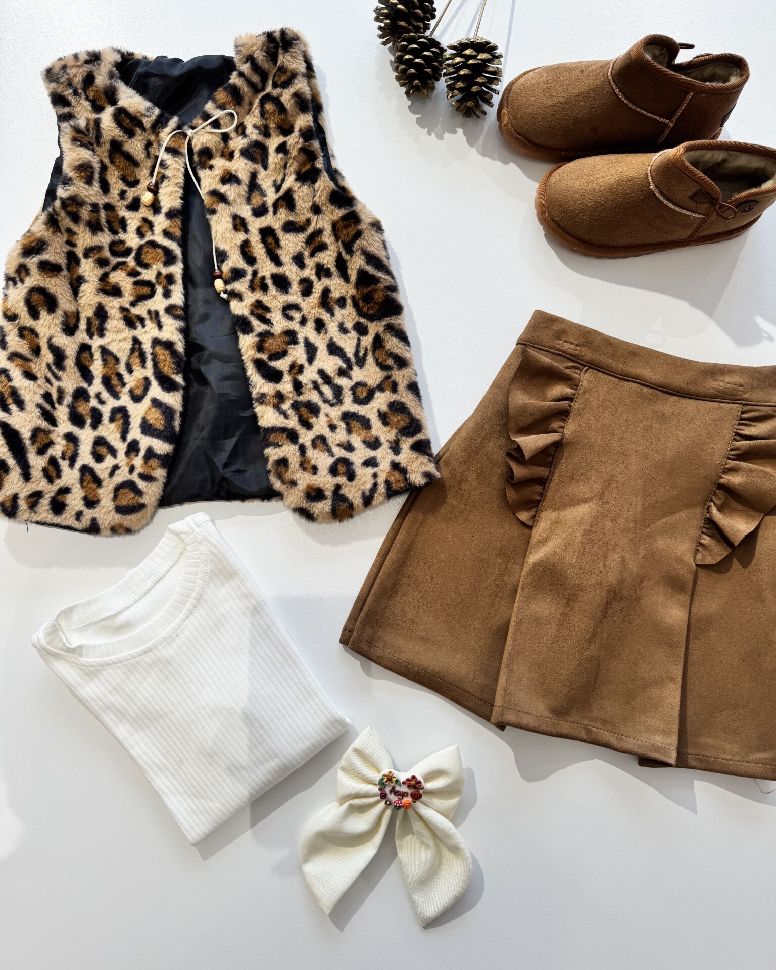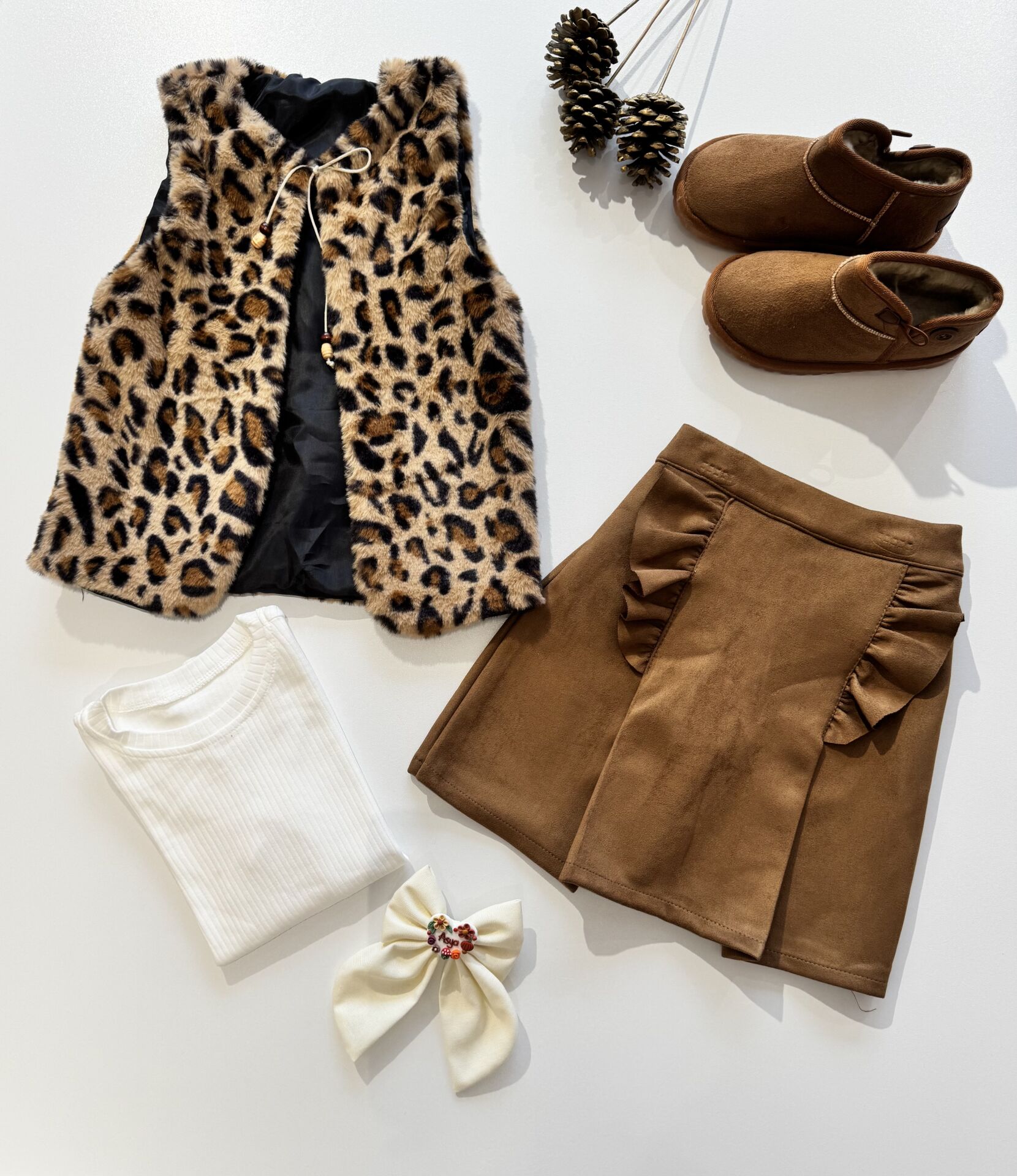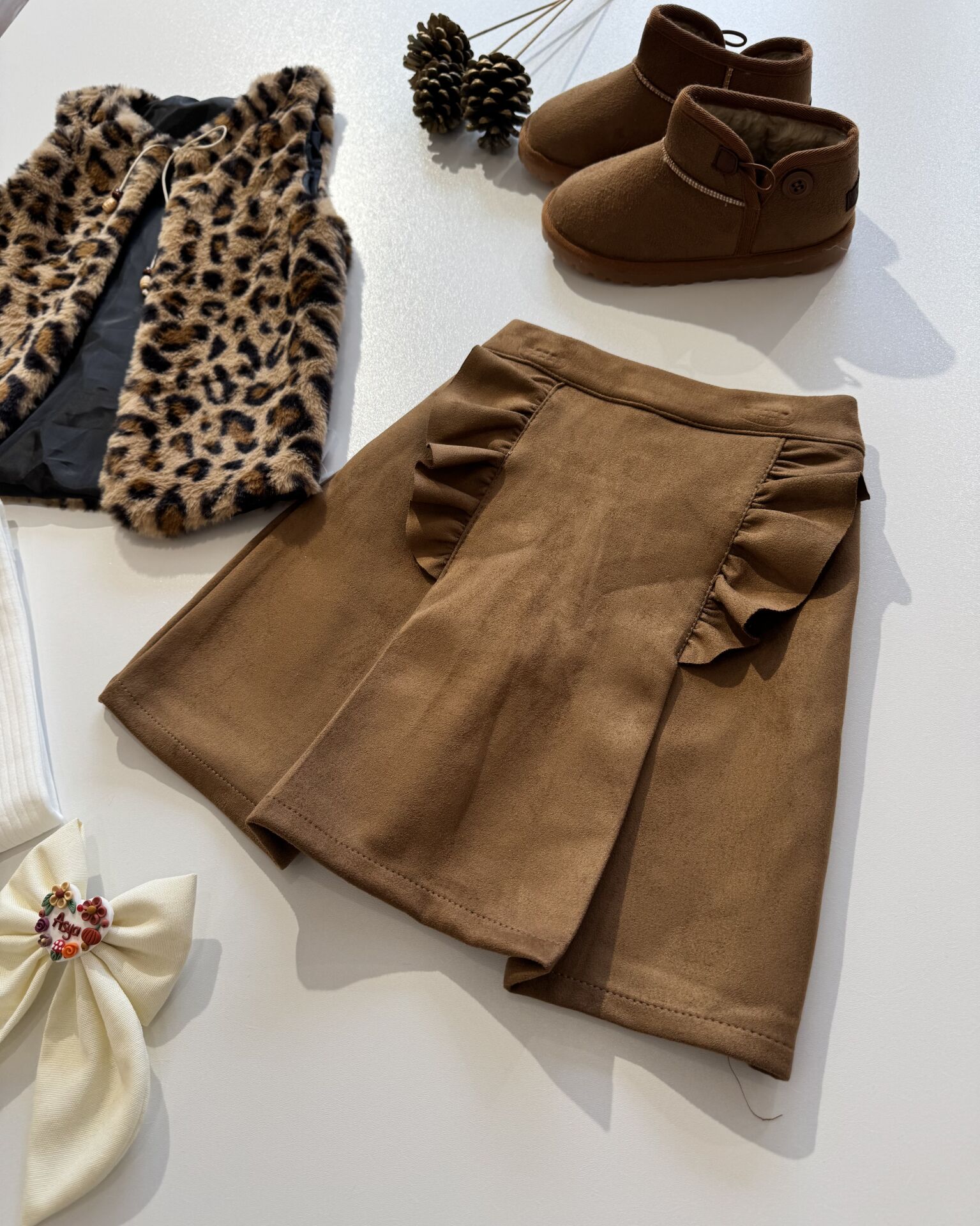 ‣ Peluş yelek, nubuk şort etek ve pamuklu iç badi