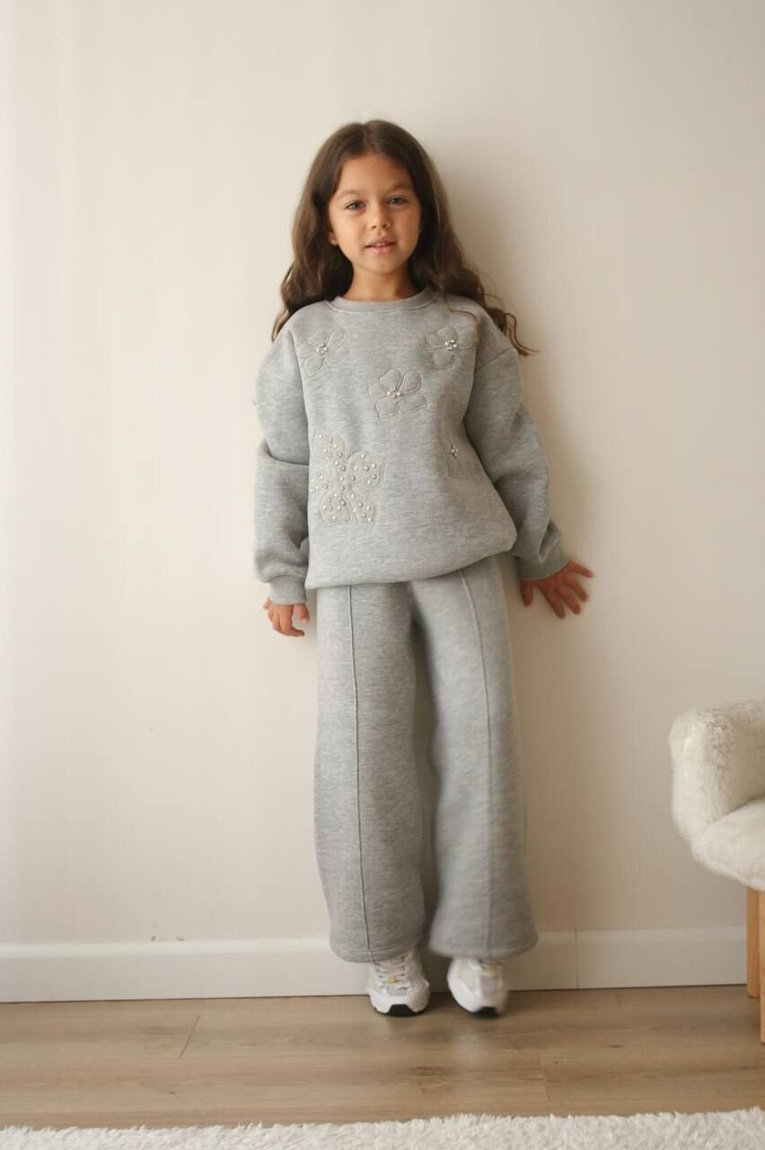 Şardonlu Çiçek Nakışlı Defne Takım - Gri