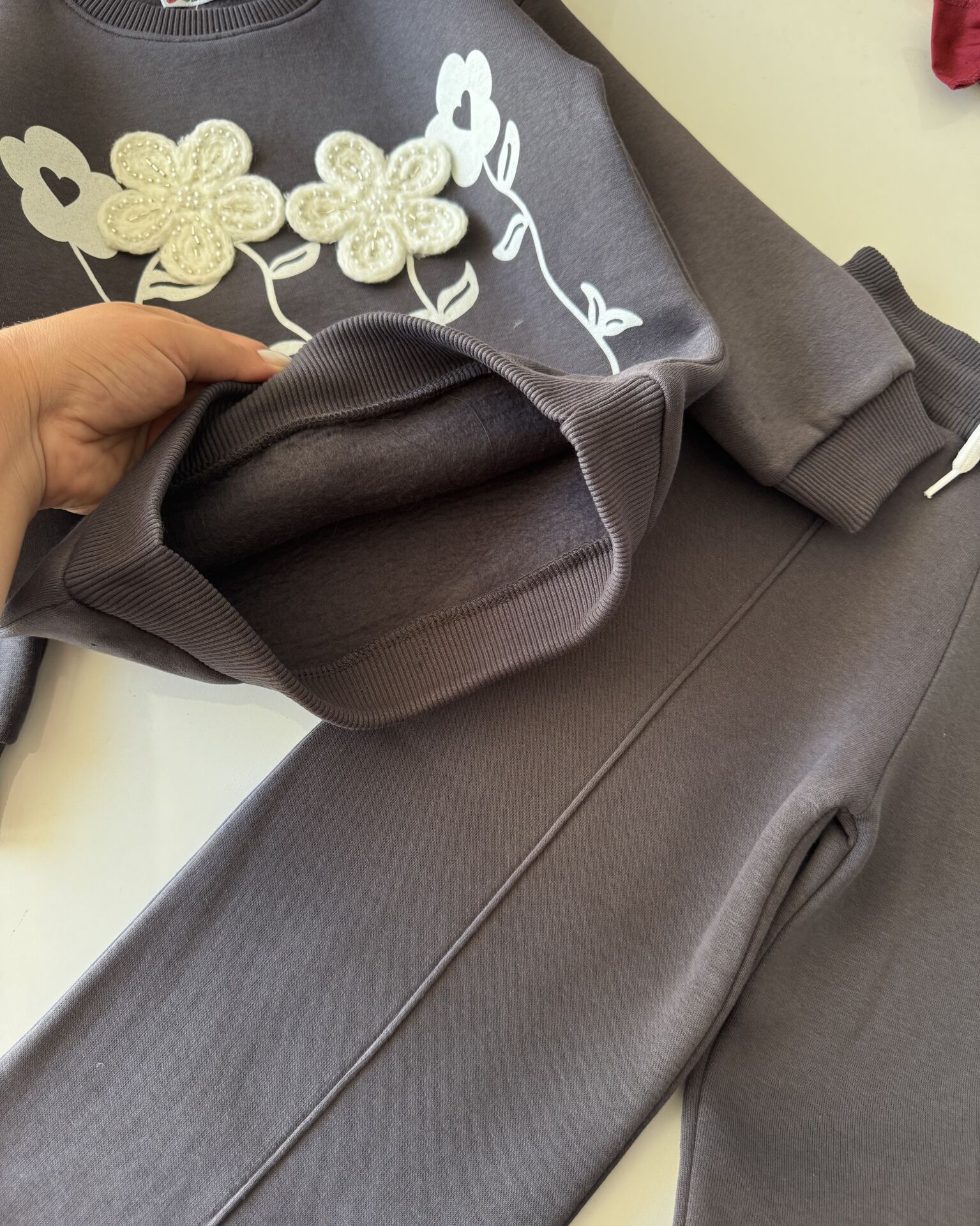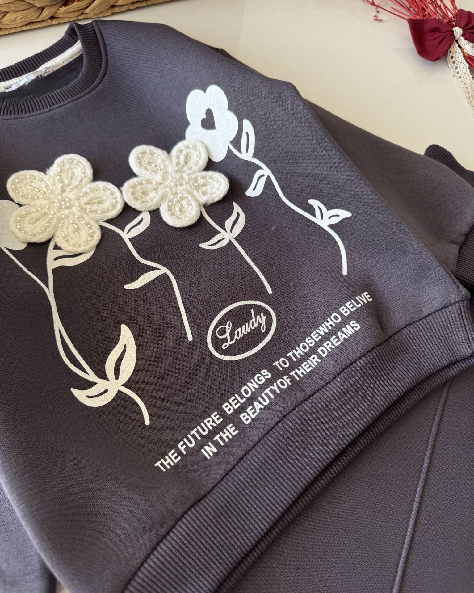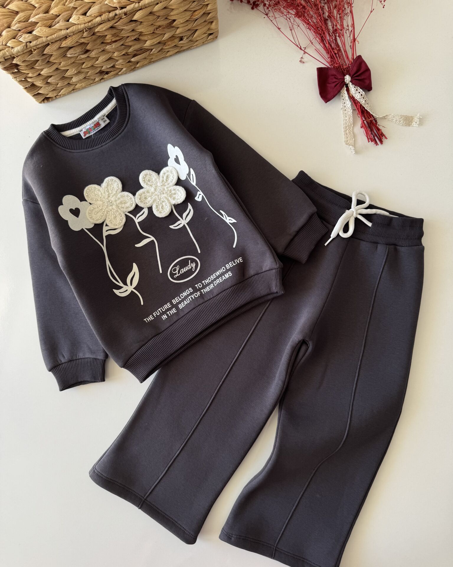 Şardonlu Çiçek Örme Bol Paça Defne Takım - Füme