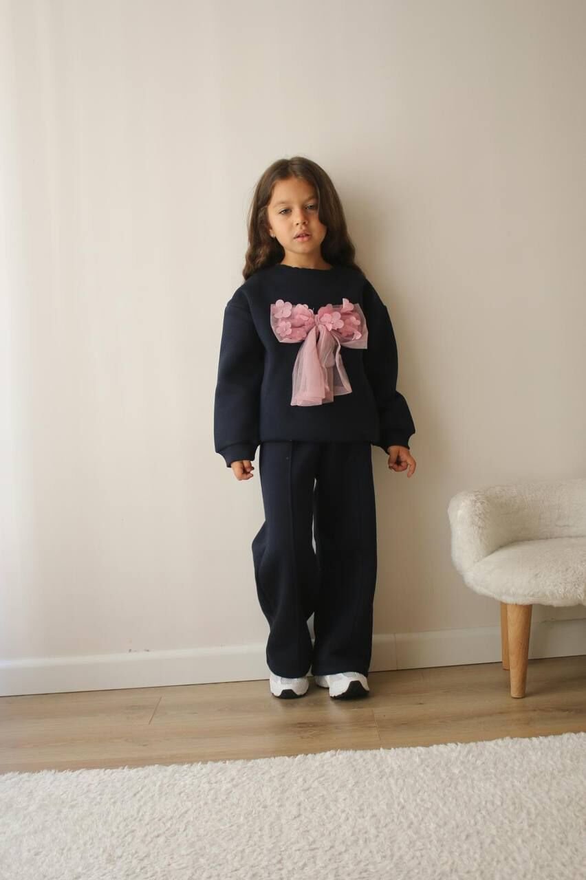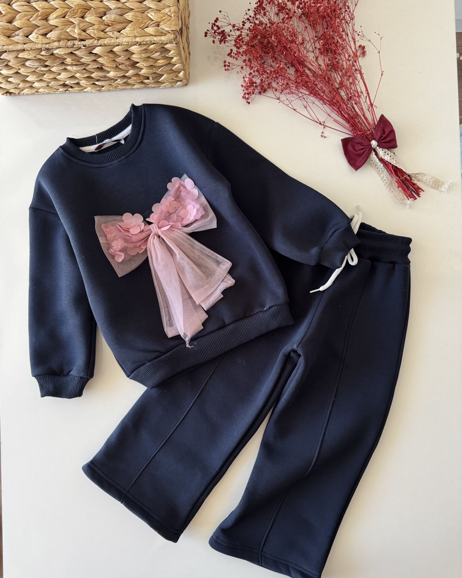 Şardonlu Tül Fiyonk Aplikeli İpek Takım - Lacivert