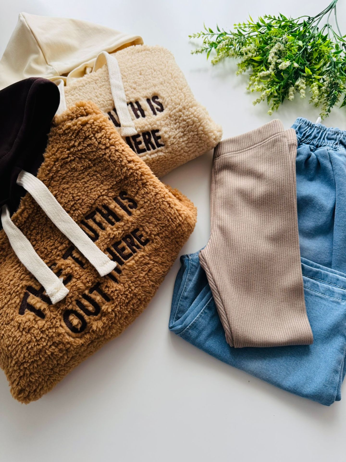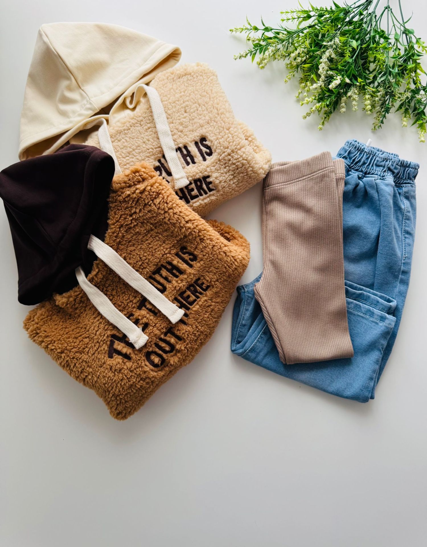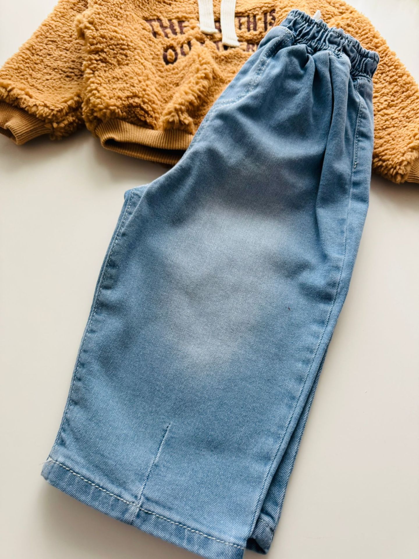Ürün Bilgisi : Üst peluş sloganlı, alt beli lastikli balon jean