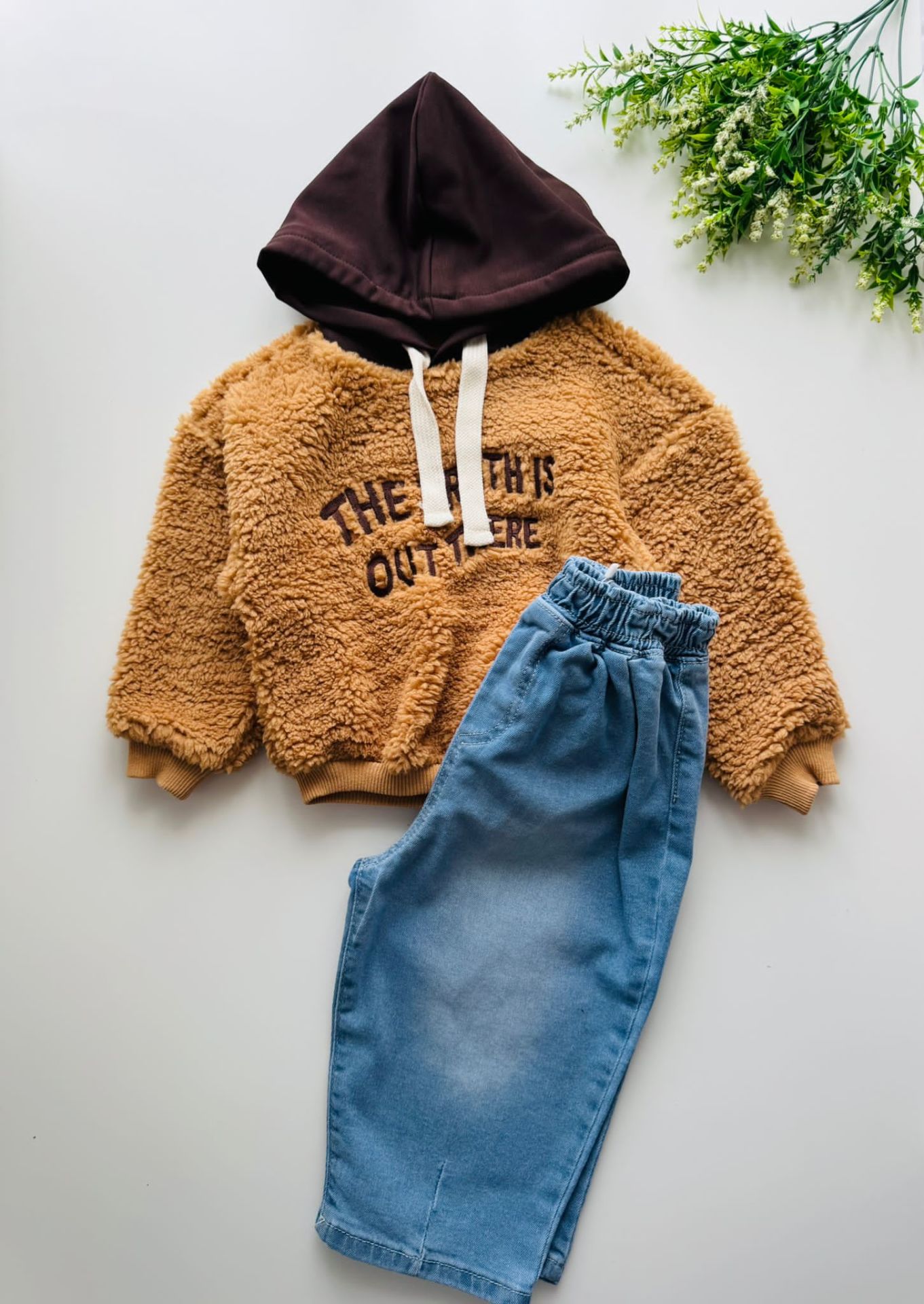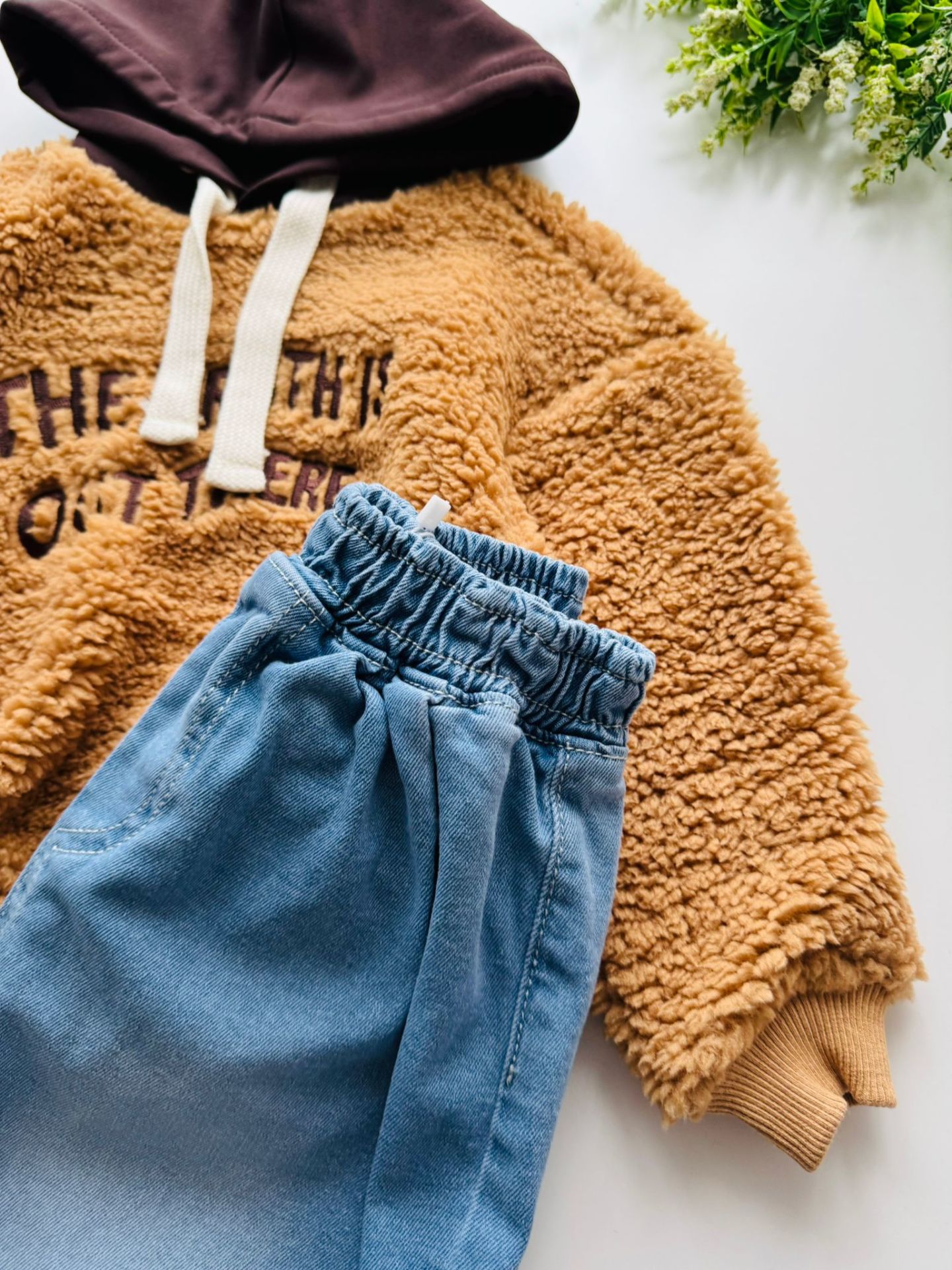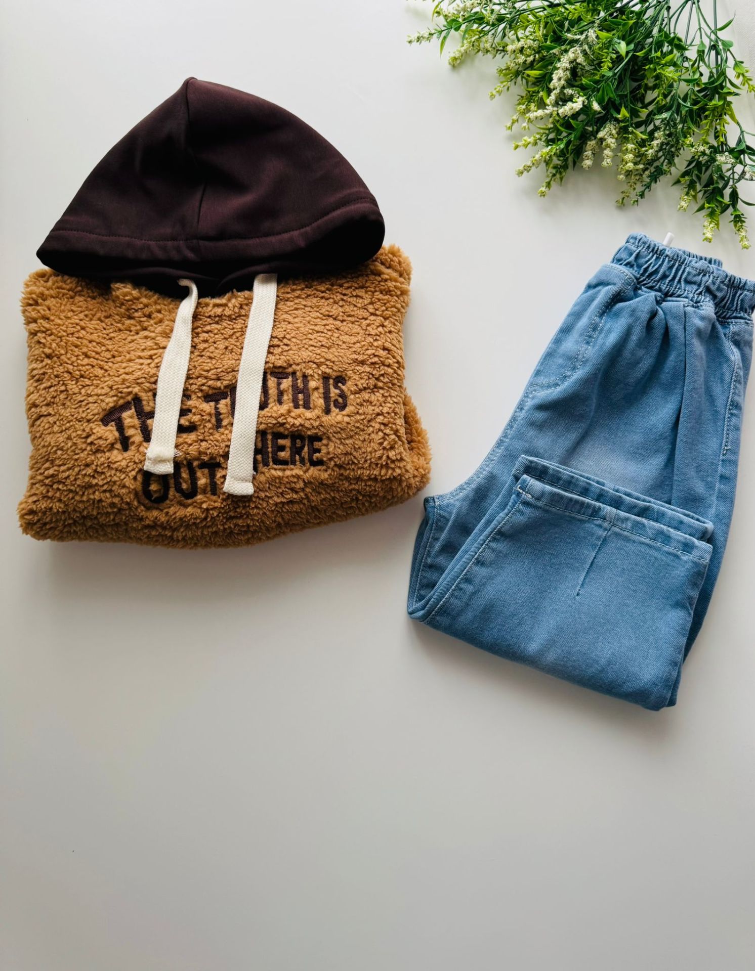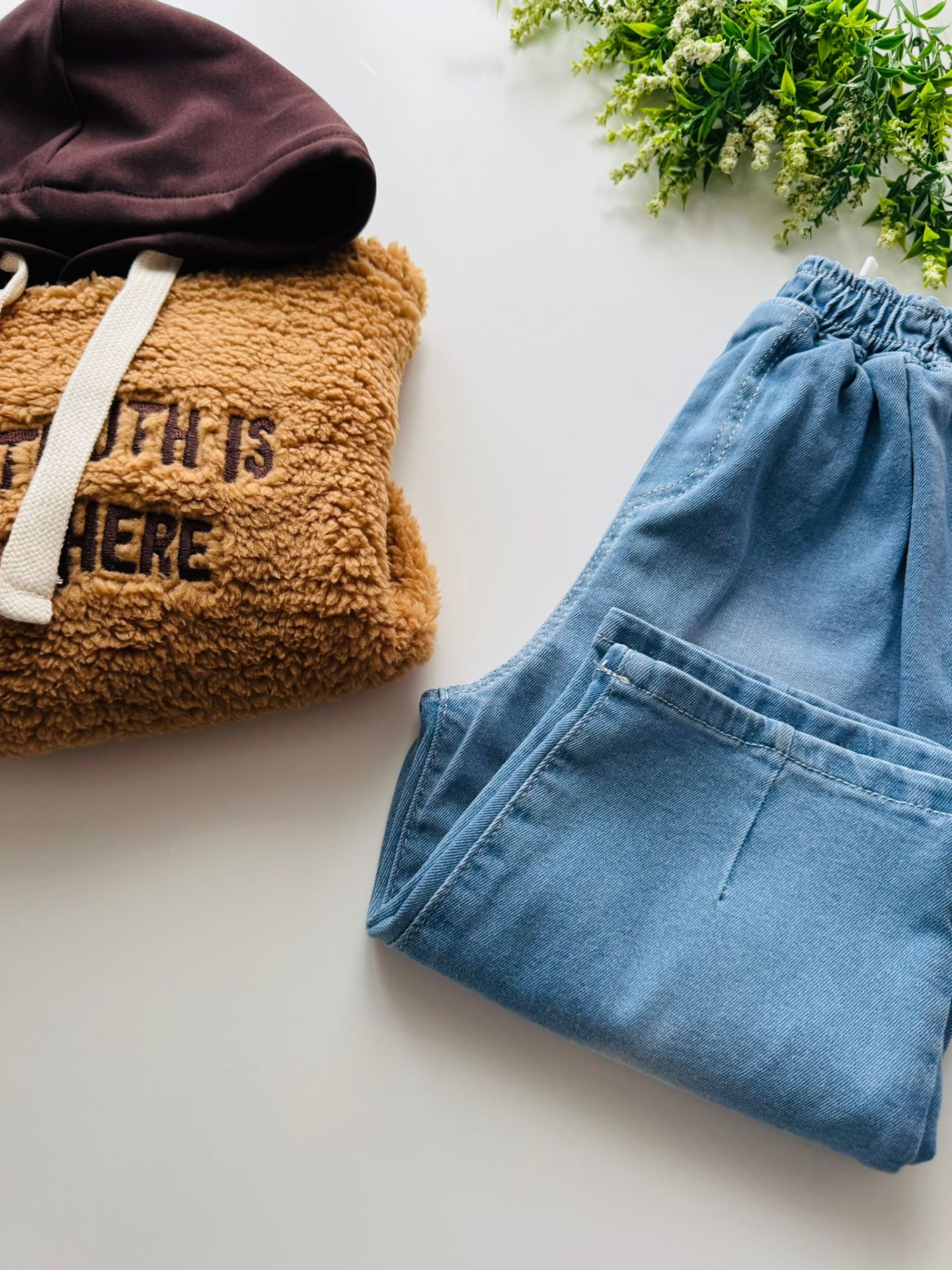 Sloganlı Peluş Balon Jean Takım - Kahve Mavi