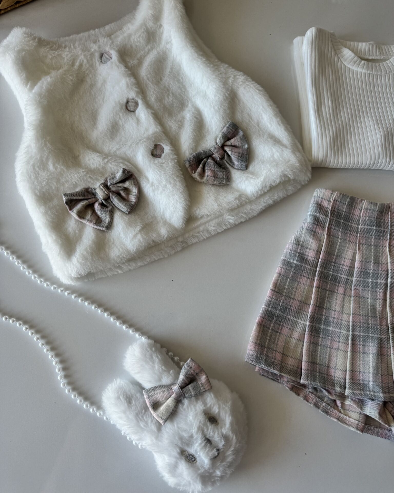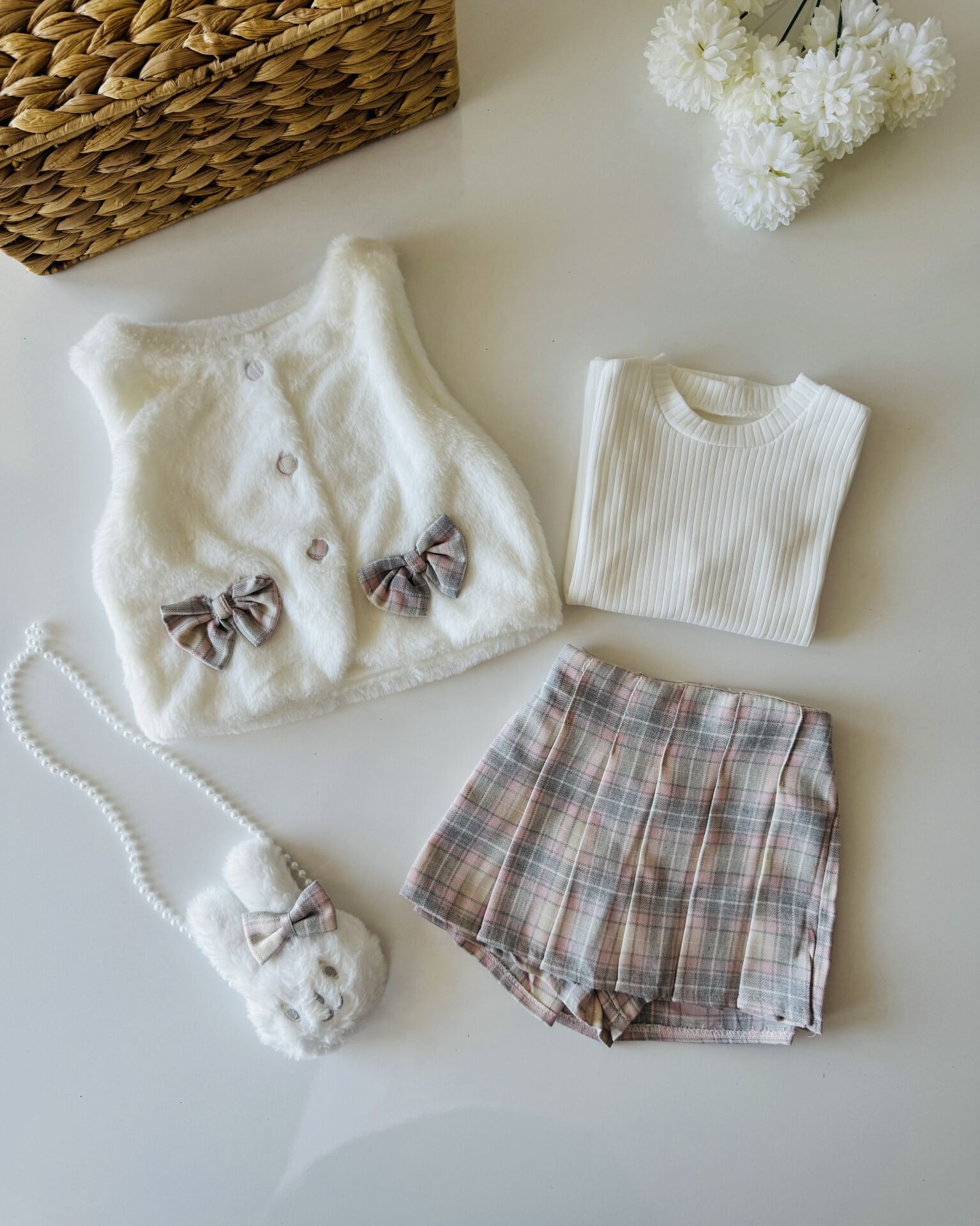 Ürünün Set İçeriği ; Tavşanlı çanta, kareli şort etek, ribana kumaş bluz ve peluş tavşan aplikeli yelek.
