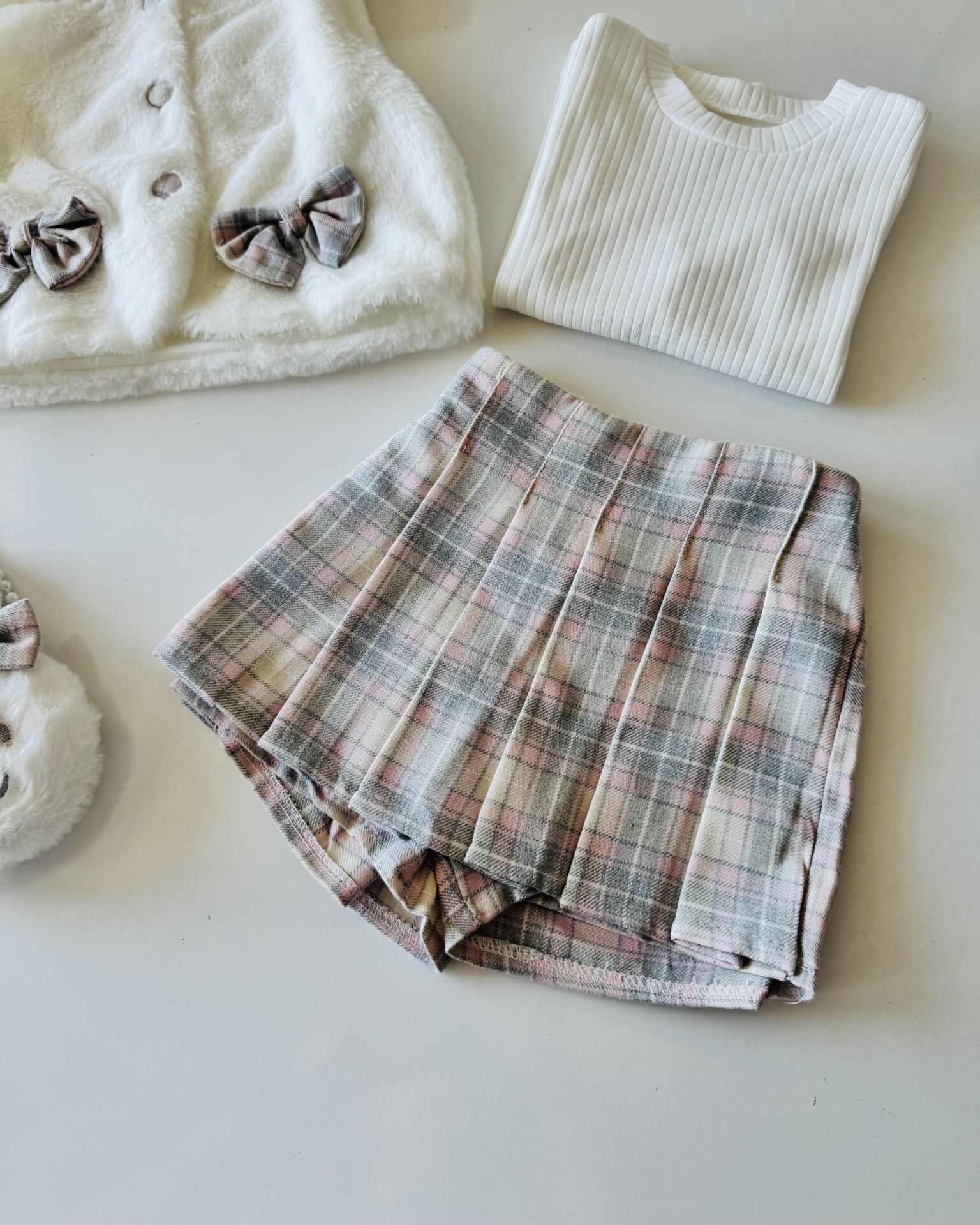 ‣ Peluş yelek, ribana kumaş iç badisi, dokuma kumaş kareli şort etek