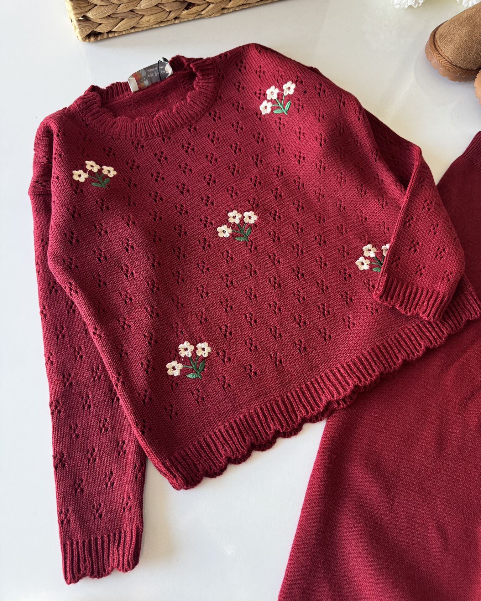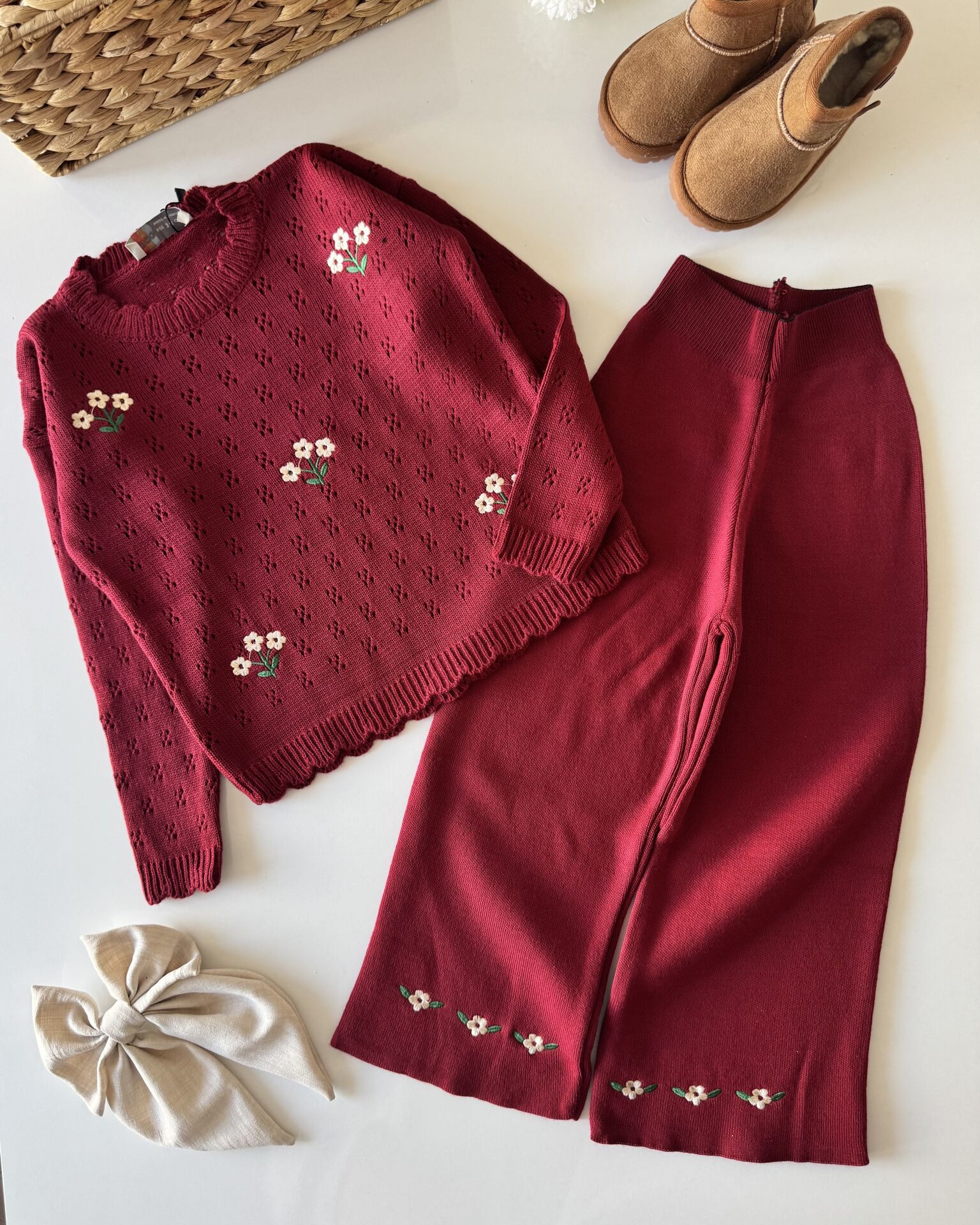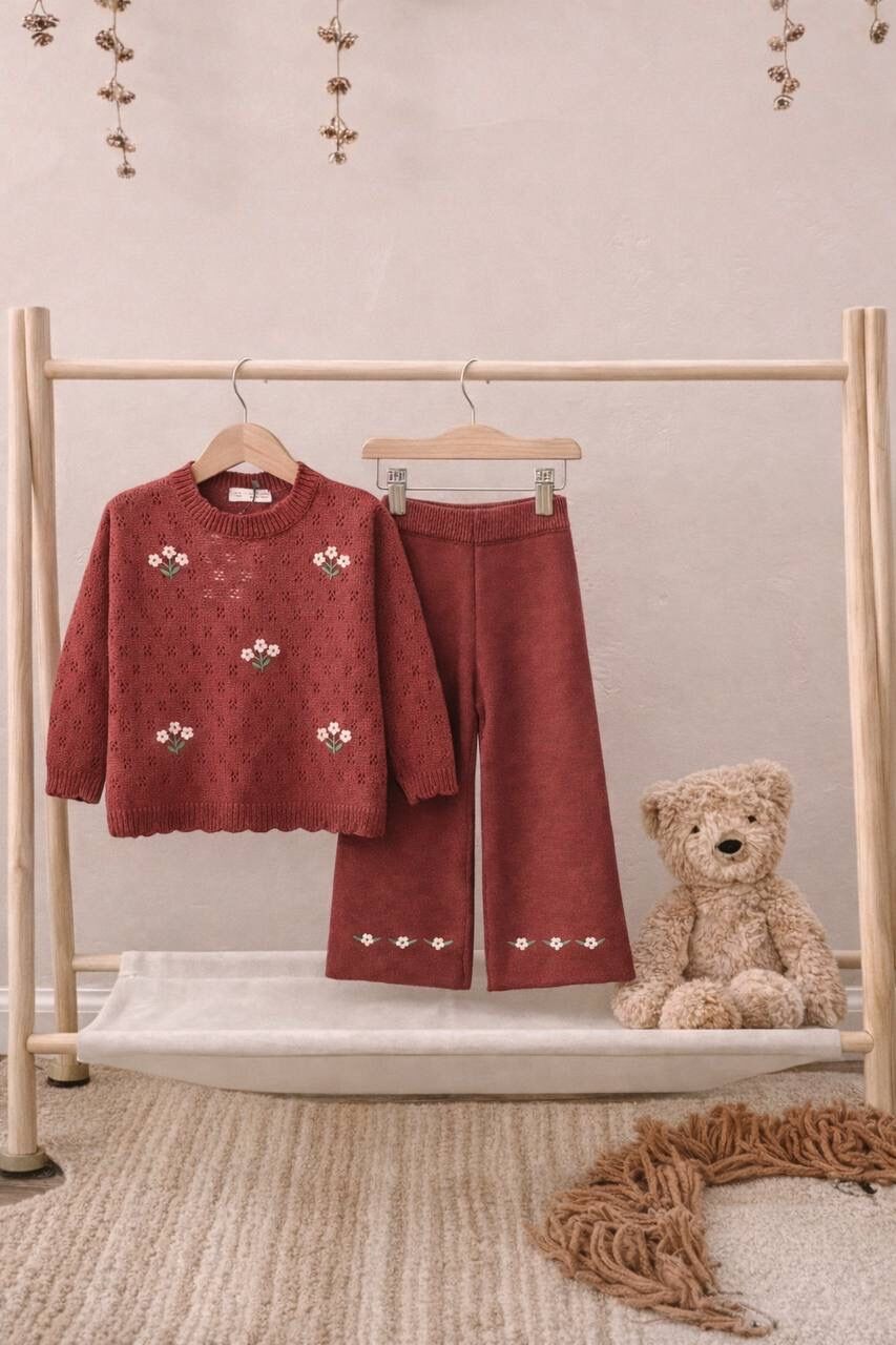 Triko Çiçek Nakışlı Takım - Bordo