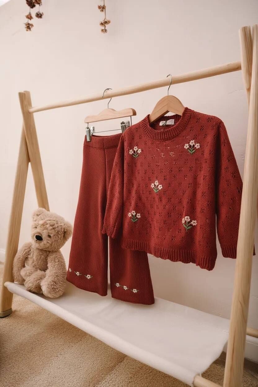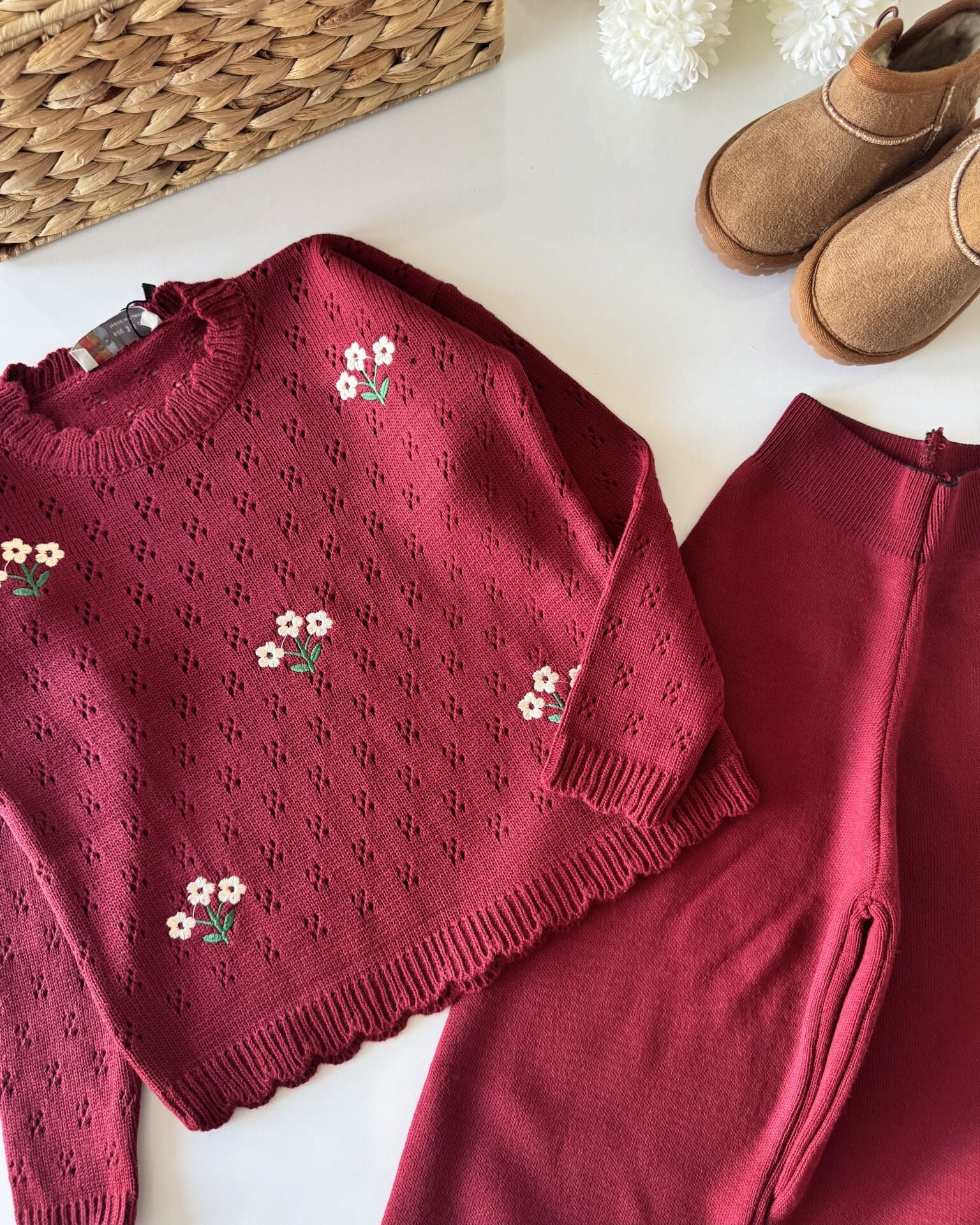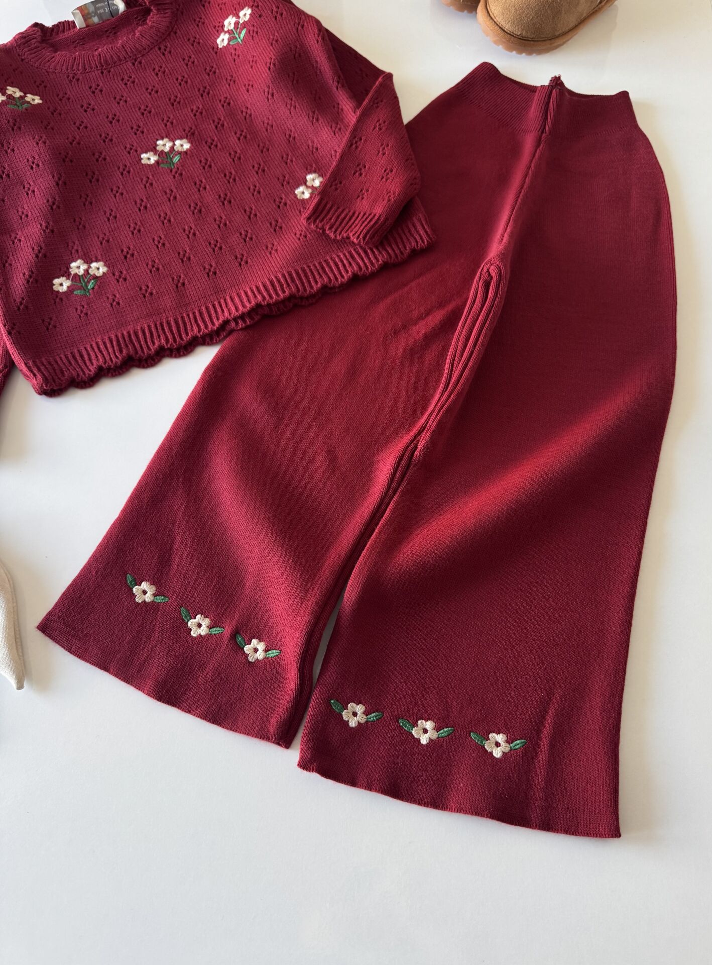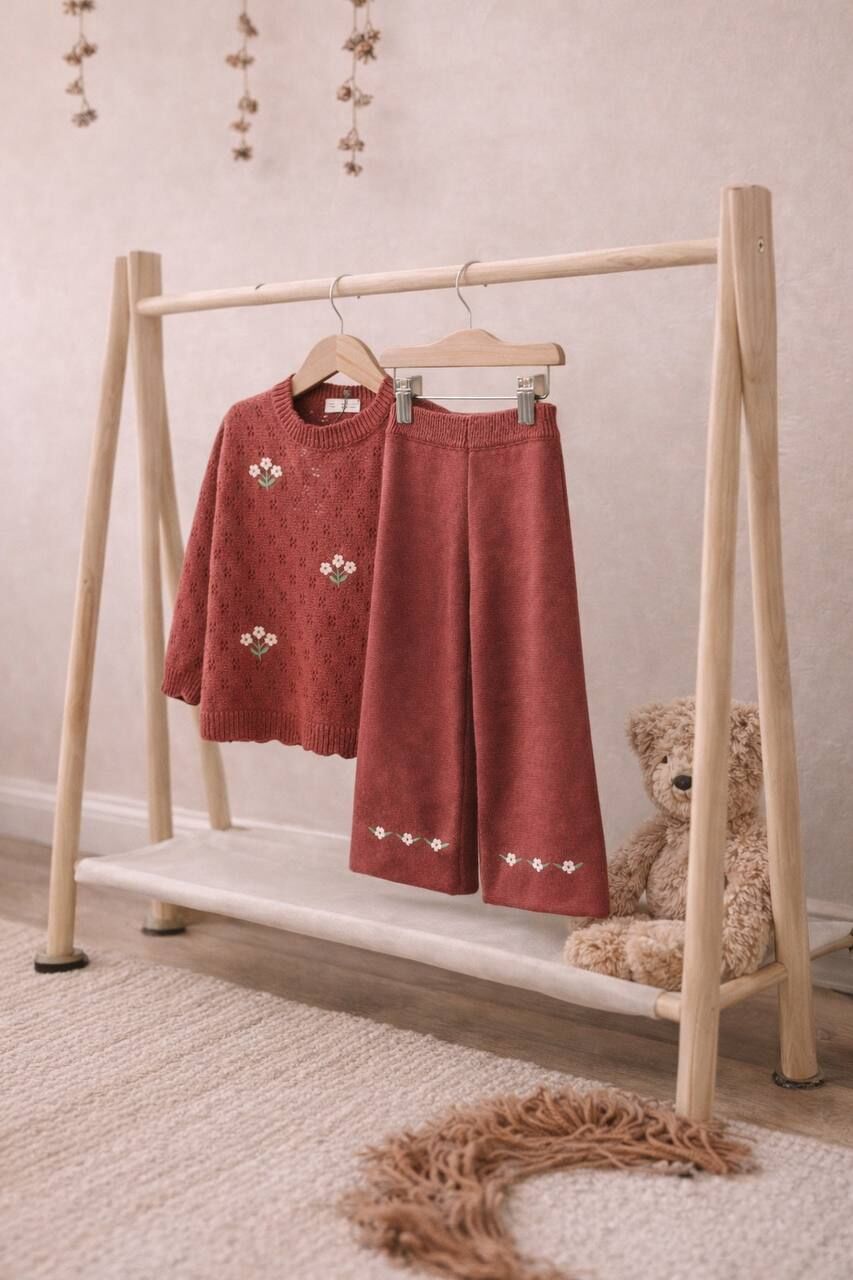 Triko Çiçek Nakışlı Takım - Bordo