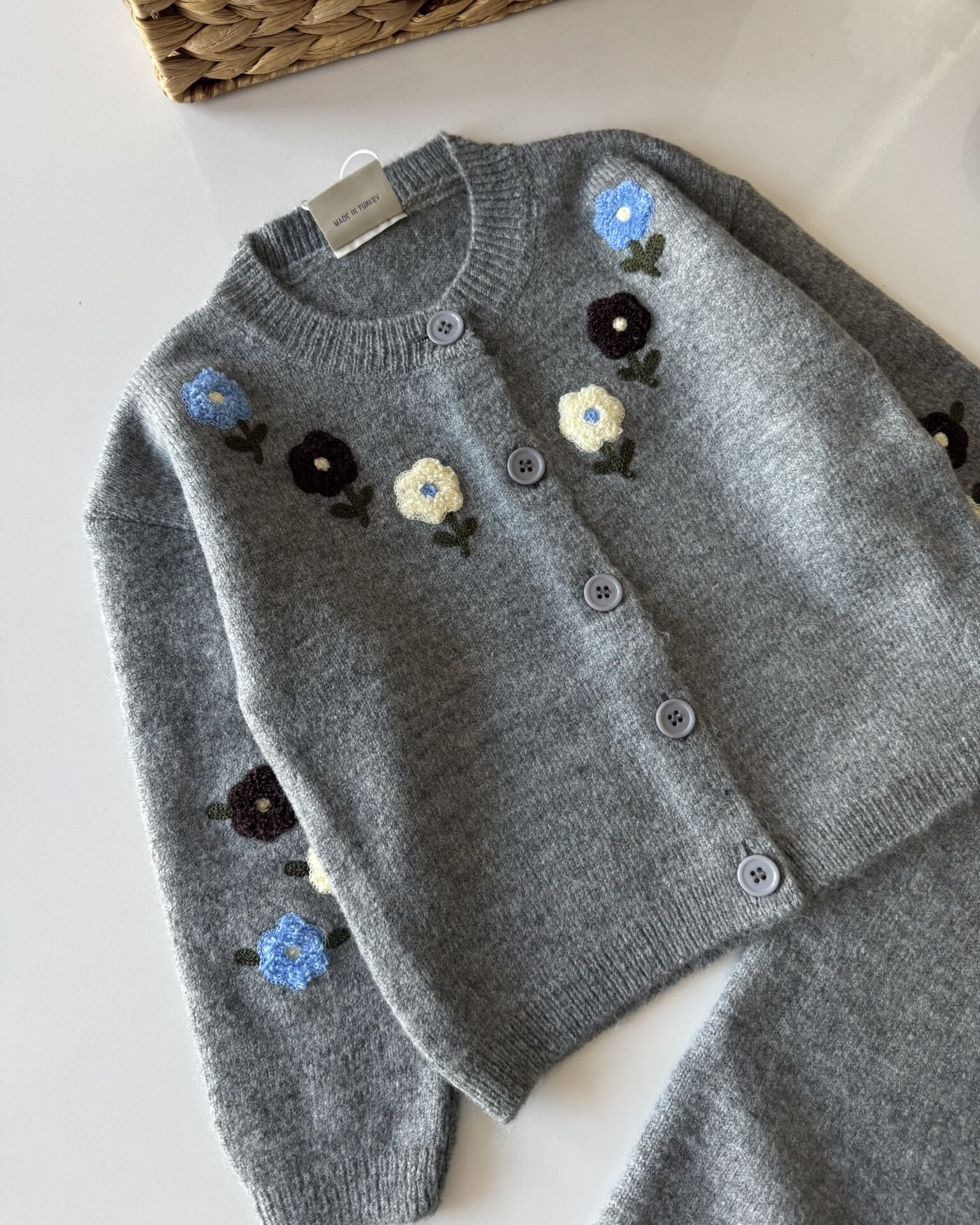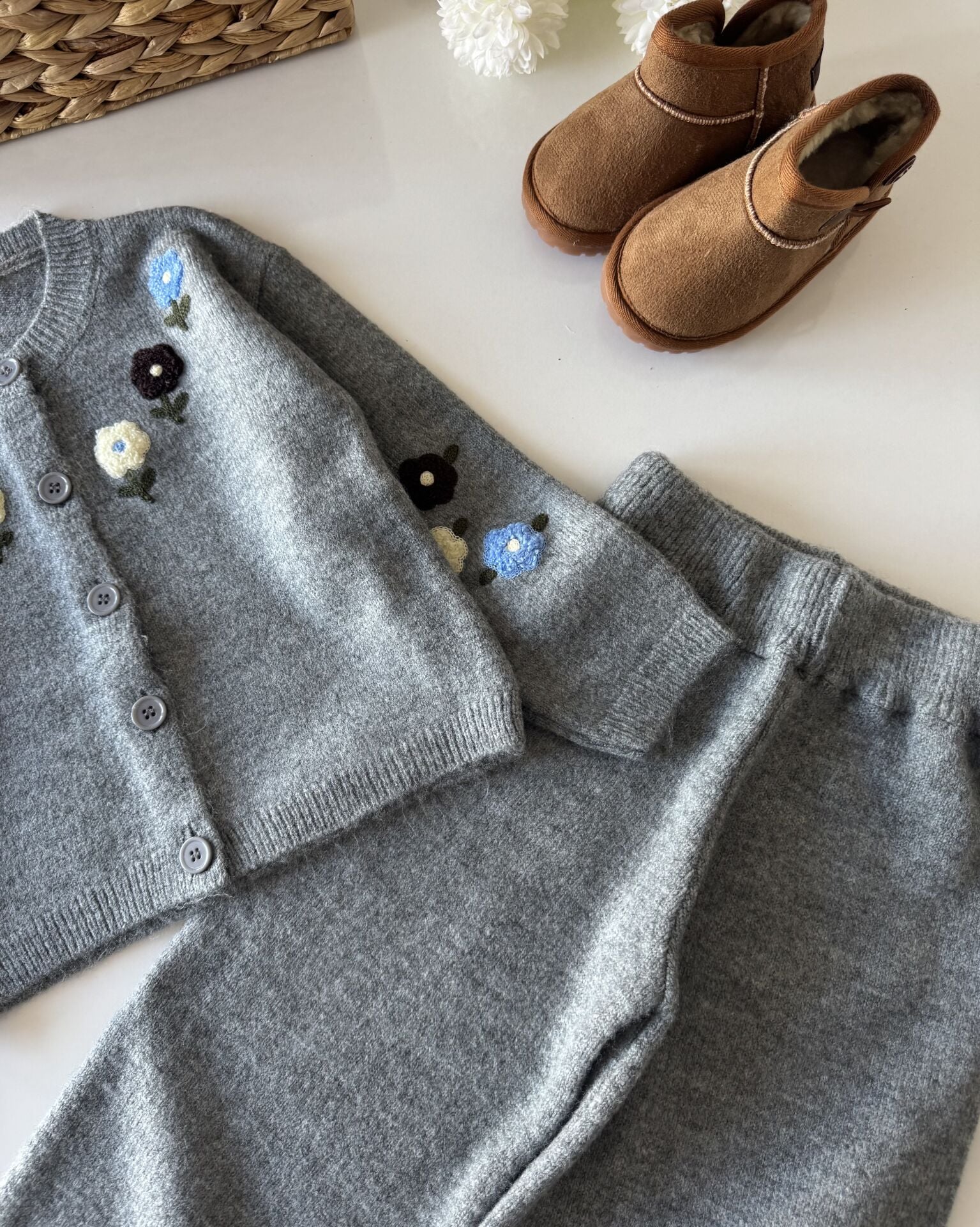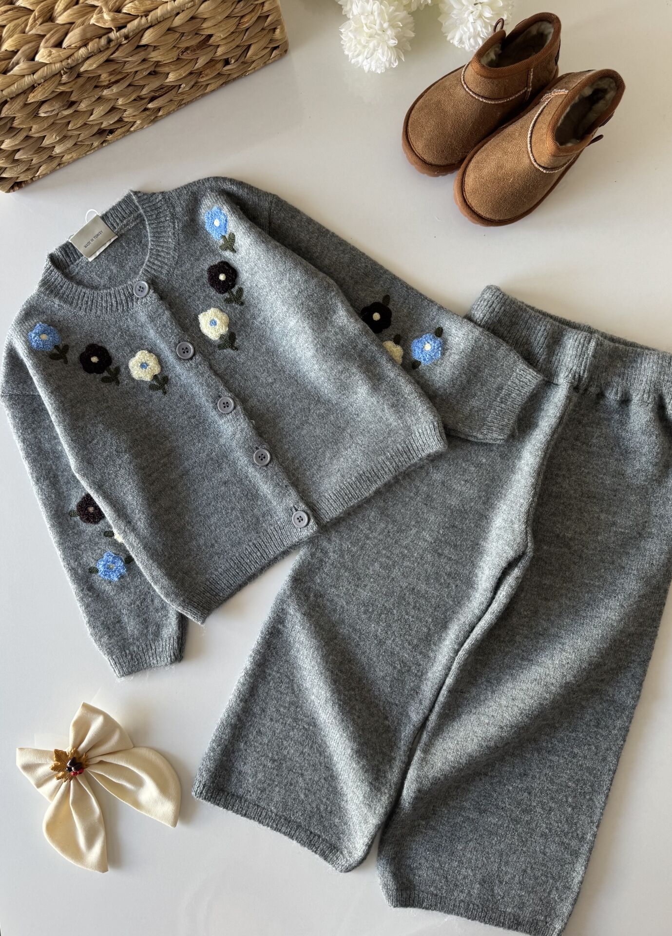 Triko Çiçek Punch Nakışlı Takım - Gri